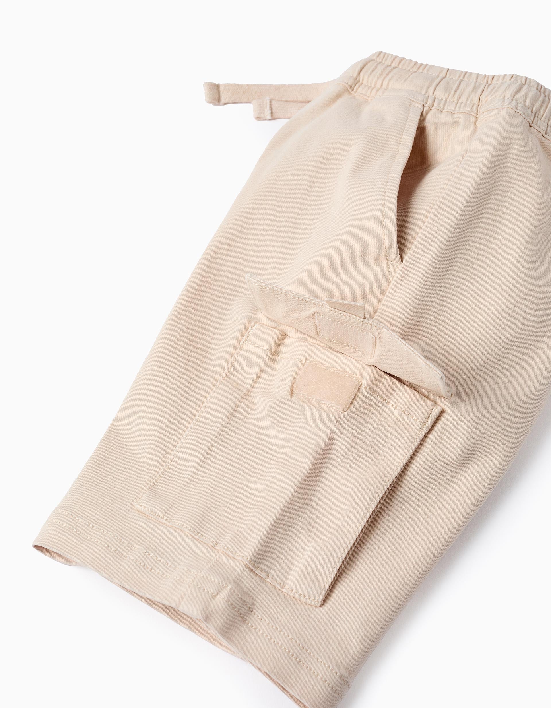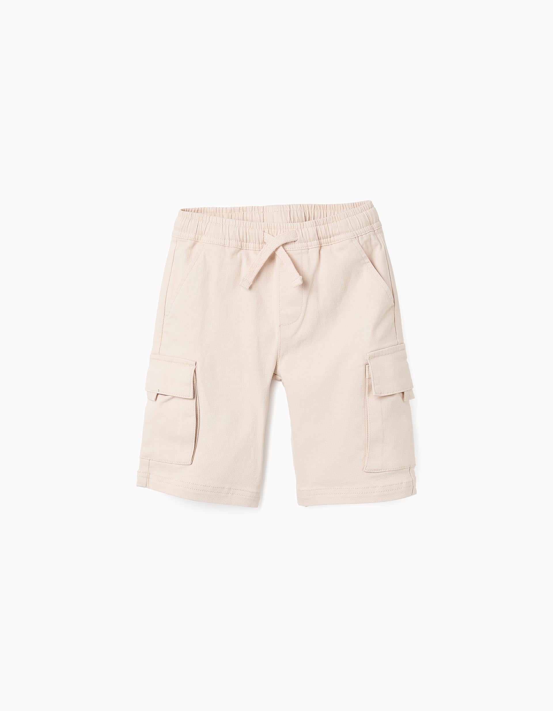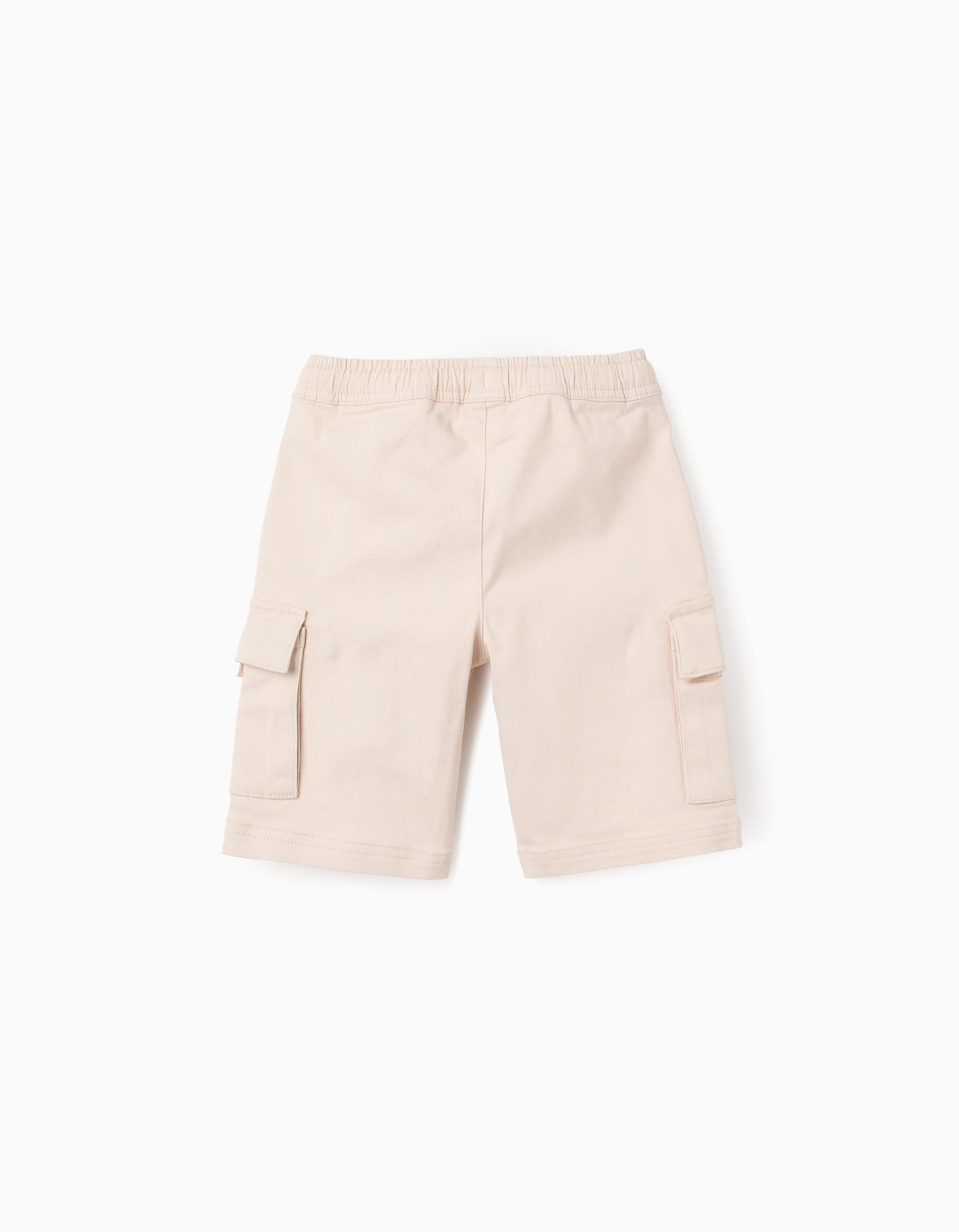 Bermuda beige para niño, en algodón con un toque de elasticidad para mayor comodidad y libertad de movimiento. Bolsillos laterales y bolsillos cargo. Cintura elástica y con cordón, ajustable en el interior con elásticos y botones.
