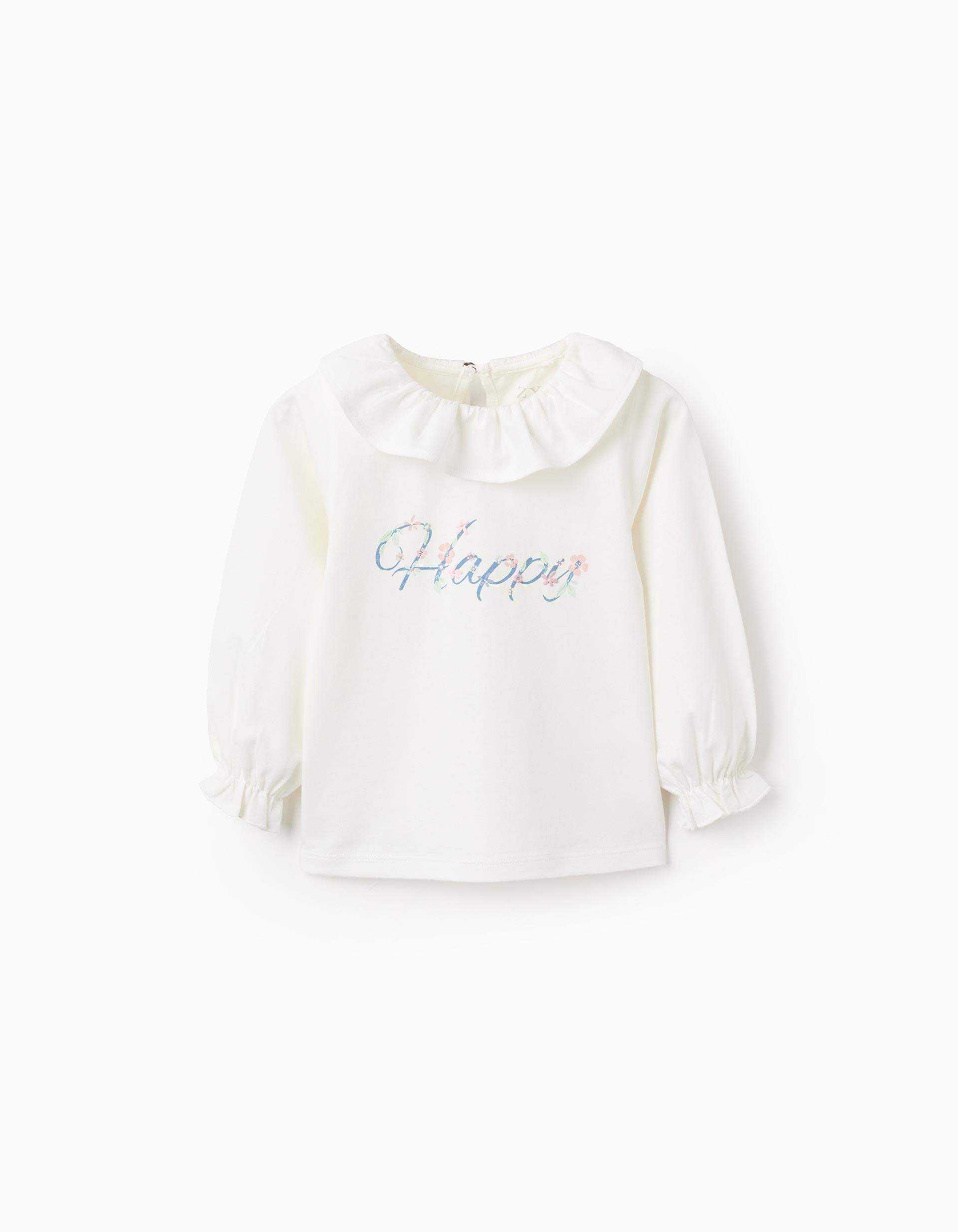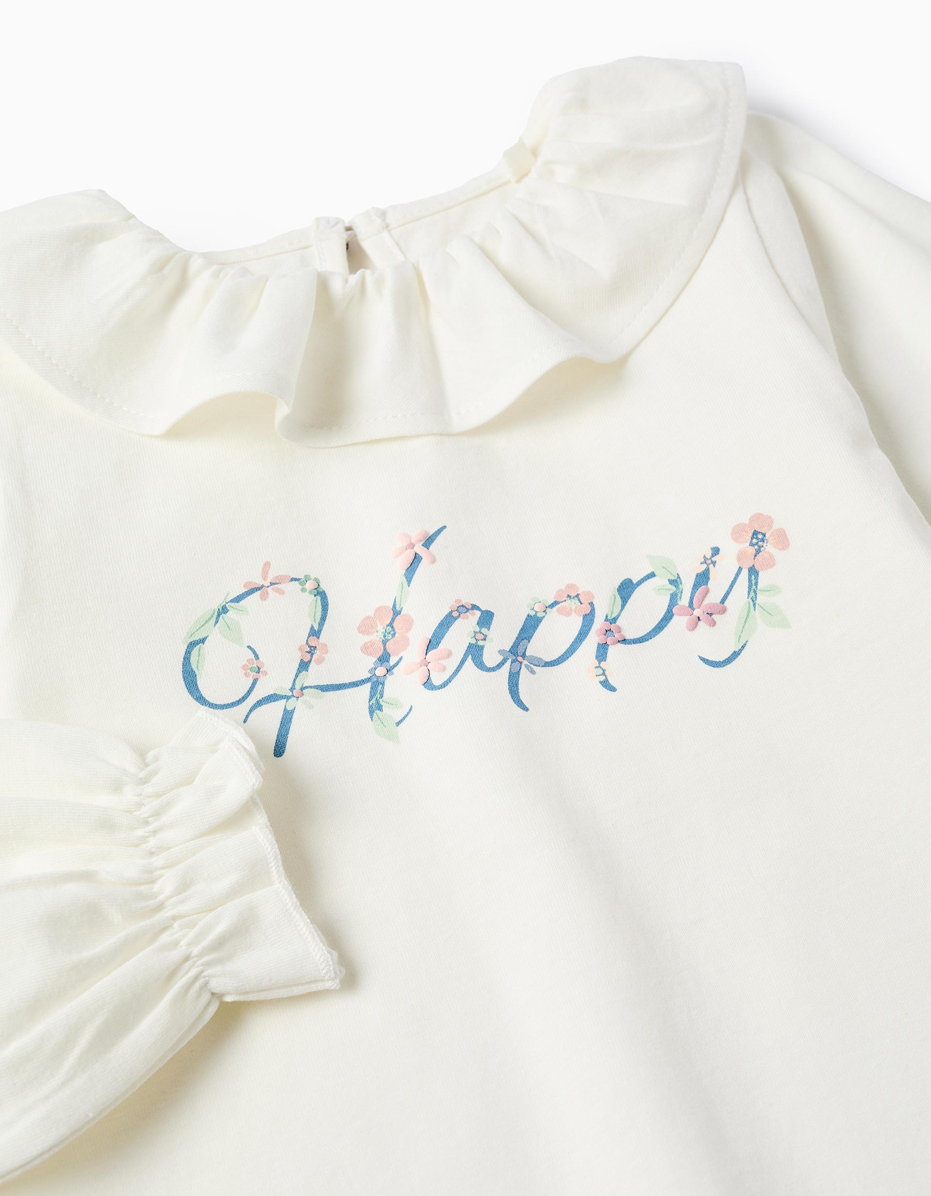 Camiseta de Manga Larga con Volantes para Bebé Niña 'Happy', Blanco