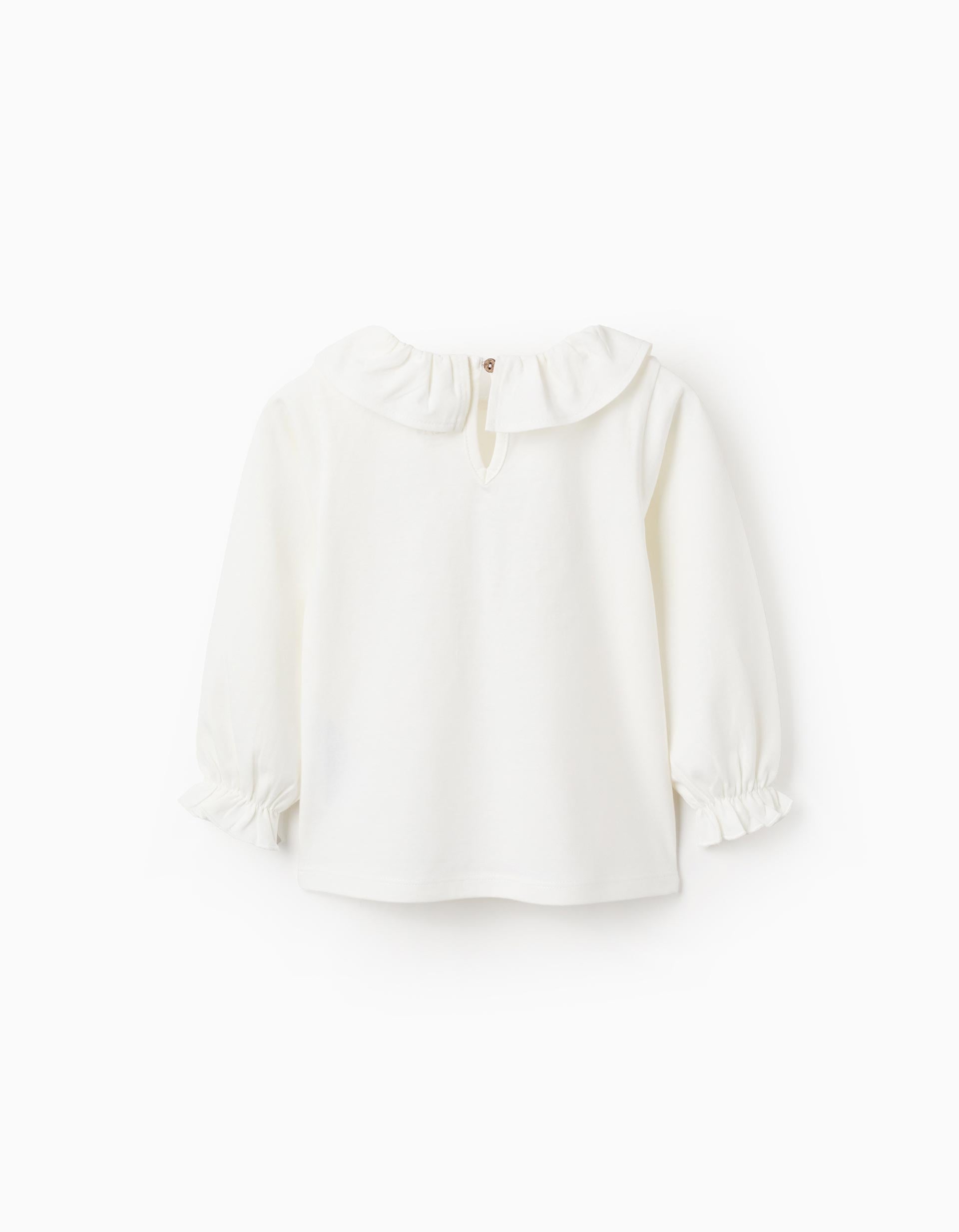 Camiseta blanca de manga larga para bebé niña, 100% algodón, con estampado frontal y detalles de flores en relieve. Cuello de volantes y puños elásticos y ondulados. Etiqueta interior estampada para no irritar la piel. Botón en la espalda para vestir fácilmente. Suave y elegante! We Care: artículo con certificado Oeko-Tex Standard 100, que garantiza la ausencia de sustancias nocivas o irritantes para la piel.