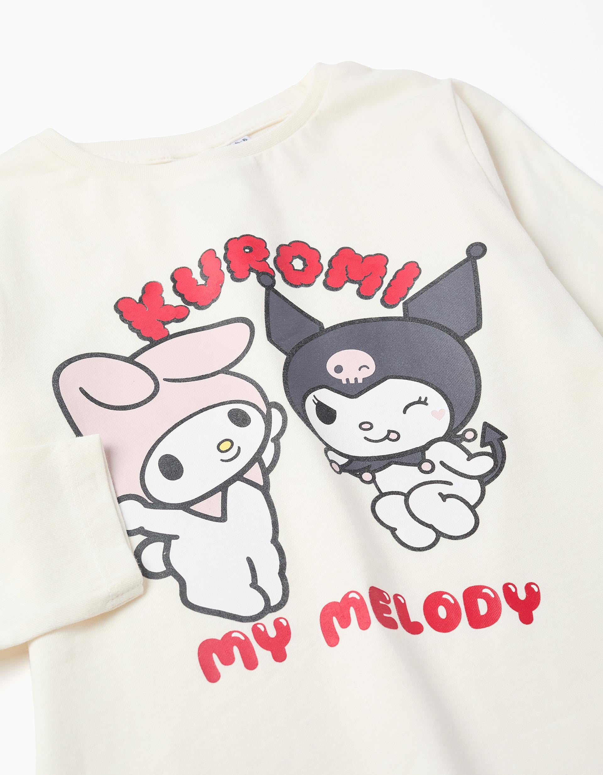 Camiseta blanca de manga larga para niña, en 100% algodón. Con estampado frontal de Kuromi y My Melody. Cuello acanalado. ¡Para las fans de estos personajes de Sanrio!