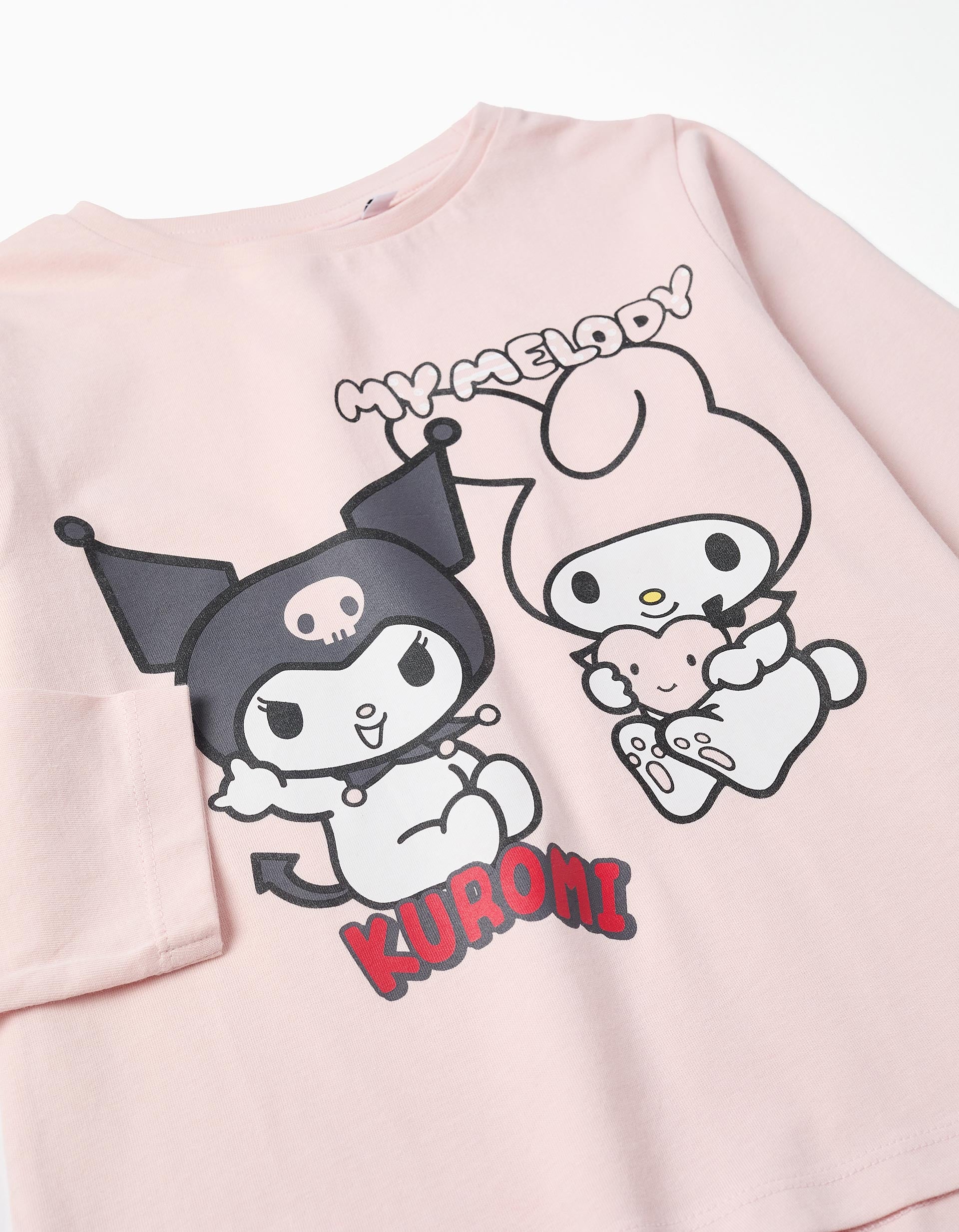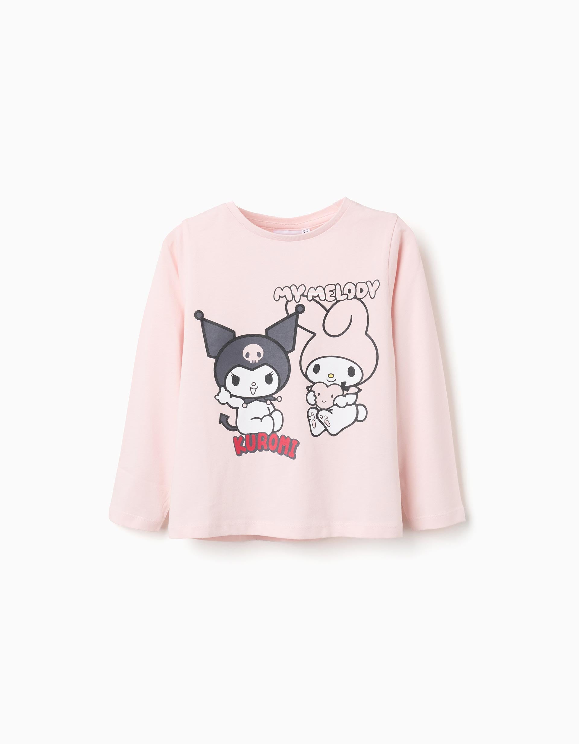 Camiseta de manga larga de color rosa claro para niña, en 100% algodón. Con estampado frontal de Kuromi y My Melody. Cuello acanalado. ¡Para las fans de estos personajes de Sanrio!