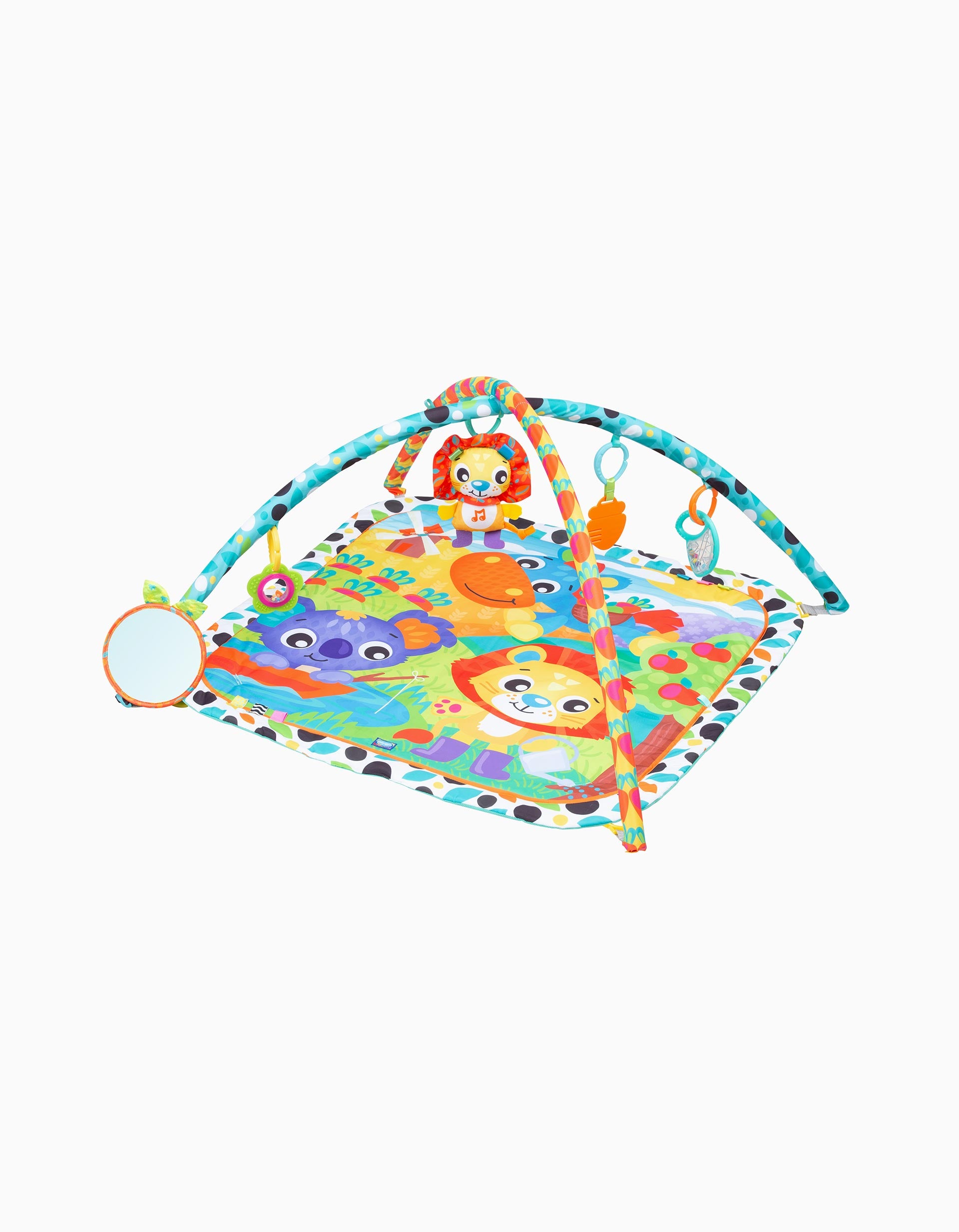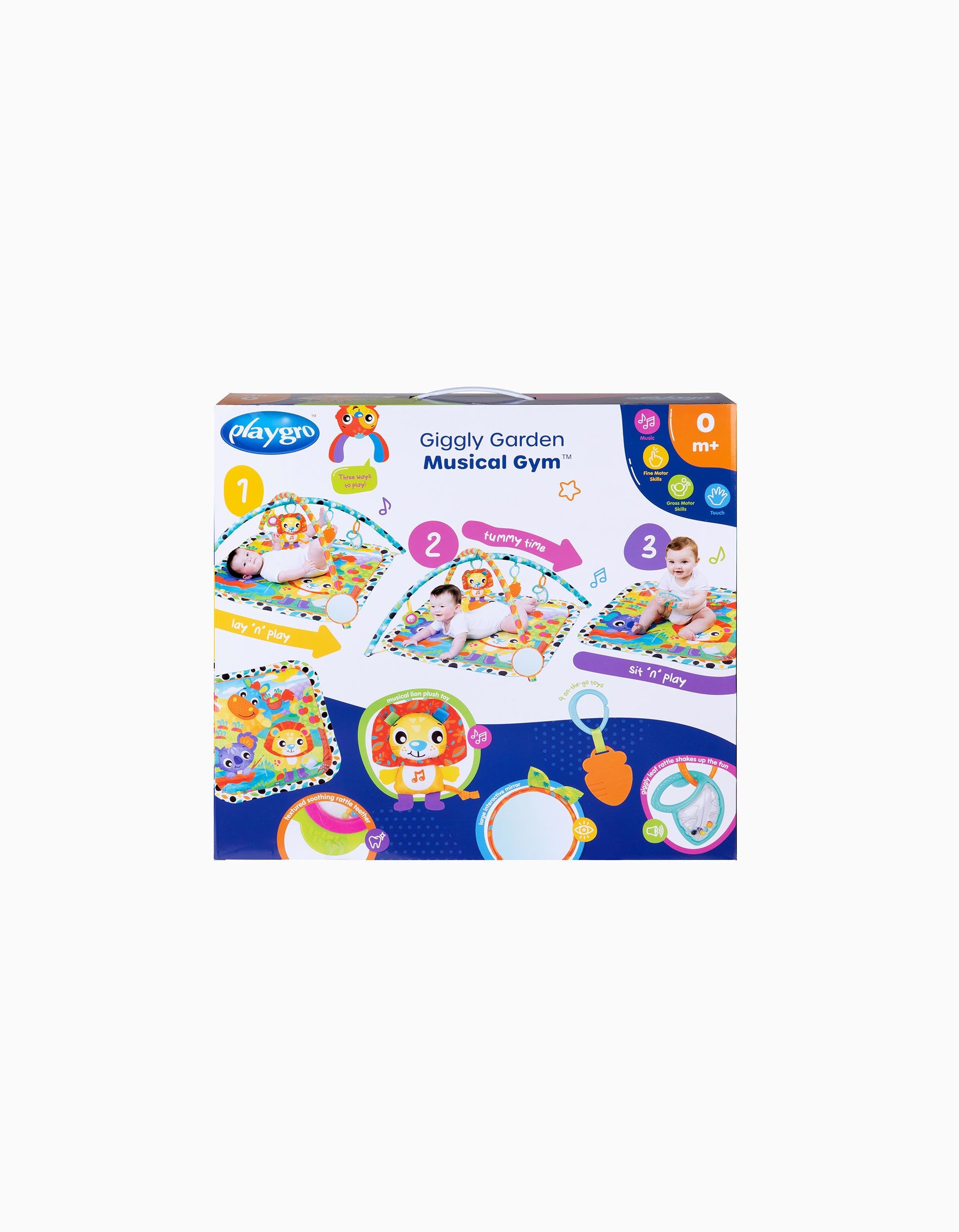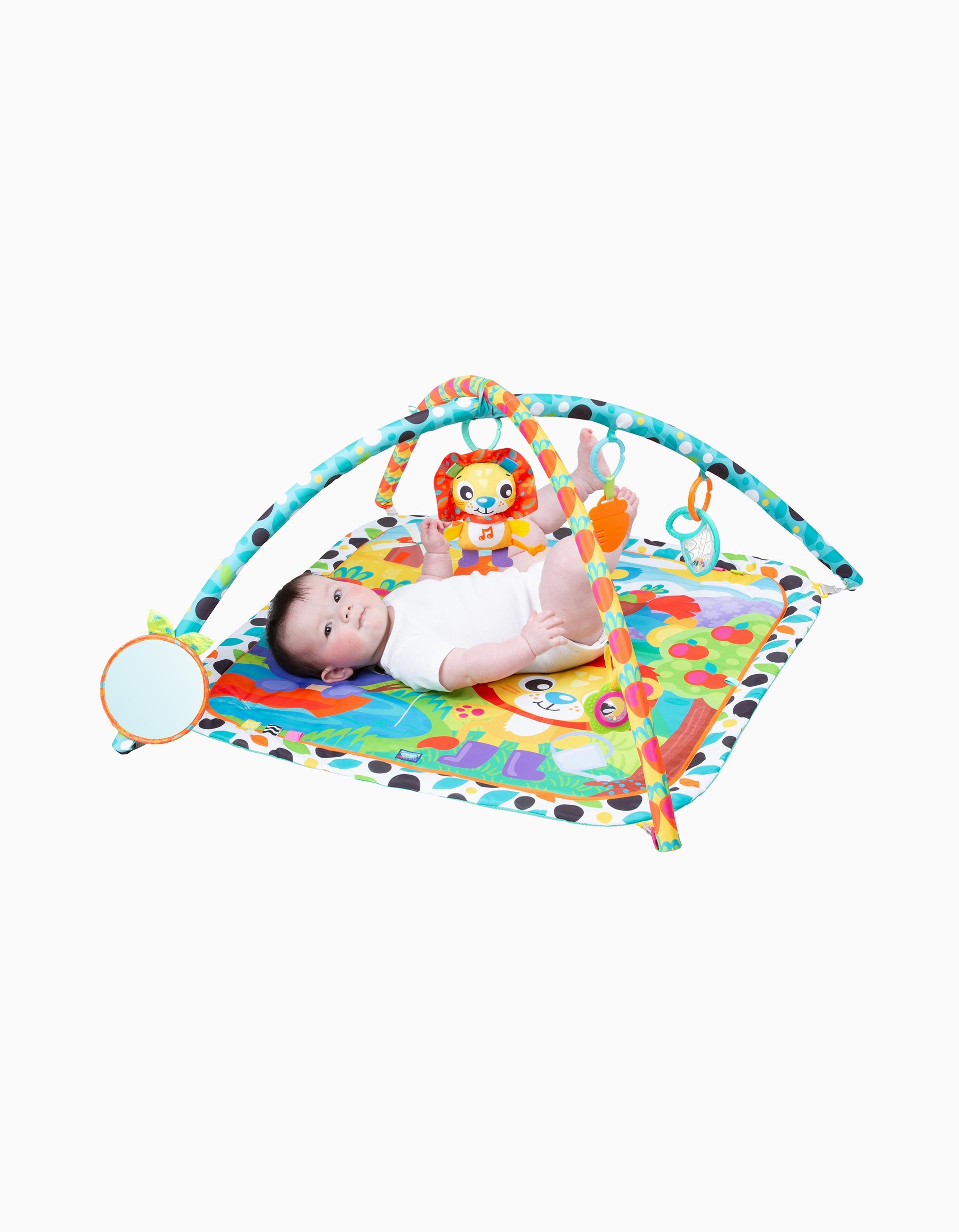 El Gimnasio Musical Giggly Garden, ¡dónde la diversión florece cada día! El sonajero con forma de hoja anima el tiempo de juego con sonidos divertidos, mientras que la flor que gira y se retuerce trae remolinos de alegría y alivio. El mordedor de zanahoria masticable es perfecto para los nuevos mordisqueadores, y el león musical con botón a presión ruge alegres melodías para el ritmo y la diversión. Un gran espejo fomenta el autodescubrimiento y las risas interminables, mientras que las cintas táctiles proporcionan una deliciosa exploración para los deditos. El Gimnasio Musical Giggly Garden convierte cada sesión de juego en una alegre aventura en el jardín. Pilas tipo X2 LR41 no incluidas.