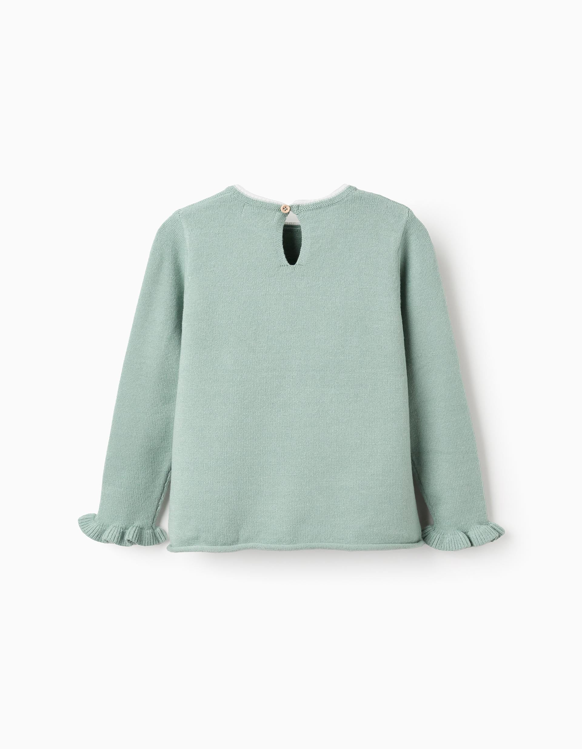 Jersey de punto suave verde para niña, con jacquard de lazo blanco. Dobladillo con efecto enrollado y mangas con volantes. Botón en la espalda para vestir fácilmente. ¡Un jersey suave y acogedor!