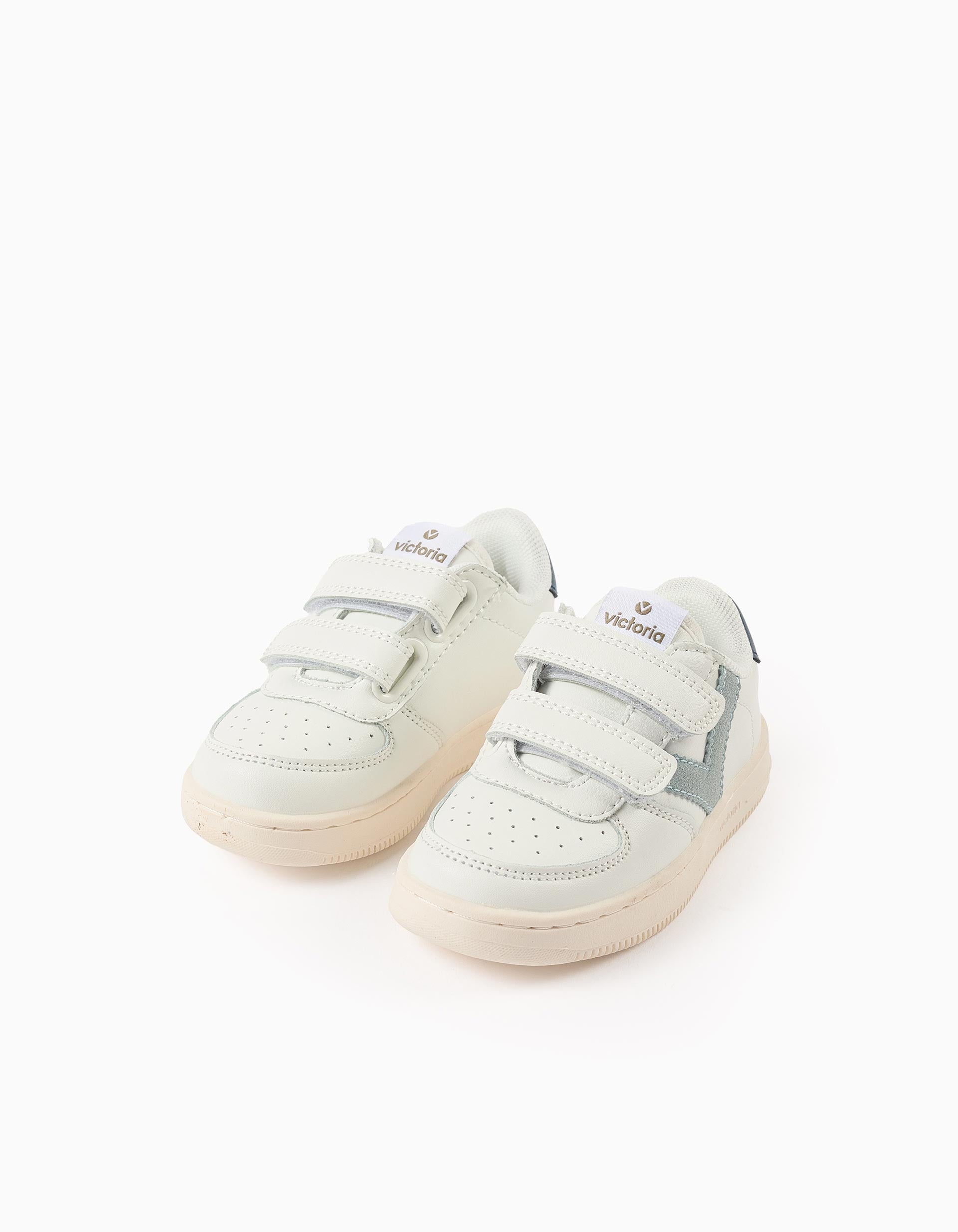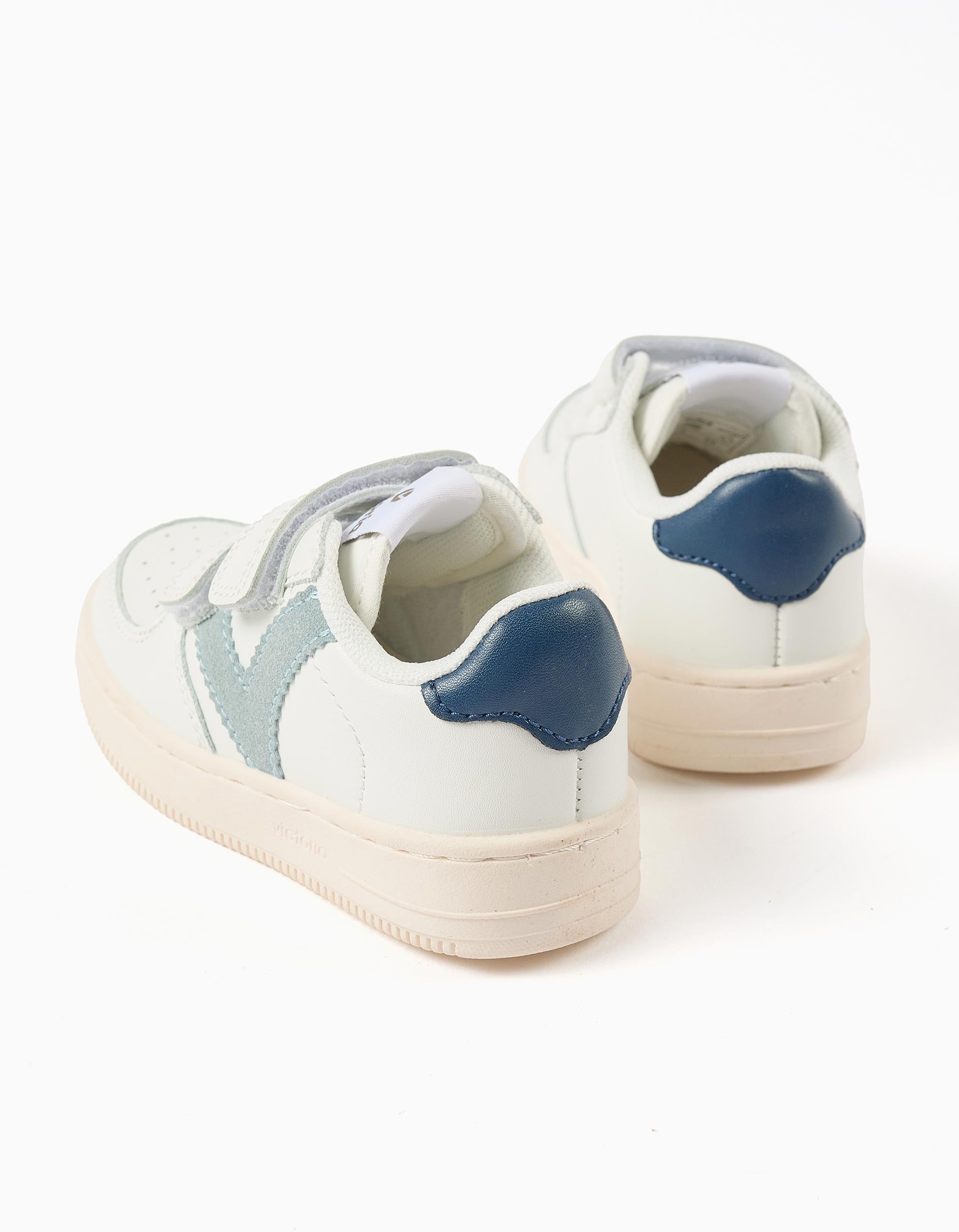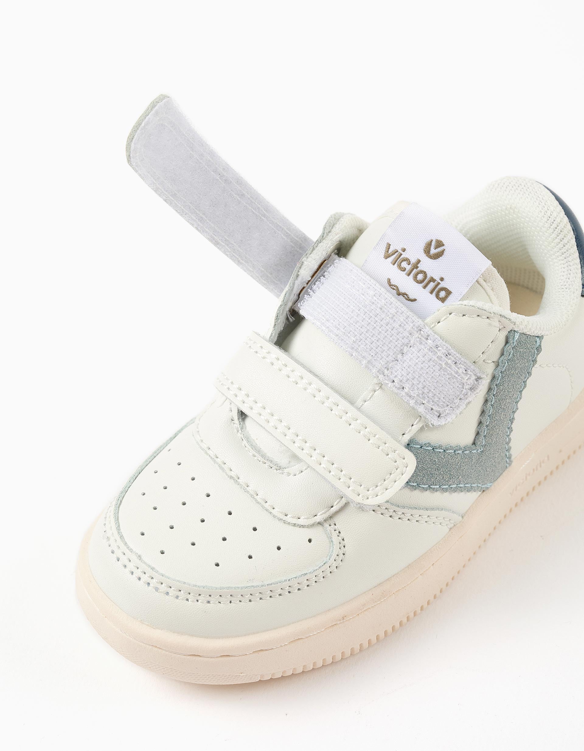 Zapatillas para niño modelo Tiempo de Victoria. Fabricadas en piel sintética blanca con detalles en contraste en azul claro y azul oscuro. Se abrochan fácilmente con tiras autoadherentes, lo que proporciona mayor independencia a los niños. Parte delantera perforada e interior de malla para una mayor transpirabilidad. Perfectas para el día a día.