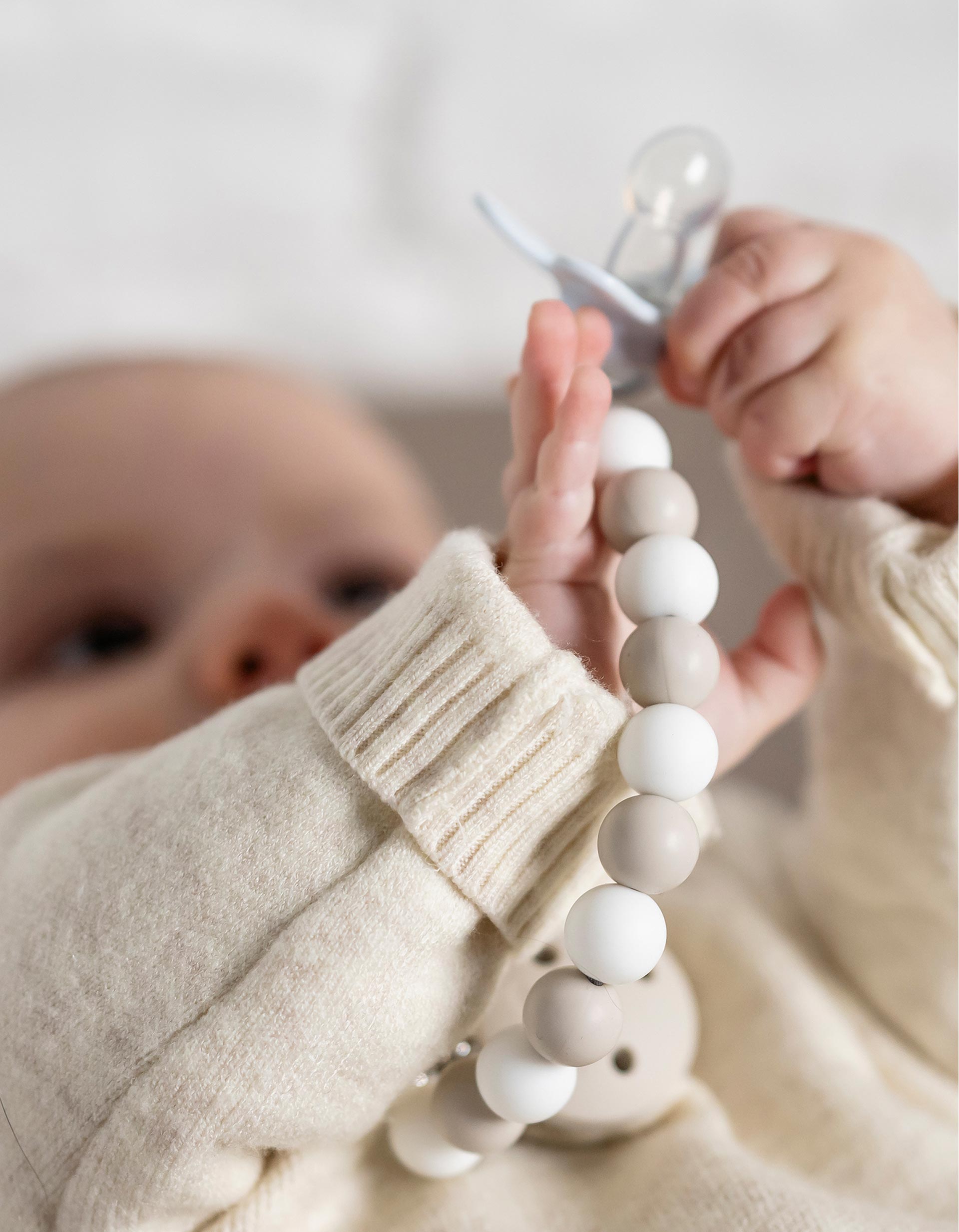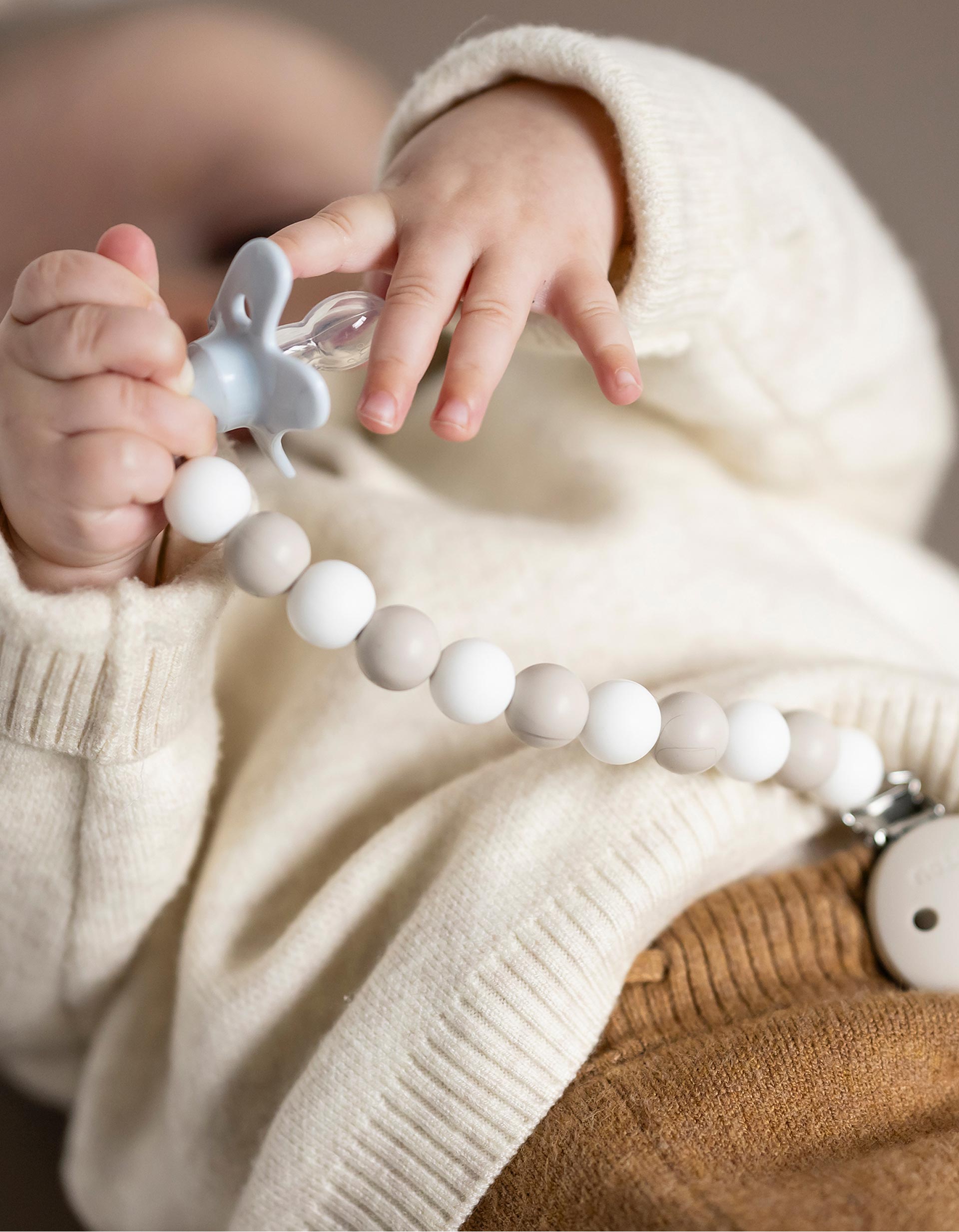 Chaîne 100 % silicone, couleur clay/blanc. Idéal pour que le bébé ne perde jamais sa sucette. Grâce à la chaîne, la sucette est toujours à portée de main du bébé. Facile à fixer aux vêtements grâce à son clip réglable. Compatible avec toutes les sucettes. Les perles en silicone souple ne font pas seulement de la sucette un accessoire, pour les plus petits, c’est aussi une aide pour soulager les maux de dents. Entretien facile : laver à l’eau et au savon. Dimensions : 21 cm. Remarque : remplacez dès les premiers signes d’usure.