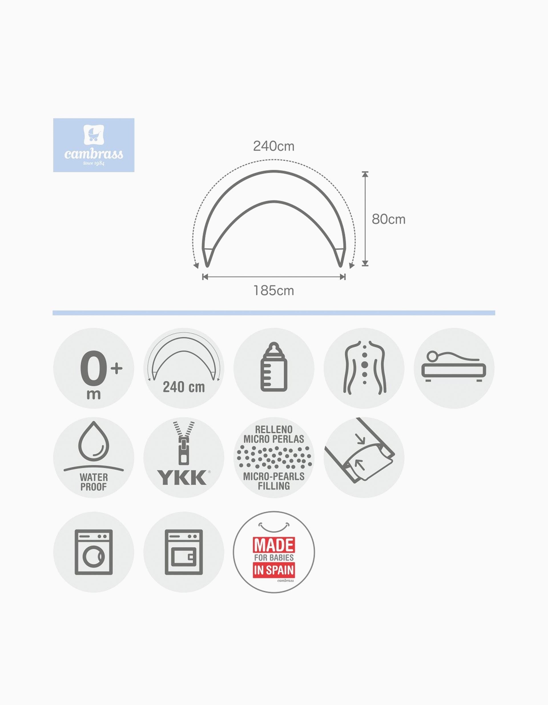 Coussin d'allaitement Cambrass, en rose. Il est un complément idéal pendant la grossesse et un élément essentiel pendant l'allaitement. Grâce à son rembourrage spécial en micro-perles, il s'adapte à 100 % à tous les stades de la grossesse. Il est également idéal pour l'allaitement et offre un plus grand confort à la mère et au bébé. La housse du coussin est amovible et lavable. L'intérieur est doté d'un tissu hydrophobe qui le rend imperméable et empêche le passage d'éventuelles gouttes de lait. C'est aussi un support parfait pour le bébé, toujours sous la surveillance maternelle/paternelle. Dimensions : 80x185x16 cm. Fabriqué en Espagne.
