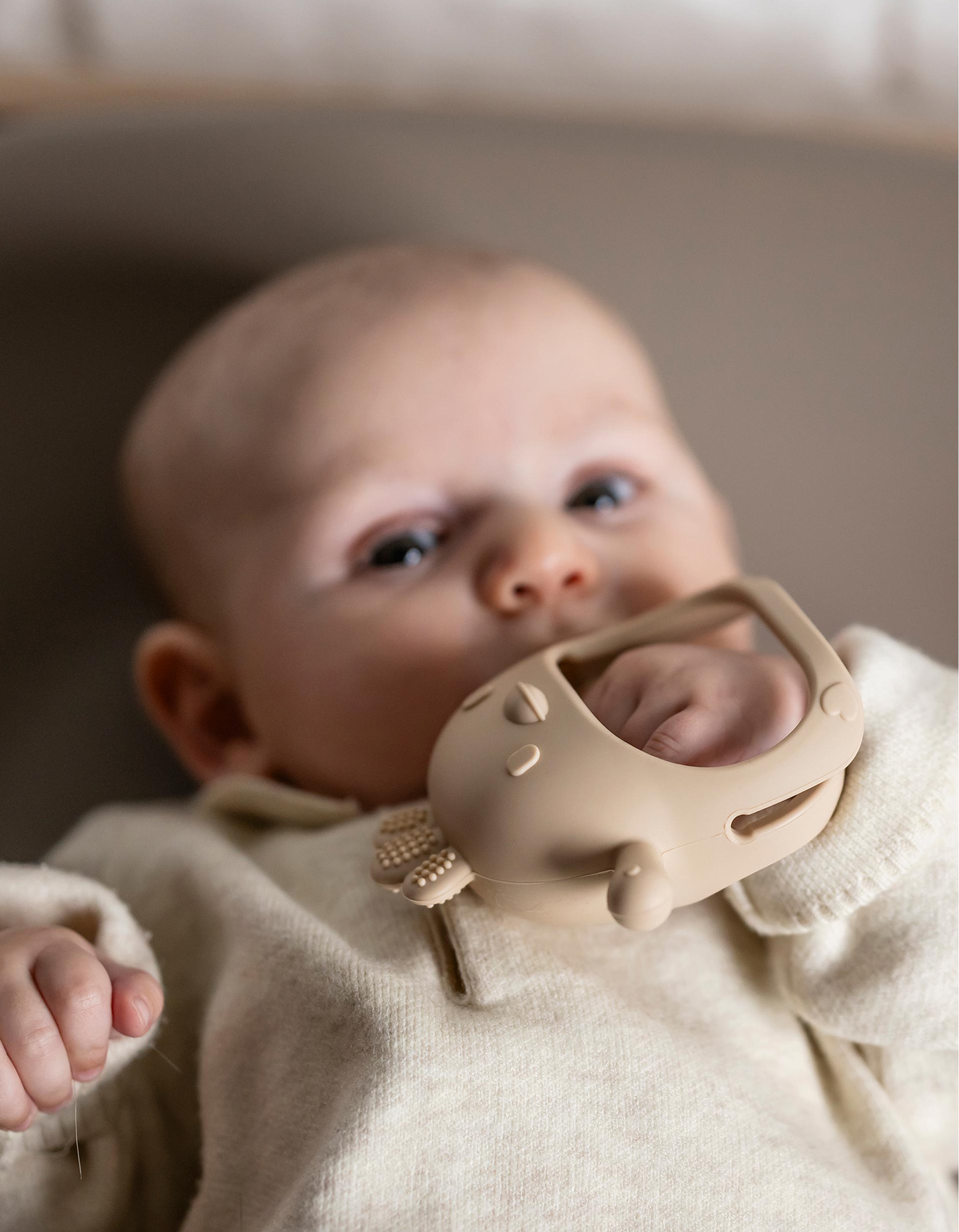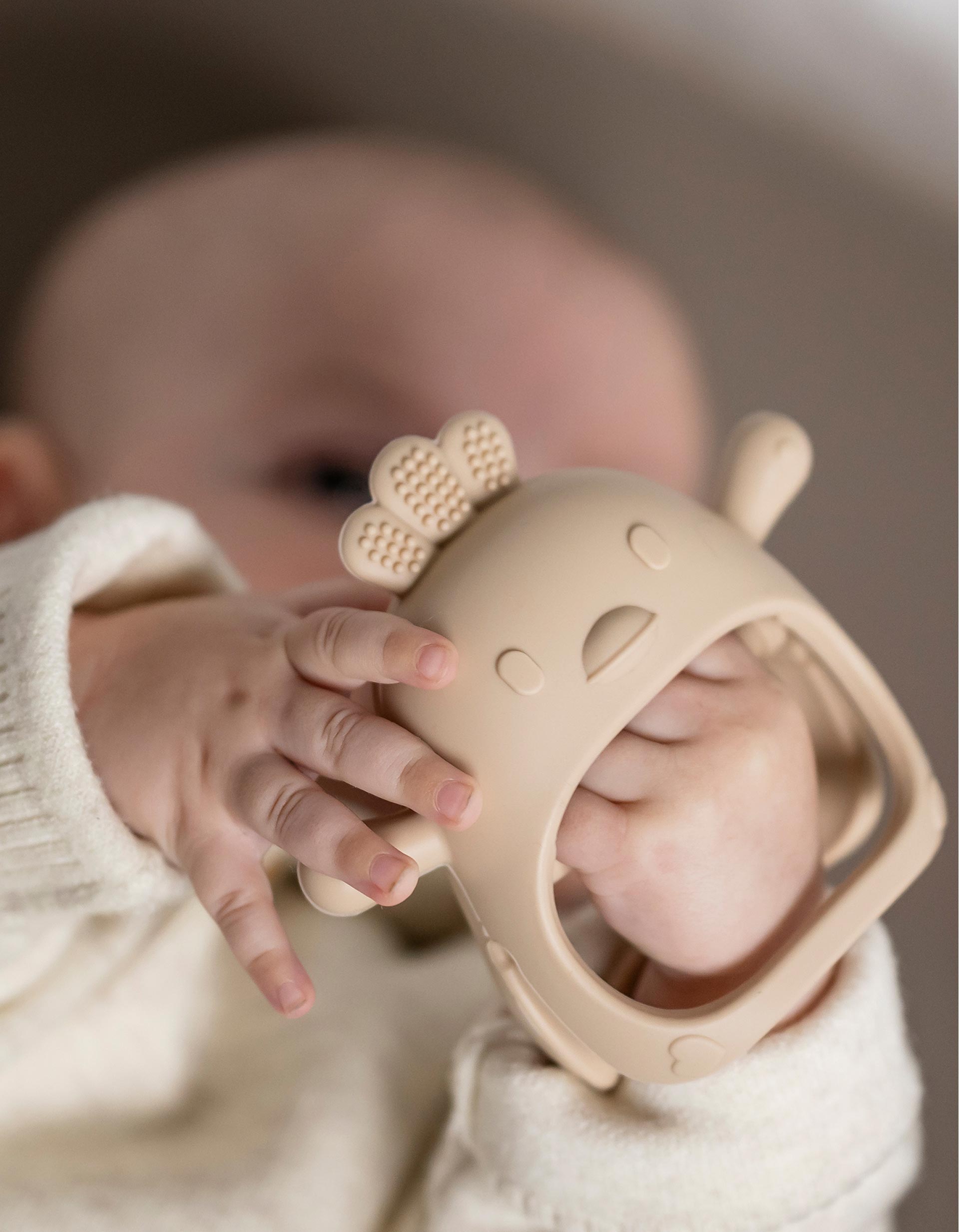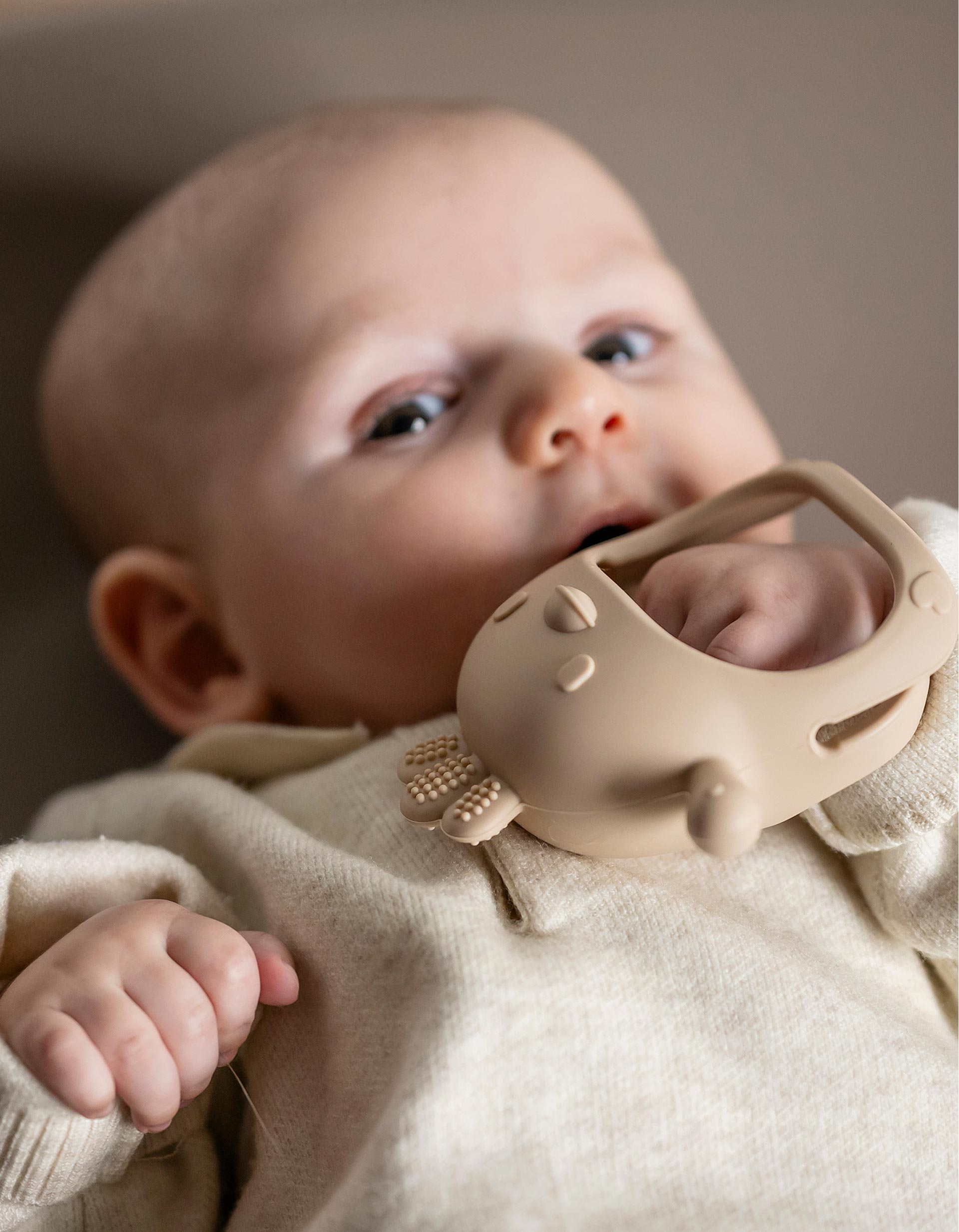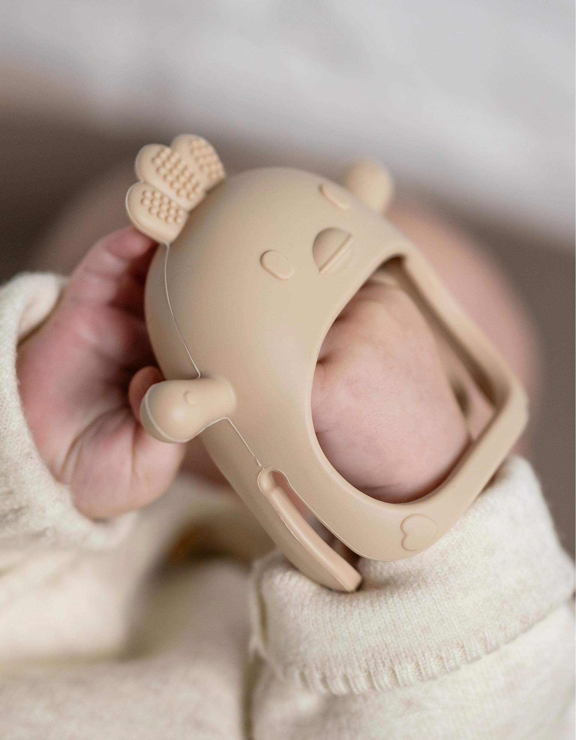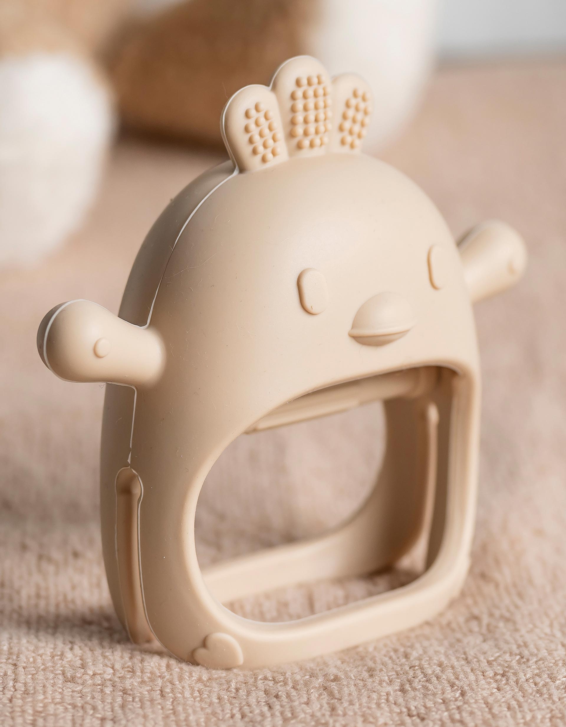Moufle de dentition en silicone, couleur clay, avec une surface rugueuse pour masser les gencives et soulager les maux de dents. Sa forme est parfaite pour les petites mains. Il est facile à nettoyer avec de l’eau et du savon/détergent neutre. Garantie de qualité : silicone de haute qualité, sans BPA.