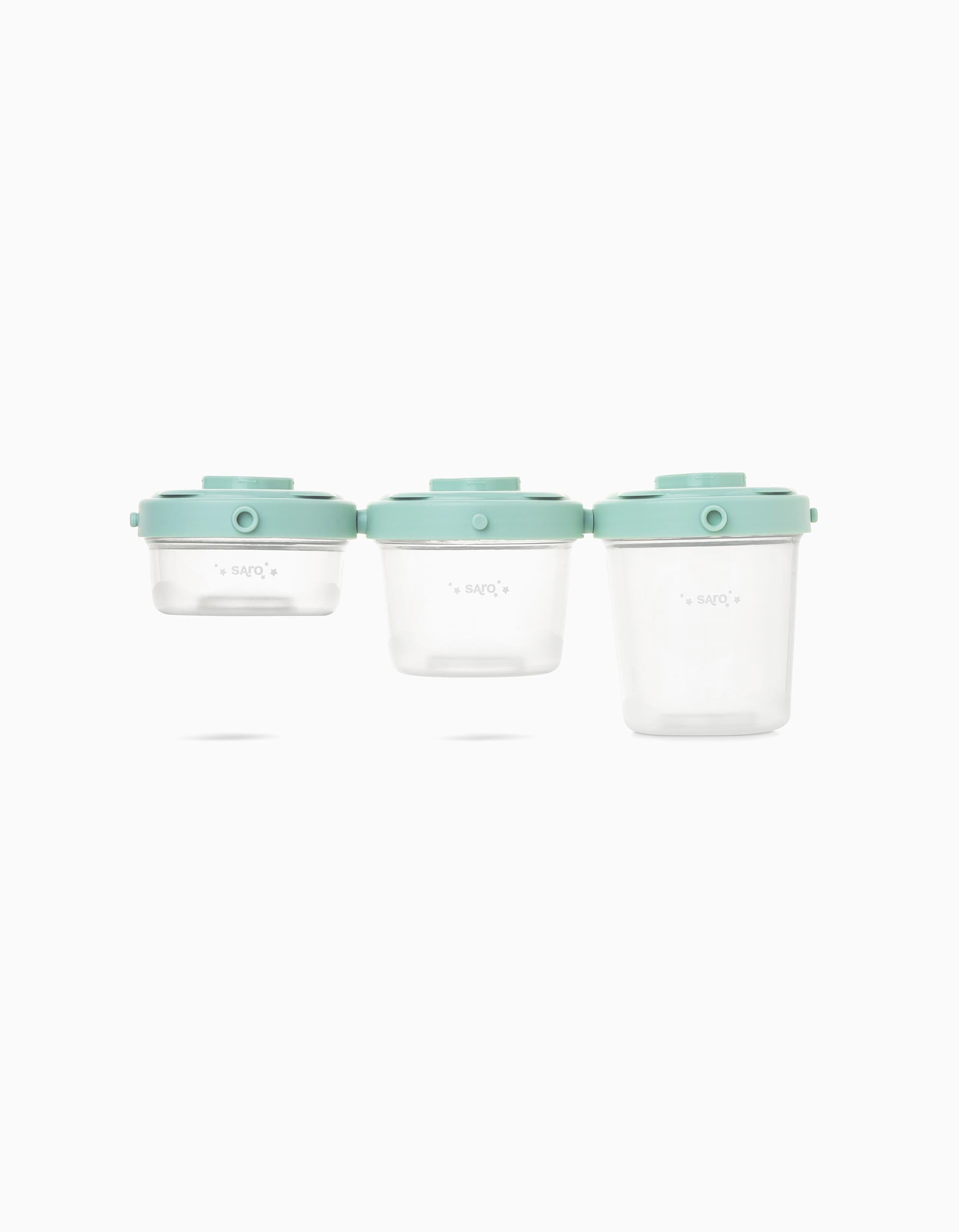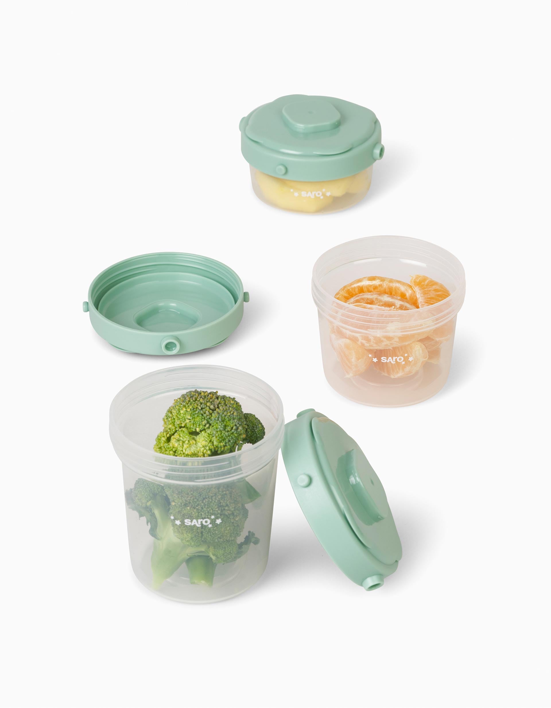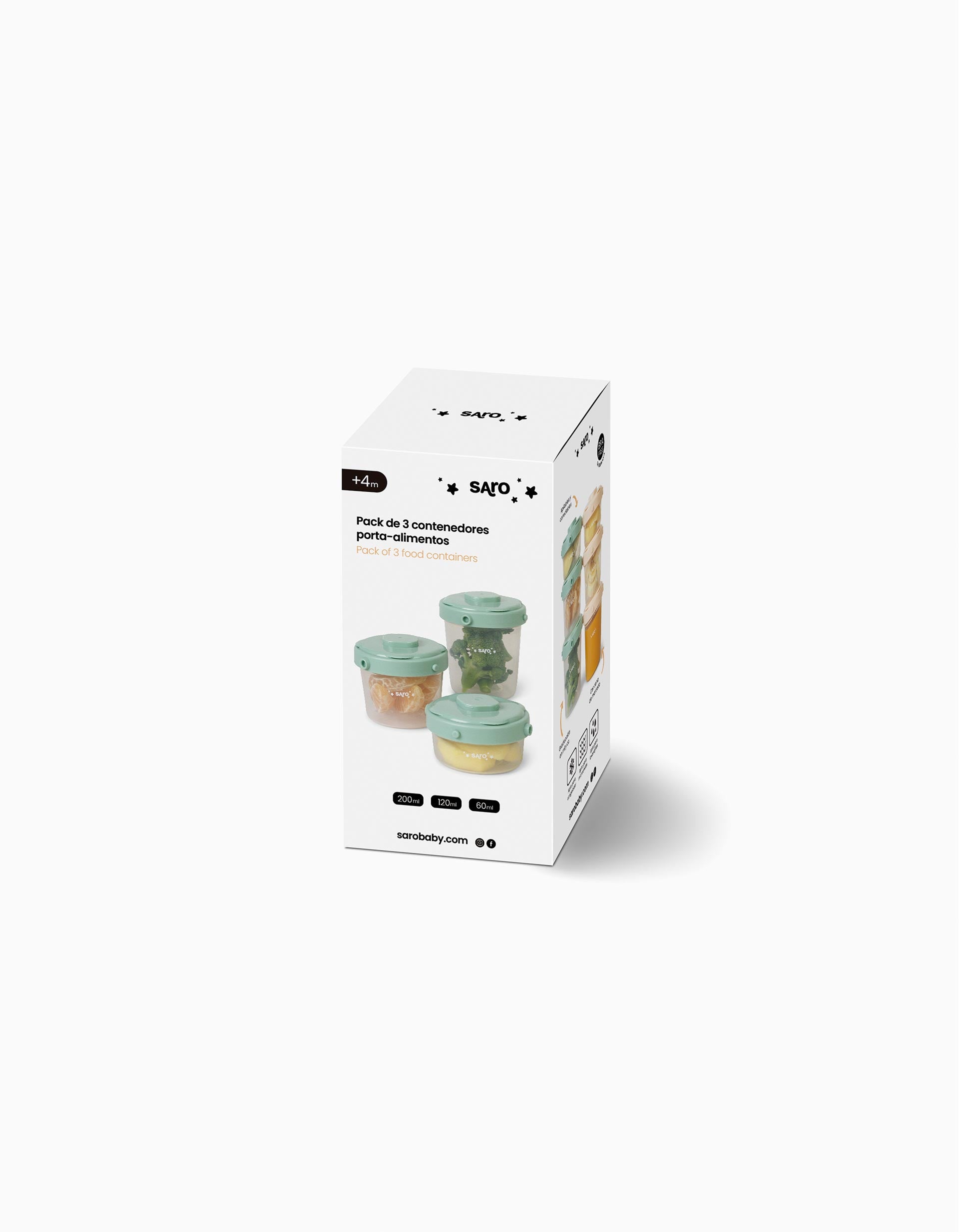 Set of three food containers from Saro that allows you to store your baby's food in a practical and easy way, so they can be consumed according to your needs and planning. With a screw hermetic closure, they ensure a perfect seal, with no risk of leaks. They are easy to store as they can be stacked, taking up little space. In addition, they include a marking area so you can note the contents and the date it was made. The boxes have different capacities: 60ml, 120ml, and 200ml. Suitable for fridge, freezer, microwave (without lid), and dishwasher.