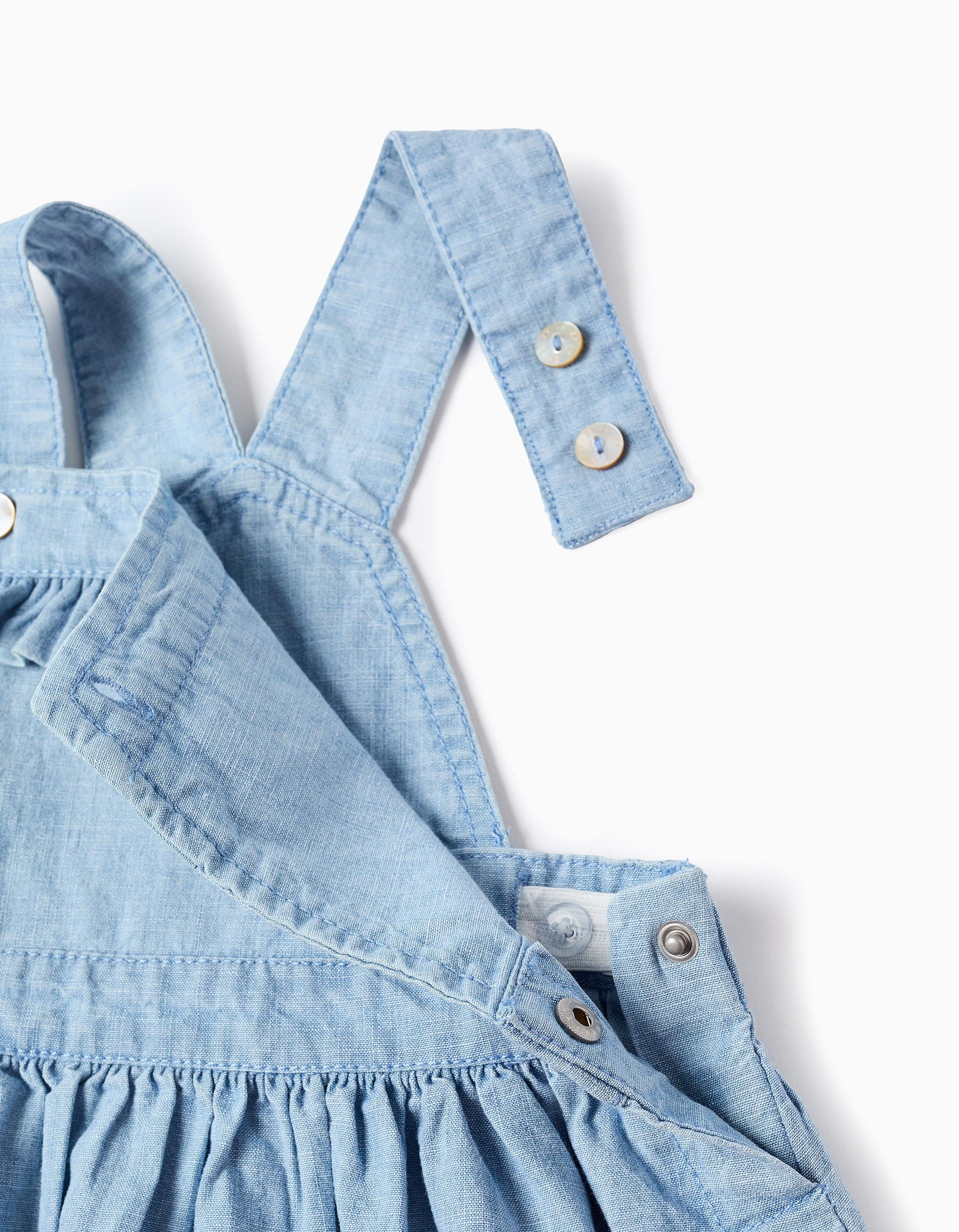 Robe-salopette bleue pour bébé fille, en denim 100 % coton. Bretelles ajustables. Volants sur le devant. Jupe froncée. Une pièce intemporelle !