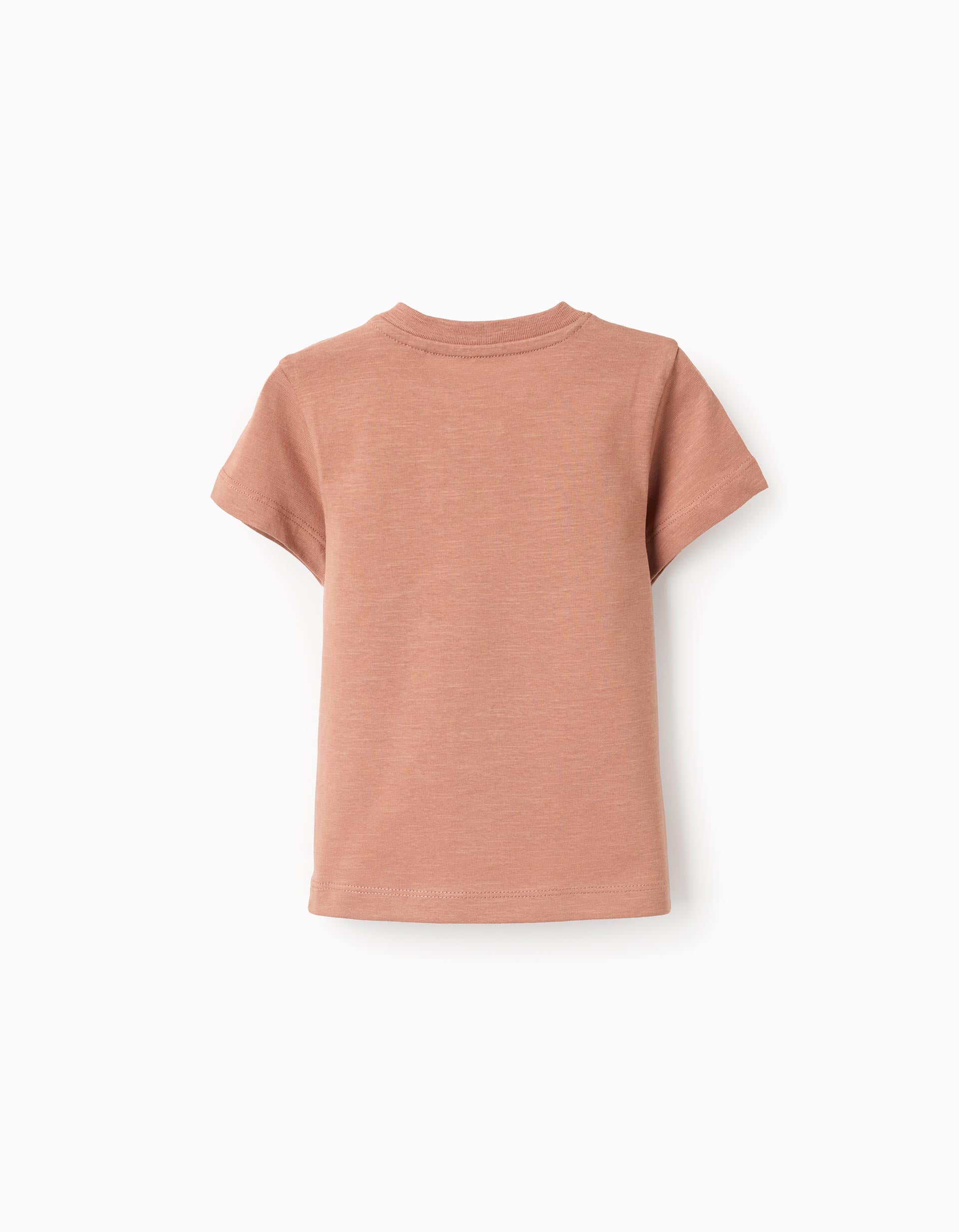 T-shirt marron en jersey 100 % coton pour bébé garçon. Imprimé frontal avec détails en relief. Pressions à l'épaule pour un enfilage facile. Étiquette intérieure imprimée pour ne pas irriter la peau. Doux, confortable et élégant, parfait pour tous les styles !