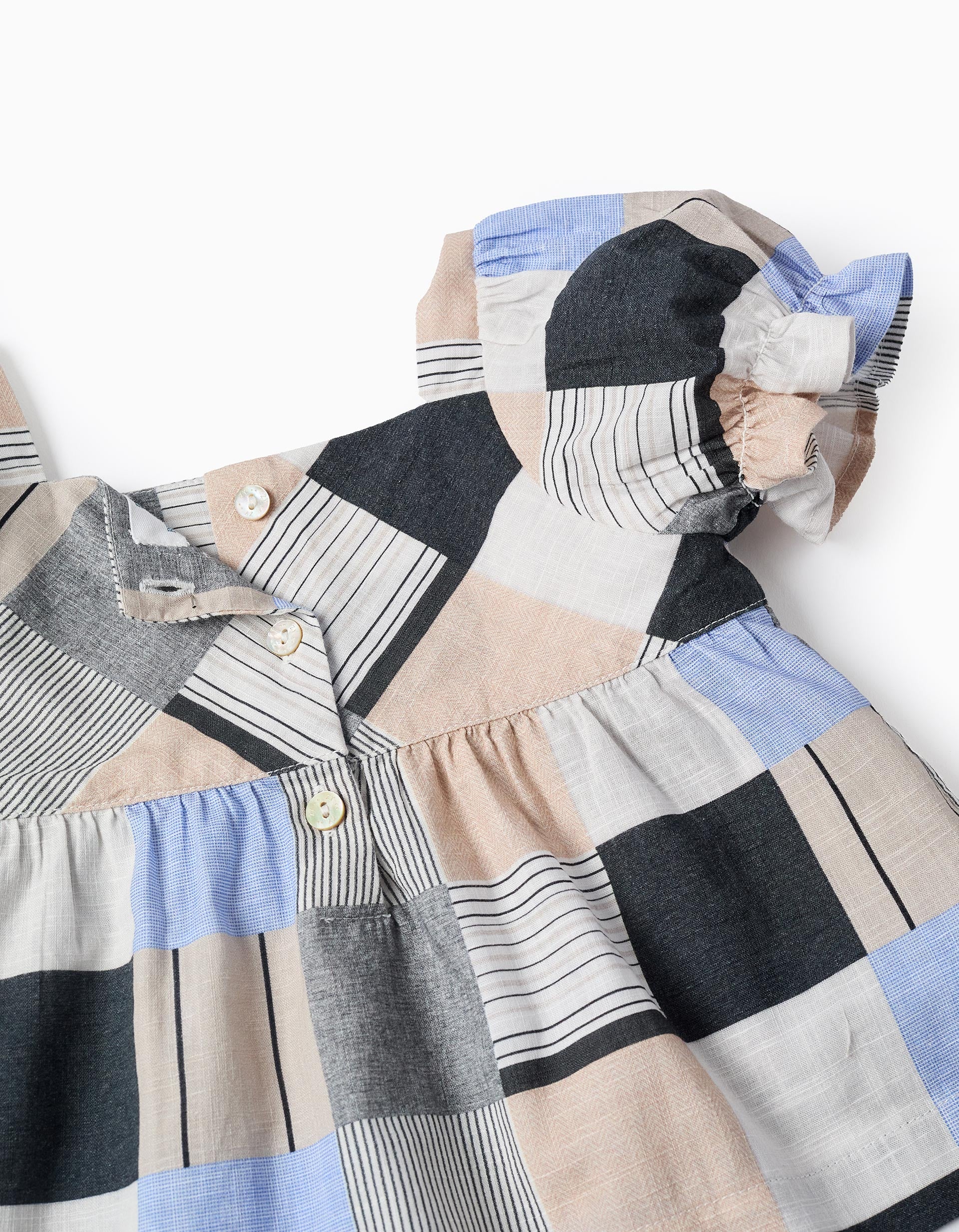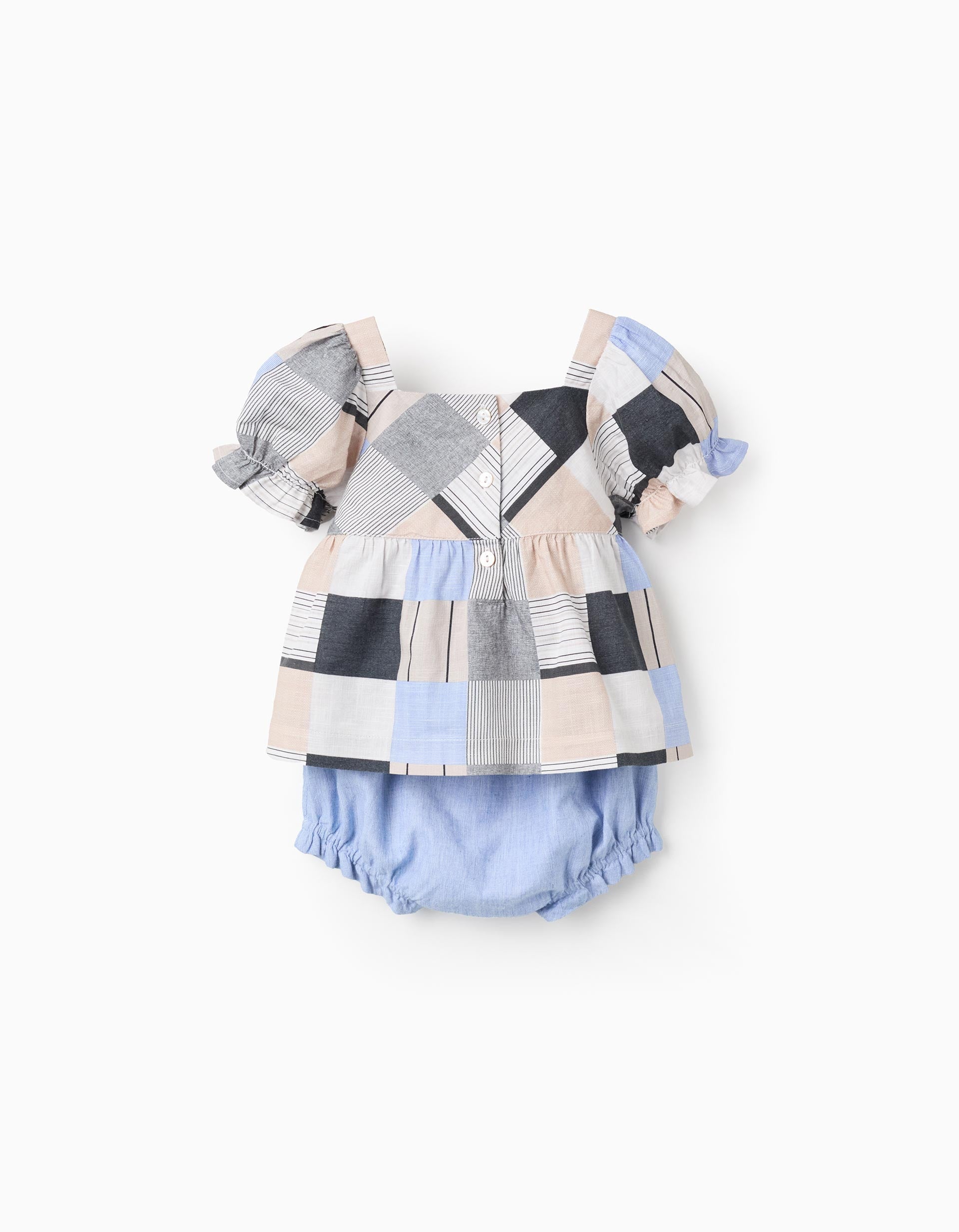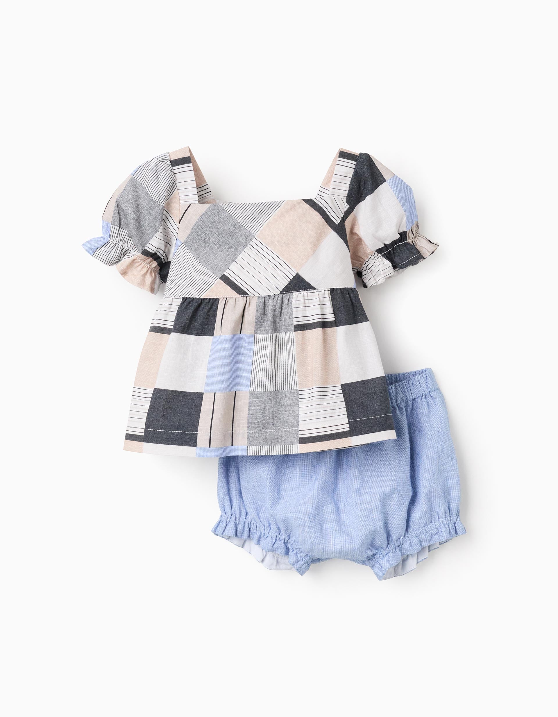 Brothers & Sisters Collection. Two-piece set for baby girls. Includes a peasant-style blouse with an original pattern in shades of beige, grey, and blue. Features a square neckline, elastic sleeves with ruffles, and gathered chest seam. Also includes blue bloomers with lining. A classic and elegant option to mix and match with other items from the same collection!