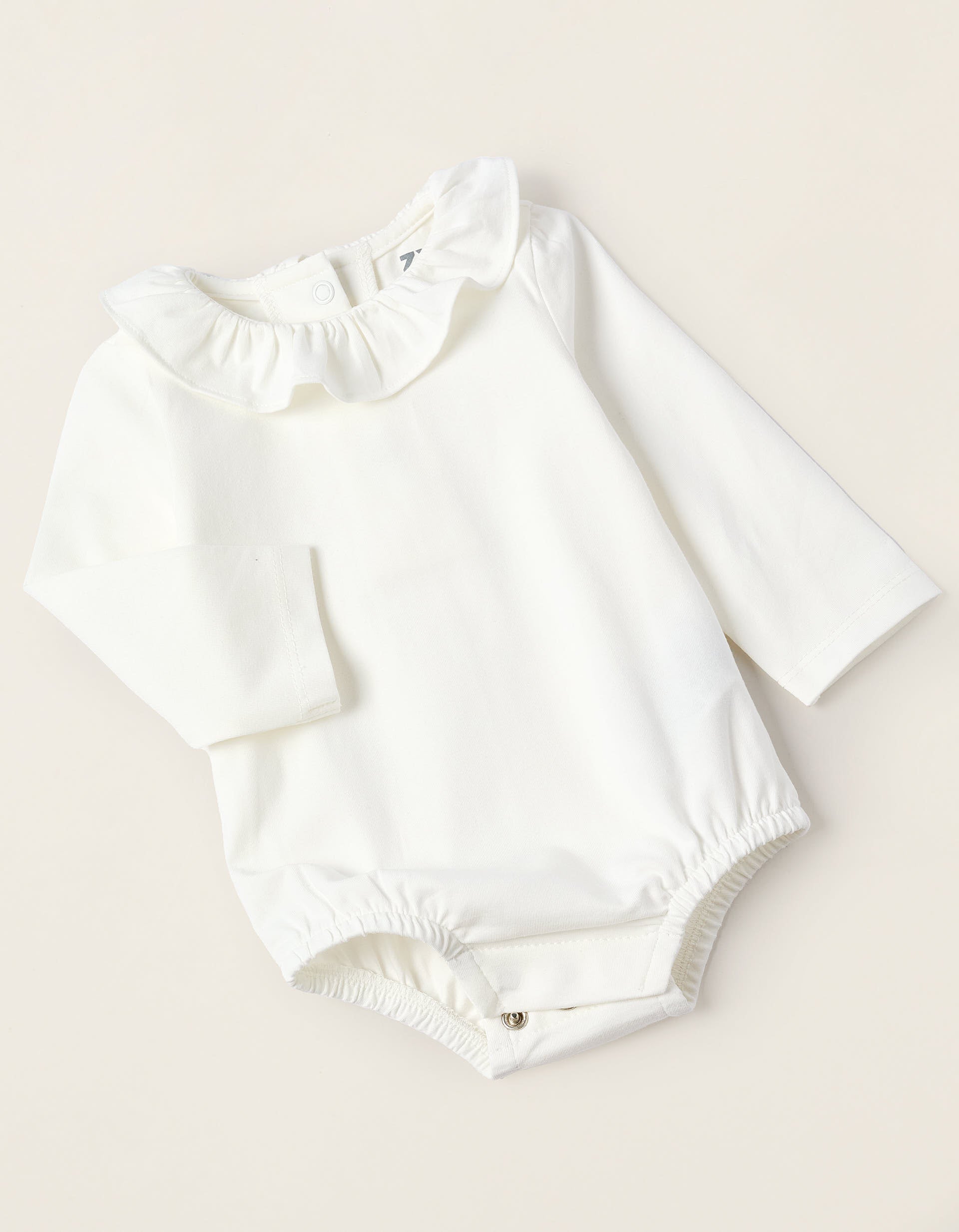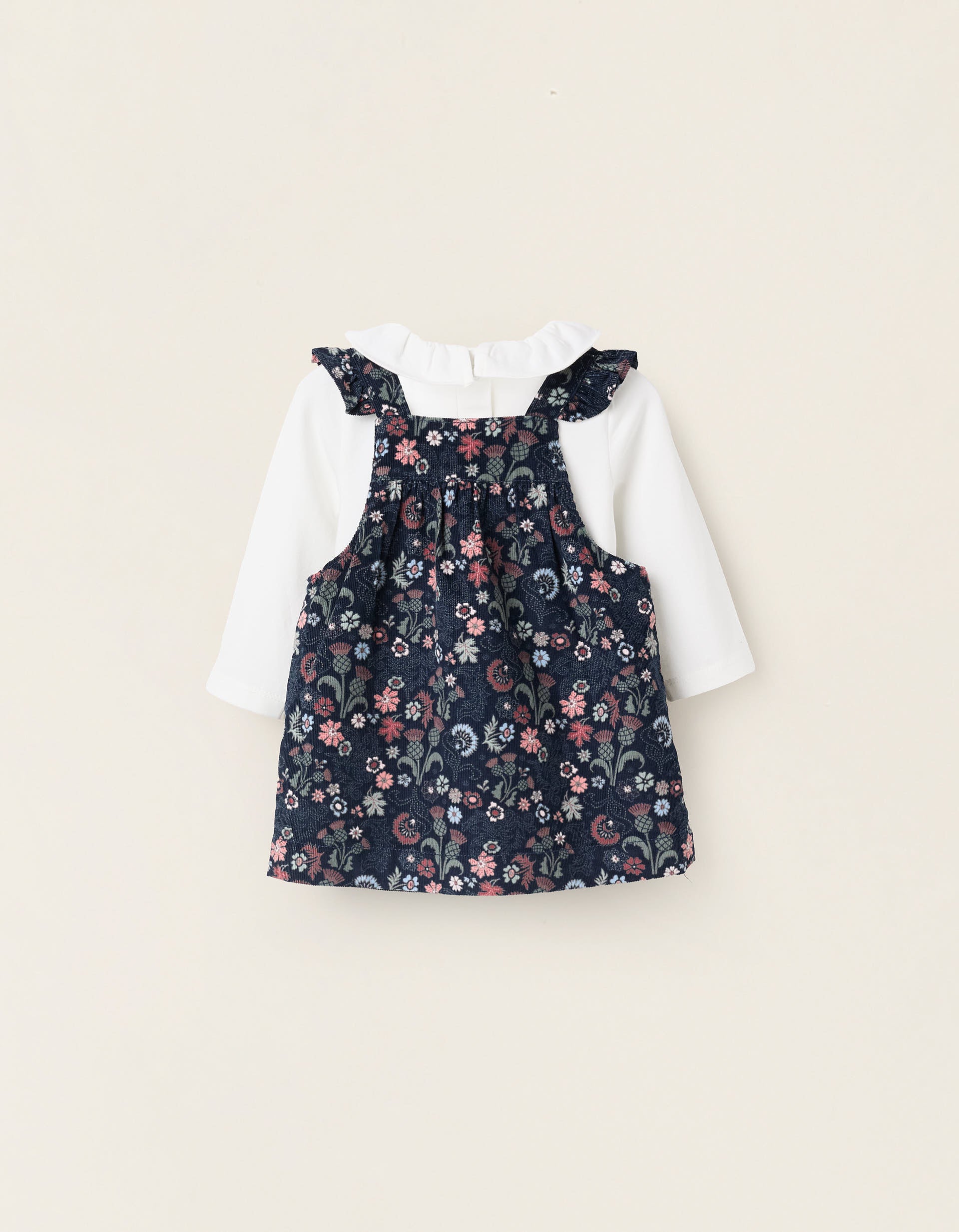 Brothers & Sisters collection. Two-piece set for newborn girls. Includes a white bodysuit with ruffled collar; and a dark blue corduroy pinafore dress with floral pattern in shades of green, pink, brown, and blue. Adjustable frilled straps. A lovely floral pattern to match among siblings!