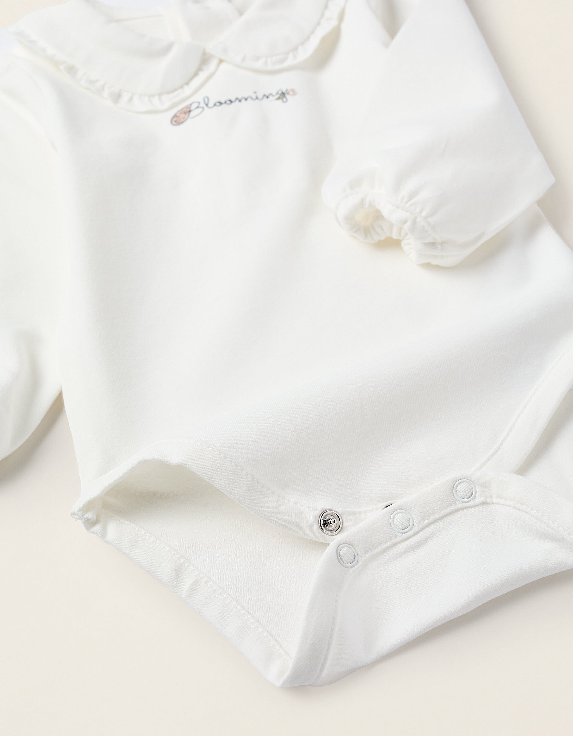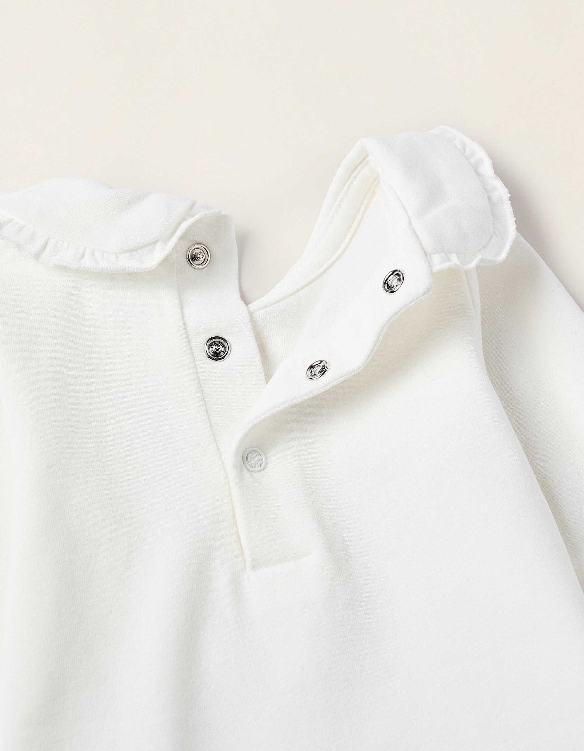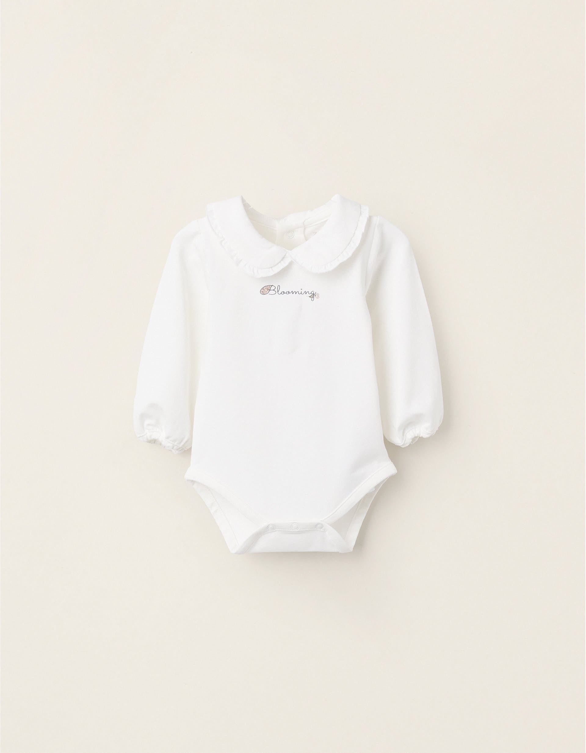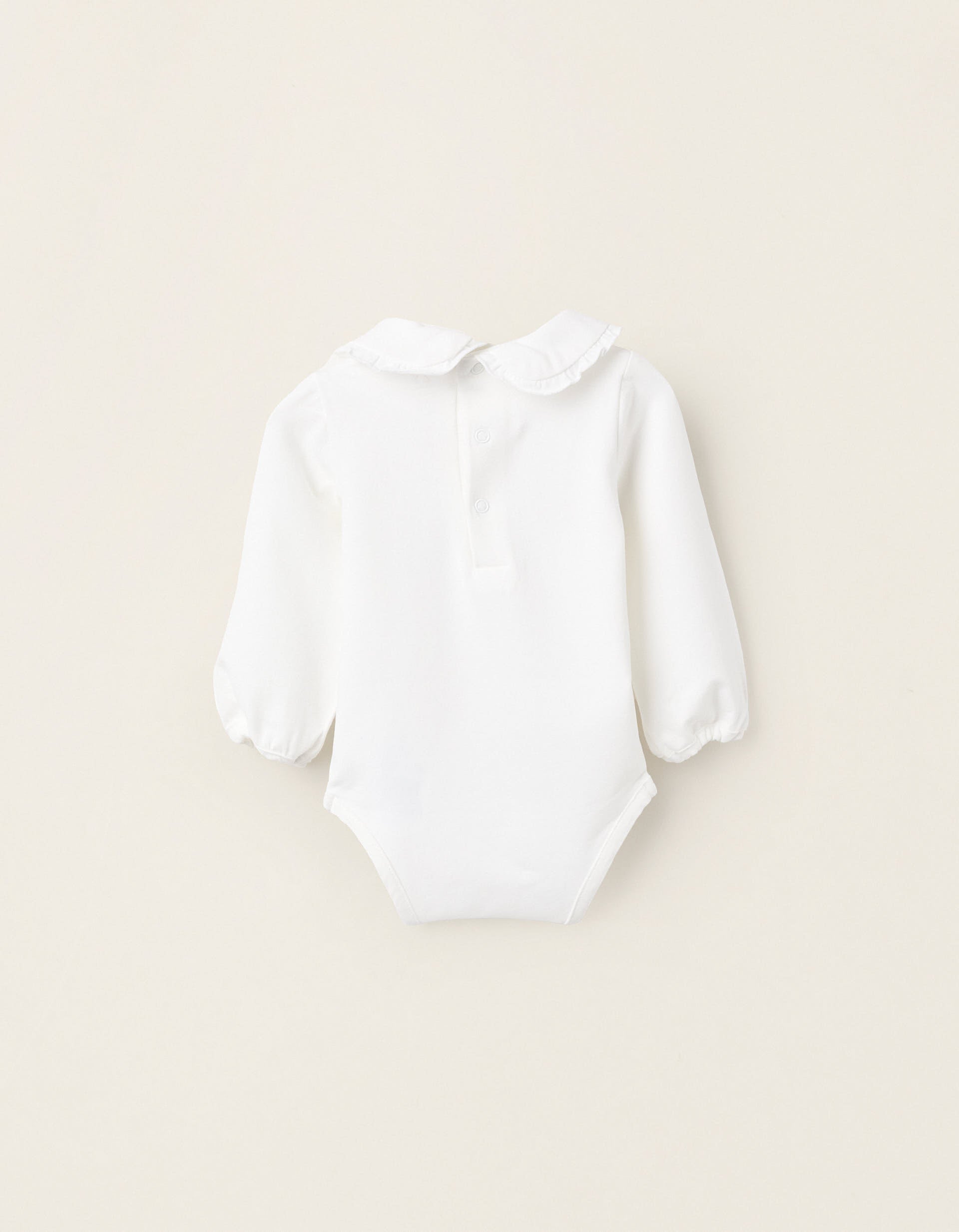 White long-sleeved bodysuit for newborn girls, made of cotton with a touch of stretch for greater comfort and freedom of movement. Peter Pan collar with frill trim. Elasticated cuffs. Snap fasteners at the back and crotch for easy dressing. Printed inner label to avoid irritating the skin. A lovely option that is easy to pair with other garments!