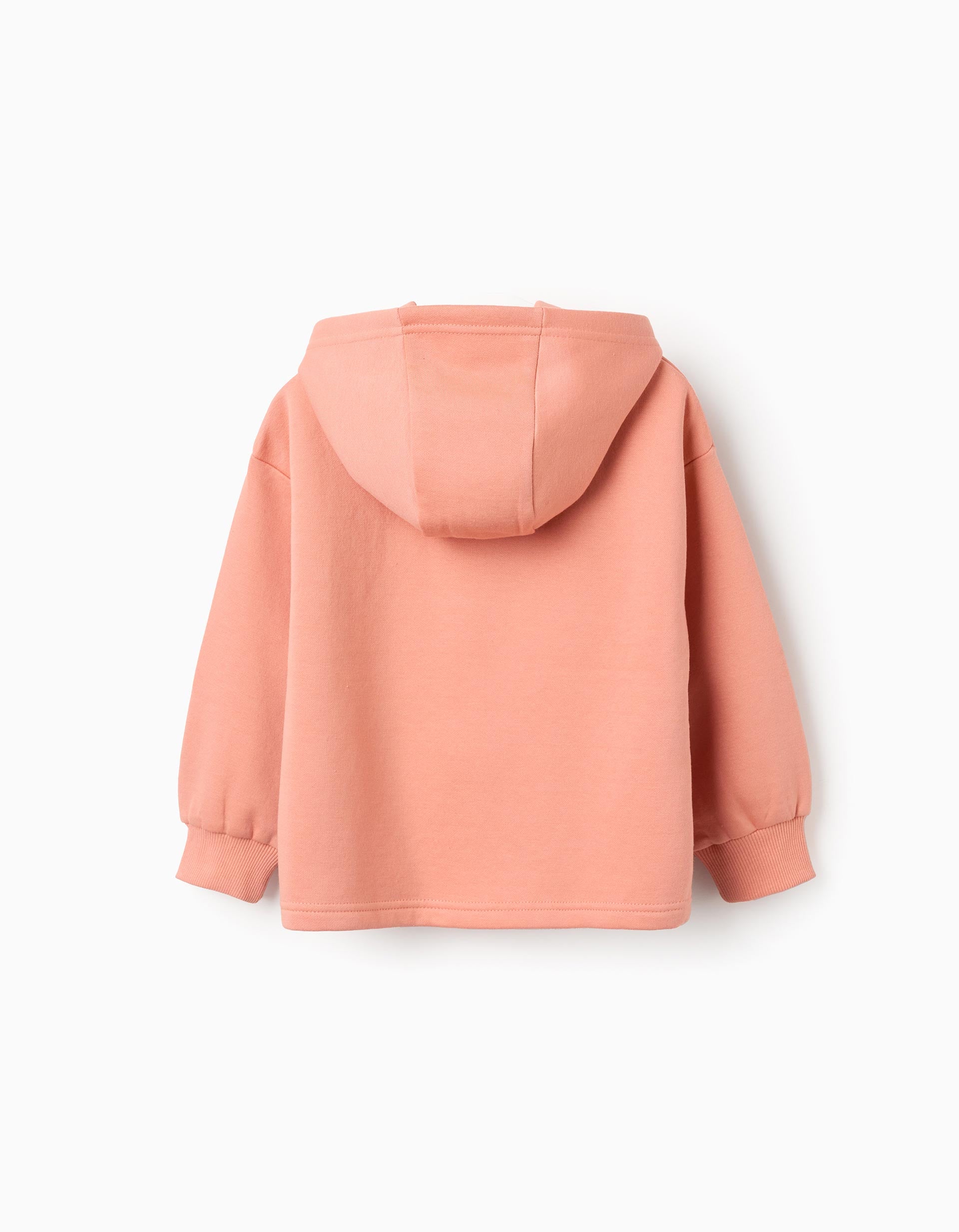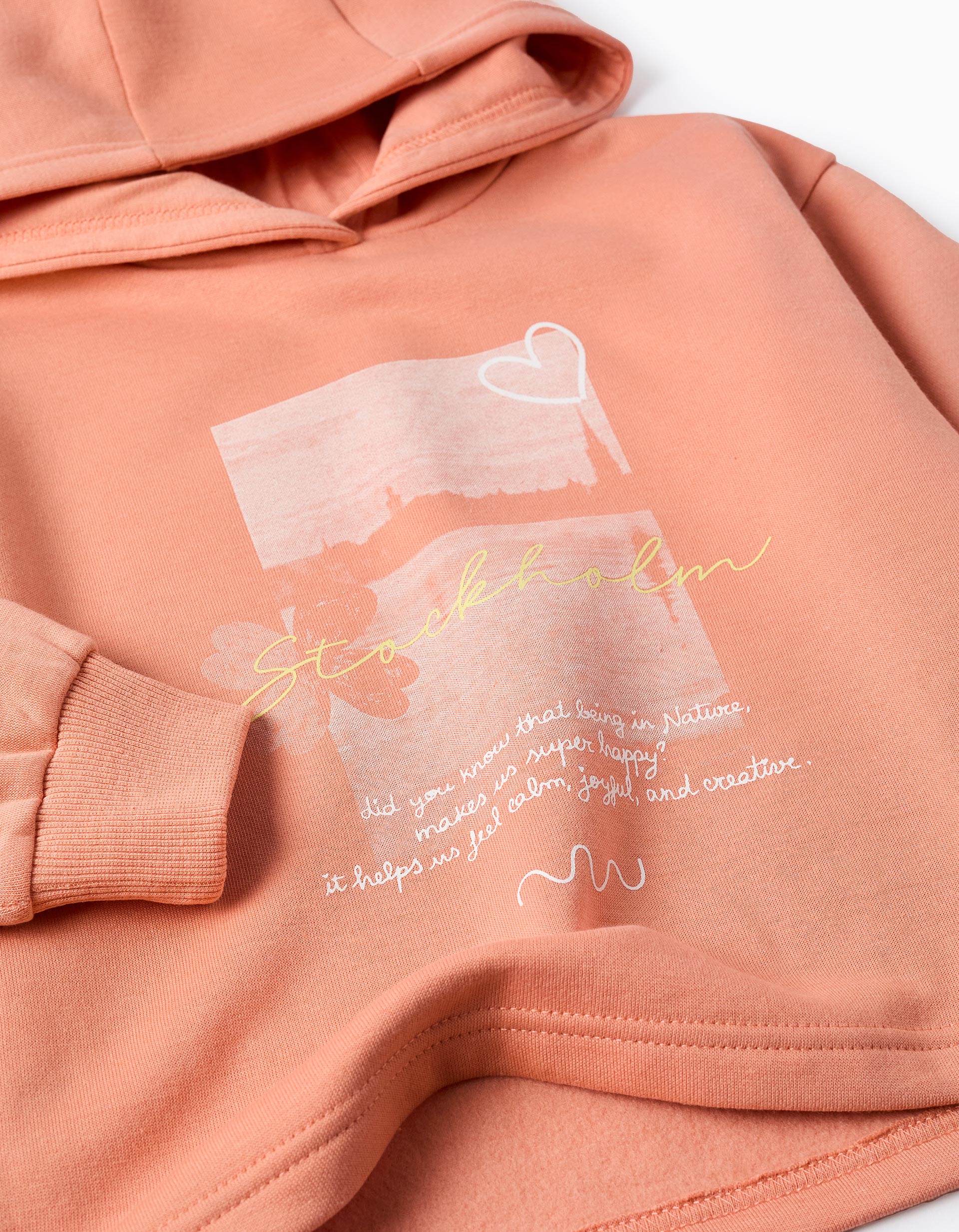 Coral hooded sweatshirt for girls, with brushed interior for greater thermal comfort. Front print and dropped shoulders for an urban, relaxed style. Ribbed cuffs for a perfect fit. Flowing cut. A soft and cosy sweatshirt, perfect for everyday looks. We Care: Oeko-Tex Standard 100 certified item, which guarantees the absence of harmful or irritating substances for the skin.