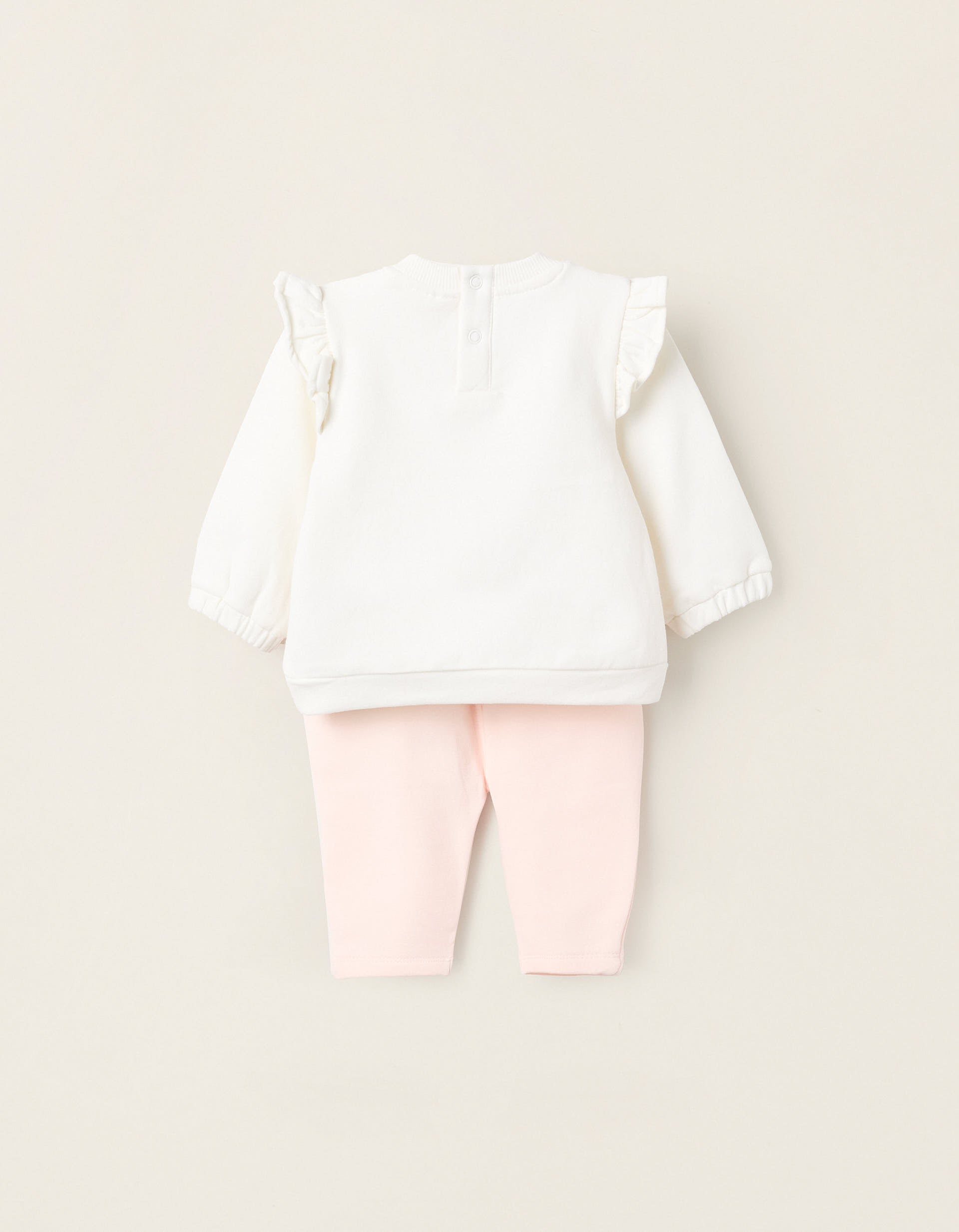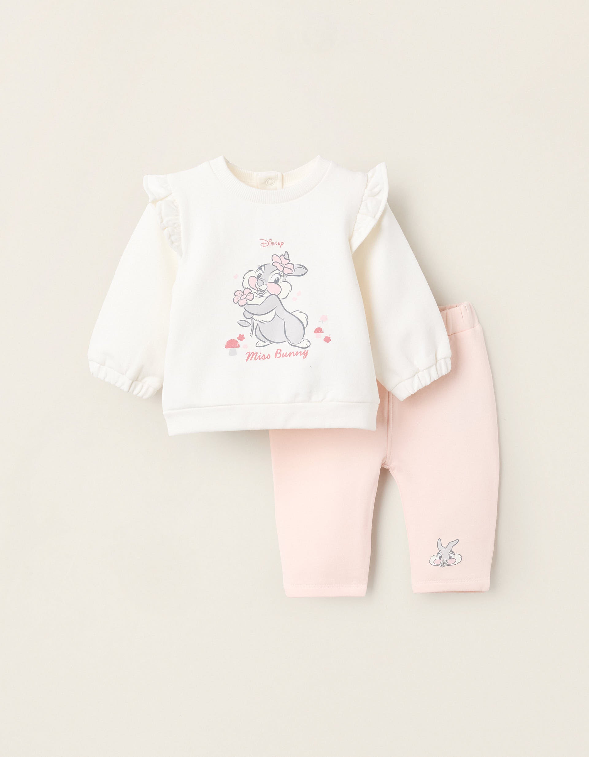 Two-piece set for newborns, with a brushed interior for greater thermal comfort. It consists of a white sweatshirt with ruffles around the shoulders, with a Miss Bunny print. With press studs on the back for easy dressing; and plain pink trousers with a comfortable elasticated waistband. A practical and cosy set with the Disney label, ideal for everyday wear! We Care: item with Oeko-Tex Standard 100 certification, which guarantees the absence of harmful or irritating substances for the skin.