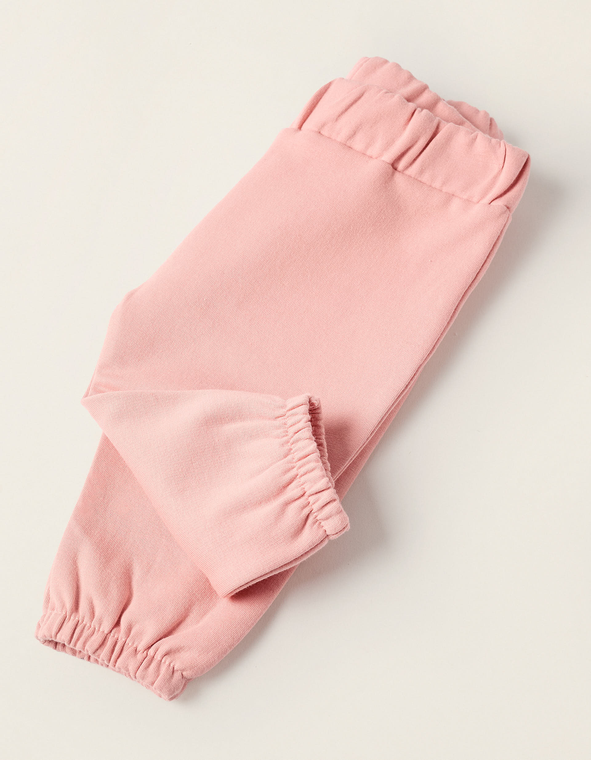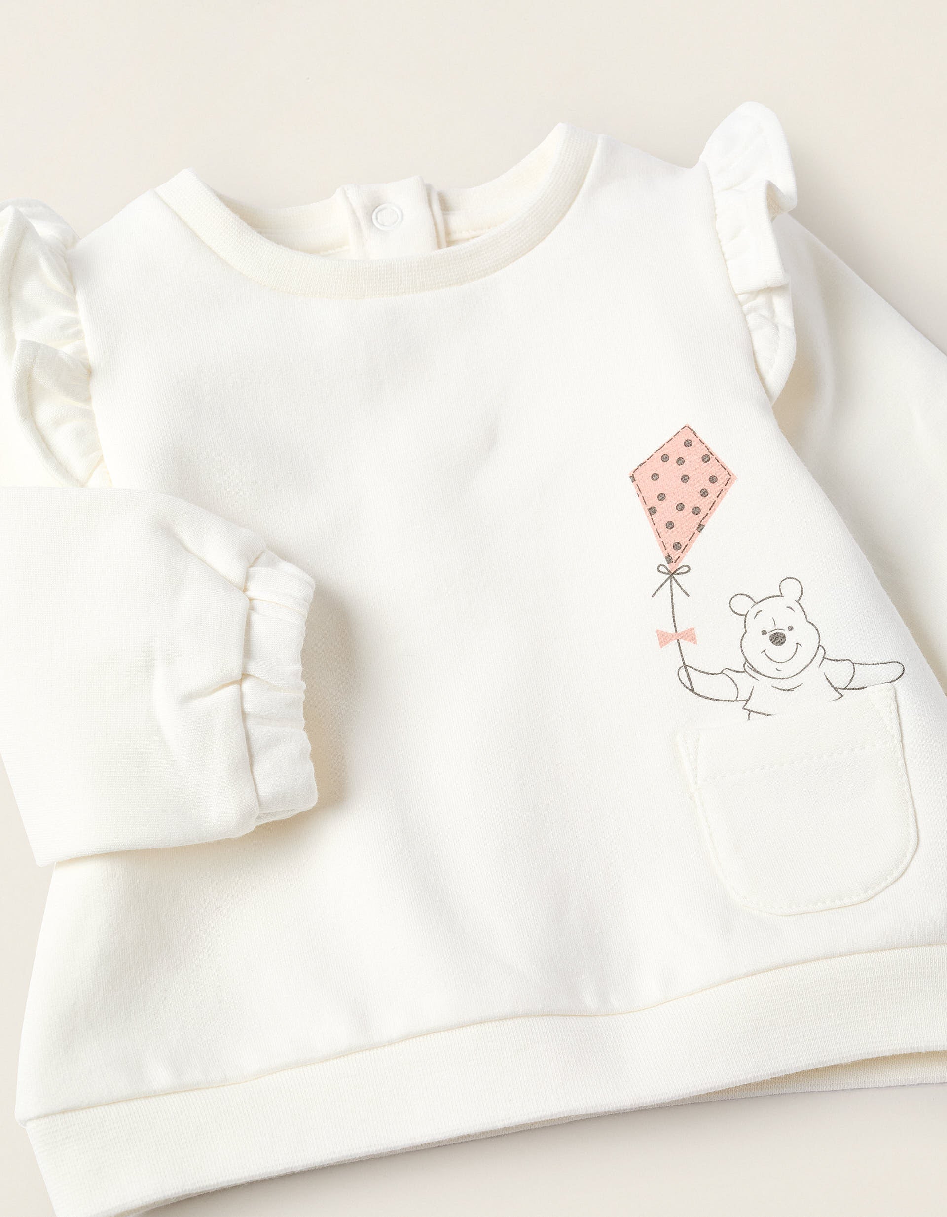 A two-piece set for newborns, with a brushed interior for extra warmth. It consists of a white sweatshirt with ruffles around the shoulders, a mini pocket and a Winnie the Pooh print. With press studs on the back for easy dressing; and plain pink trousers with an elasticated waistband and hem. A practical and cosy set, ideal for everyday wear! We Care: item with Oeko-Tex Standard 100 certification, which guarantees the absence of harmful or irritating substances for the skin.