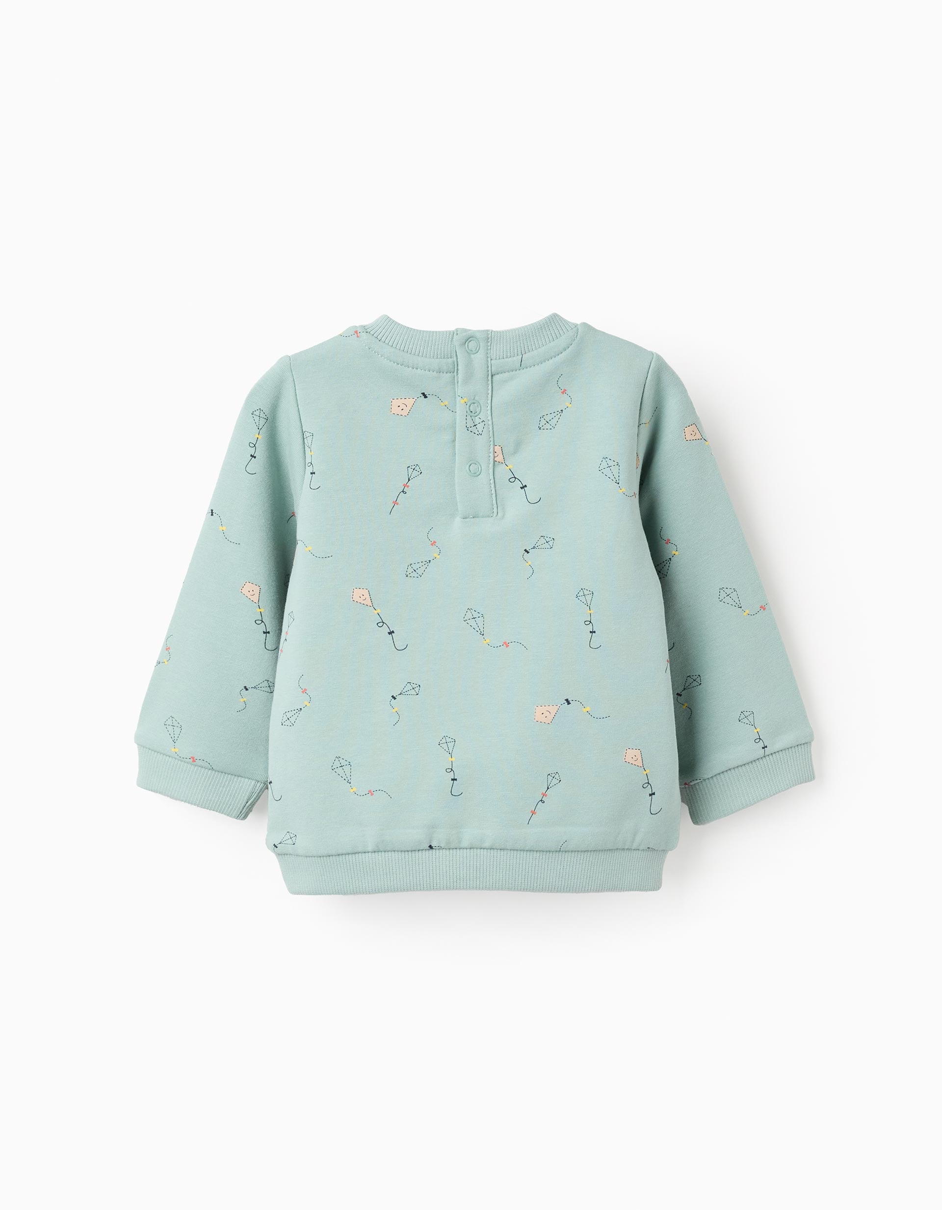 Aqua-green brushed sweatshirt for newborns, with parrot motif. brushed interior for greater thermal comfort. Press studs on the back for easy dressing. Ribbed edges for a perfect fit. Practical and cosy!