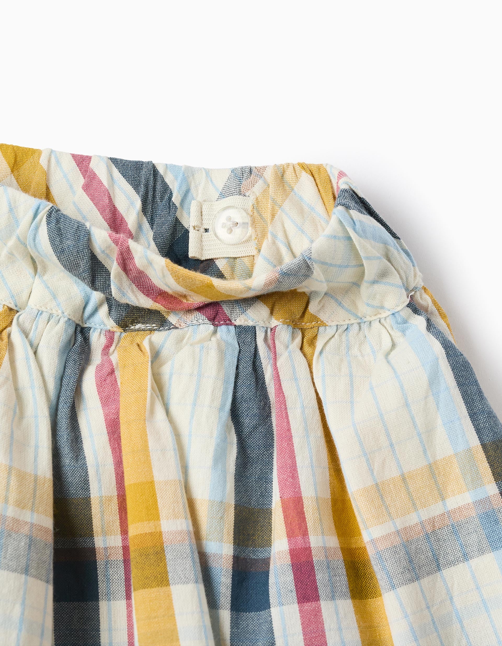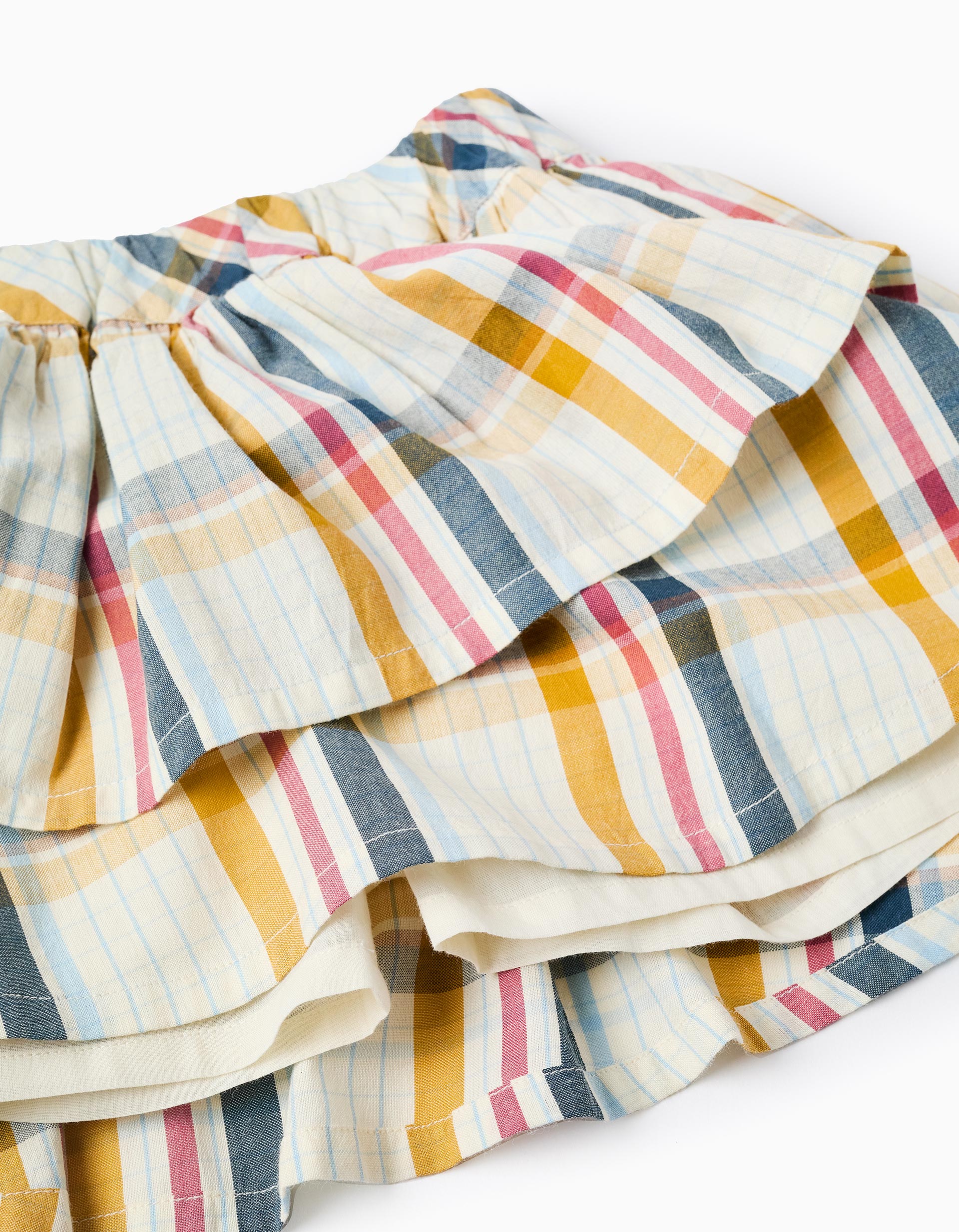Brothers & Sisters collection. Ruffled skirt with checkered pattern in white, yellow, blue and red tones for girls. 100% cotton. Elastic and comfortable waist, adjustable on the inside. Shorts lining, for greater practicality and comfort. A colourful and original pattern for matchy-matchy looks among brothers and sisters!