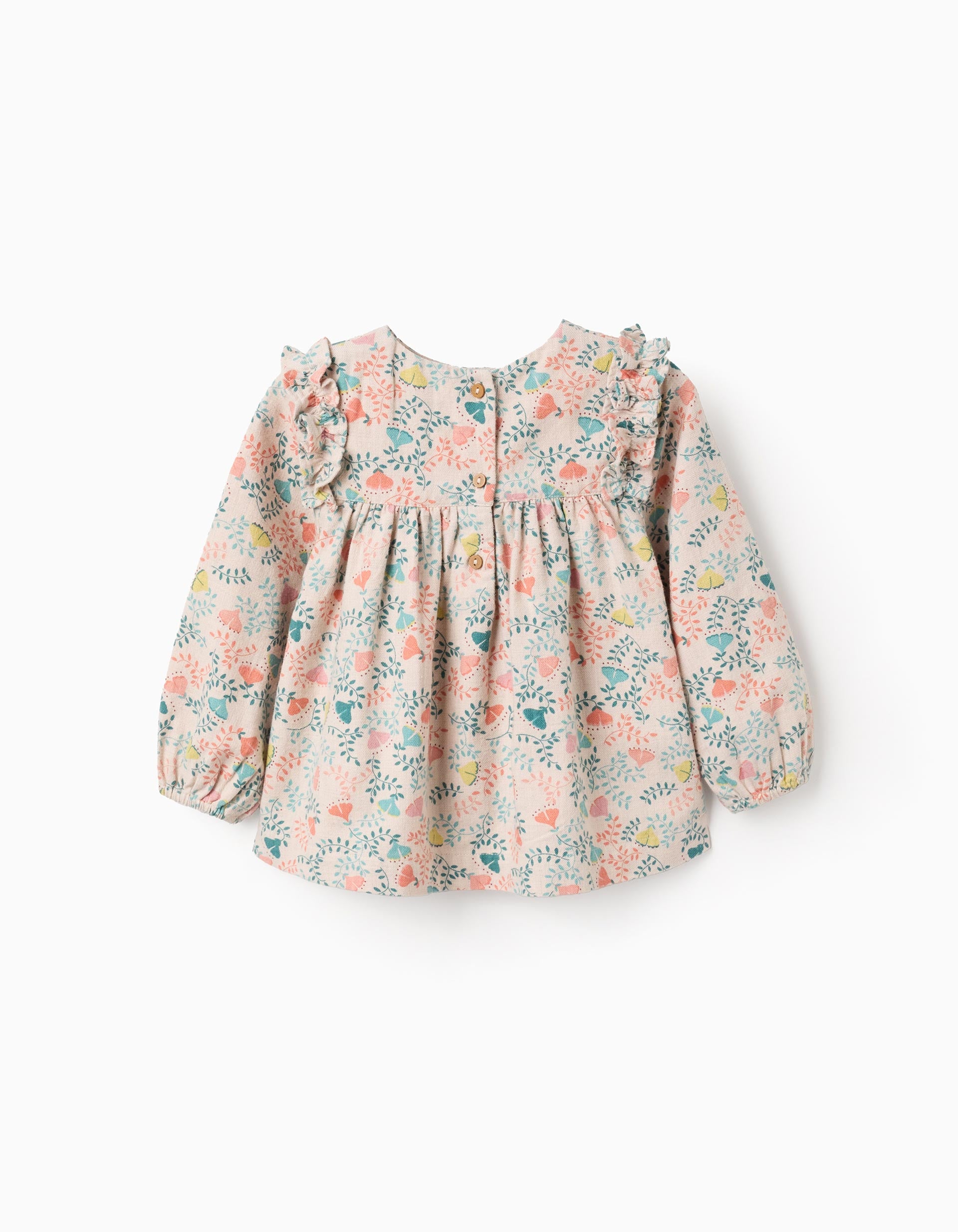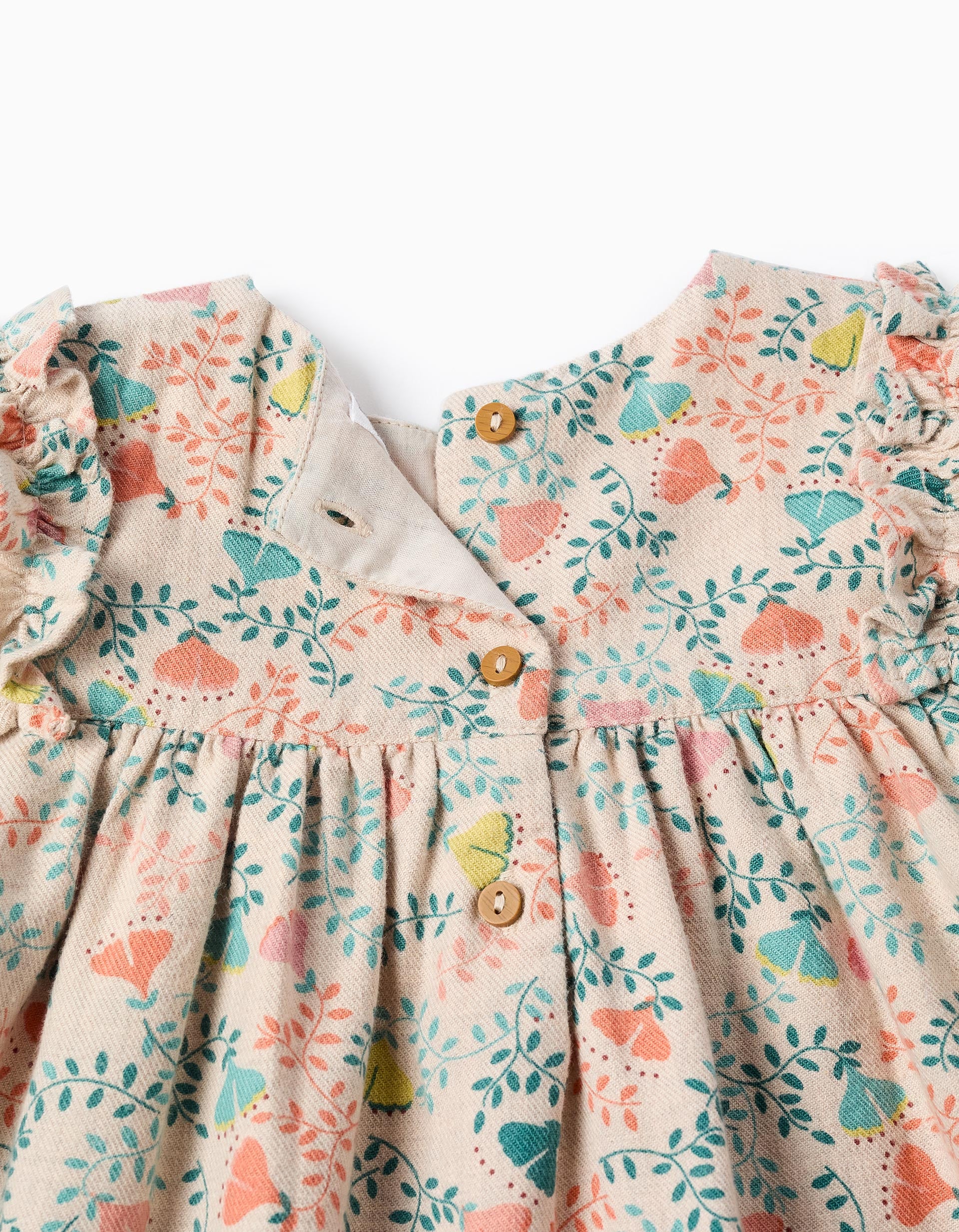 Beige twill tunic with multicoloured floral motif for baby girl. Frills around the shoulders. Gathered chest seam and evasé cut. Buttons on the back for easy dressing. Elasticated cuffs for a perfect fit. A vintage motif for unique looks!