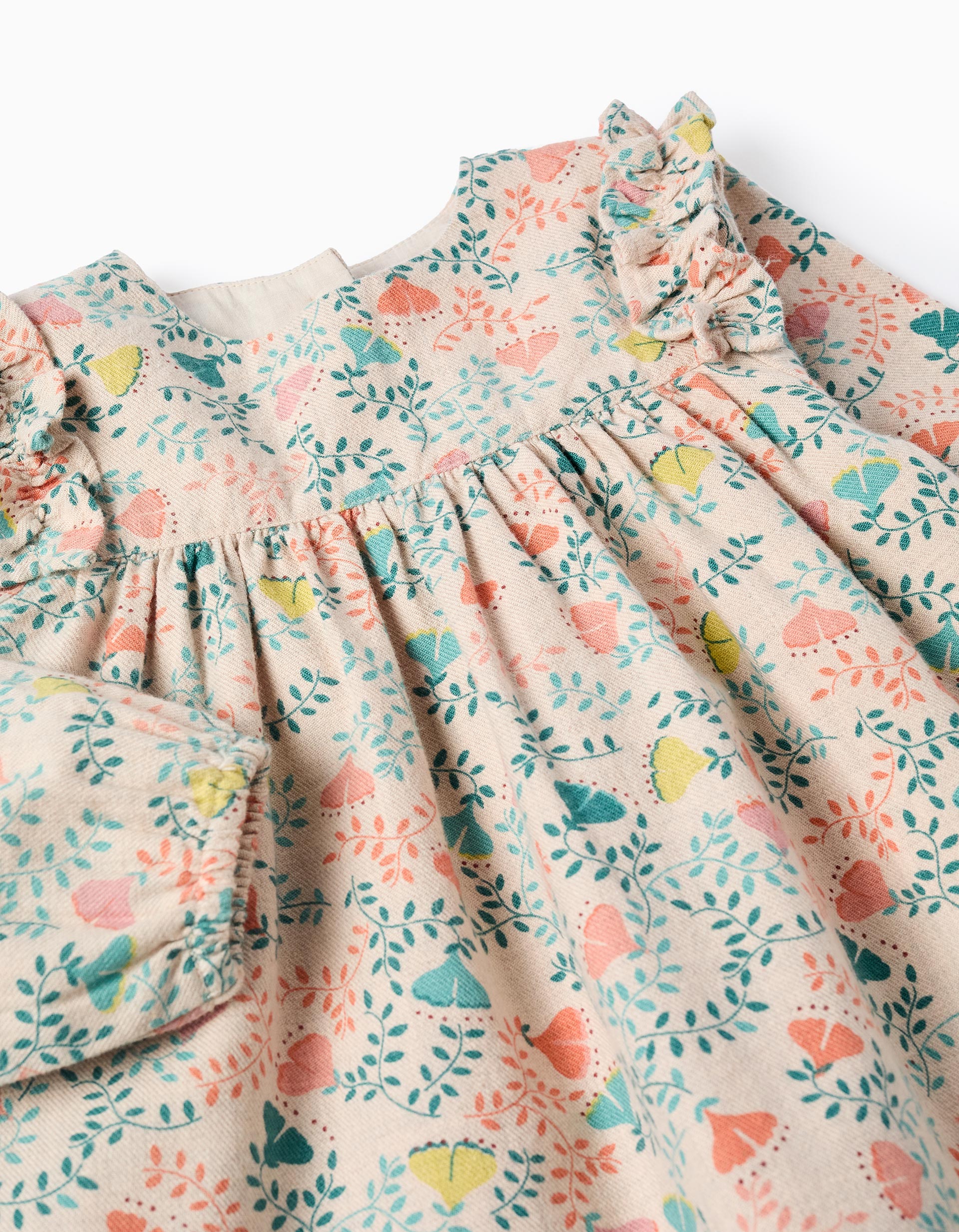 Colourful Floral Motif Twill Tunic for Baby Girls, Beige