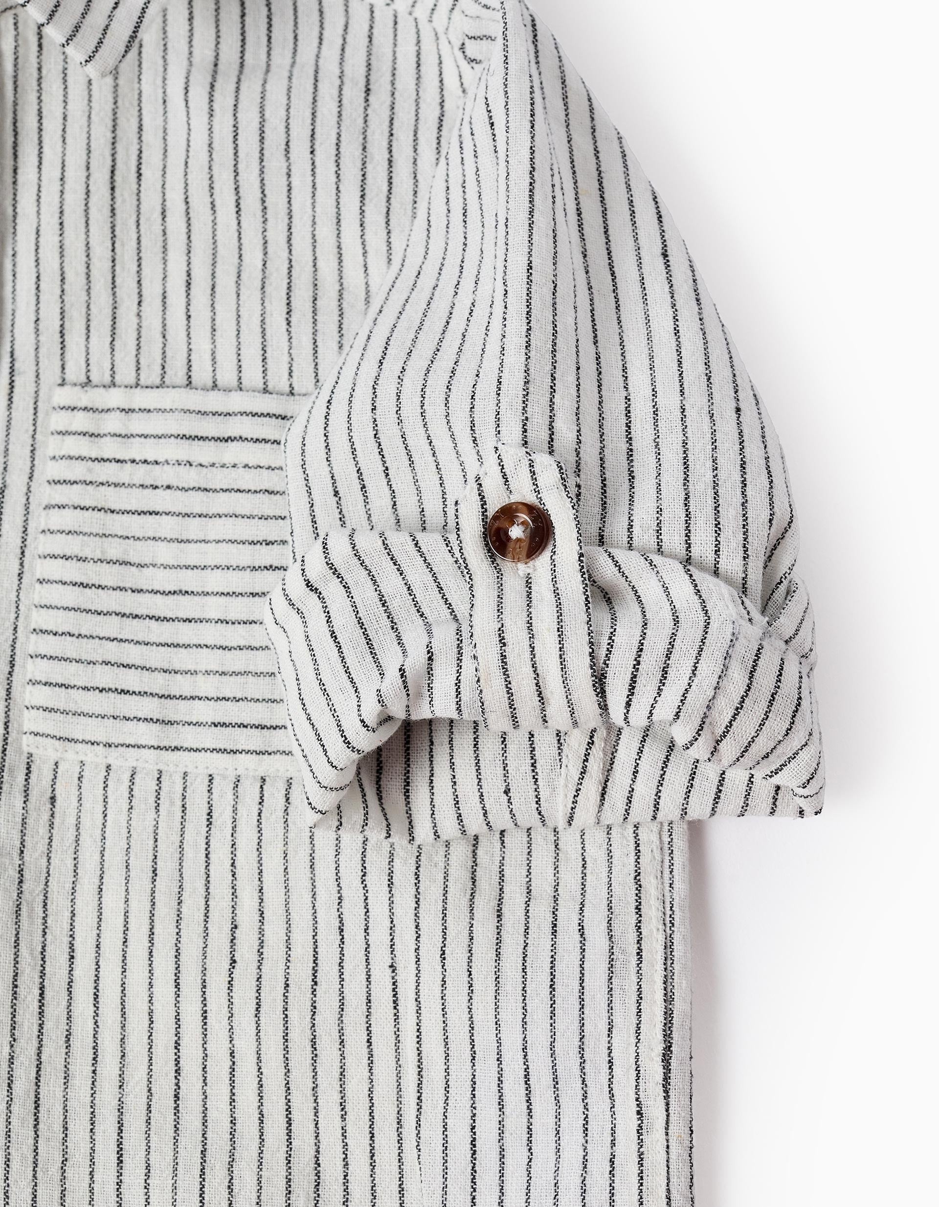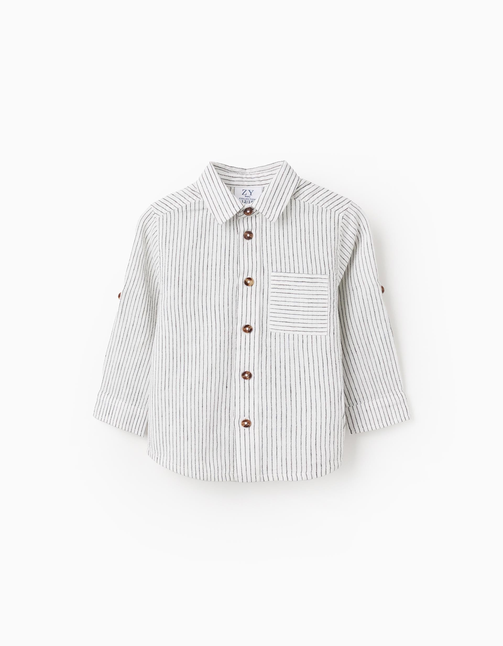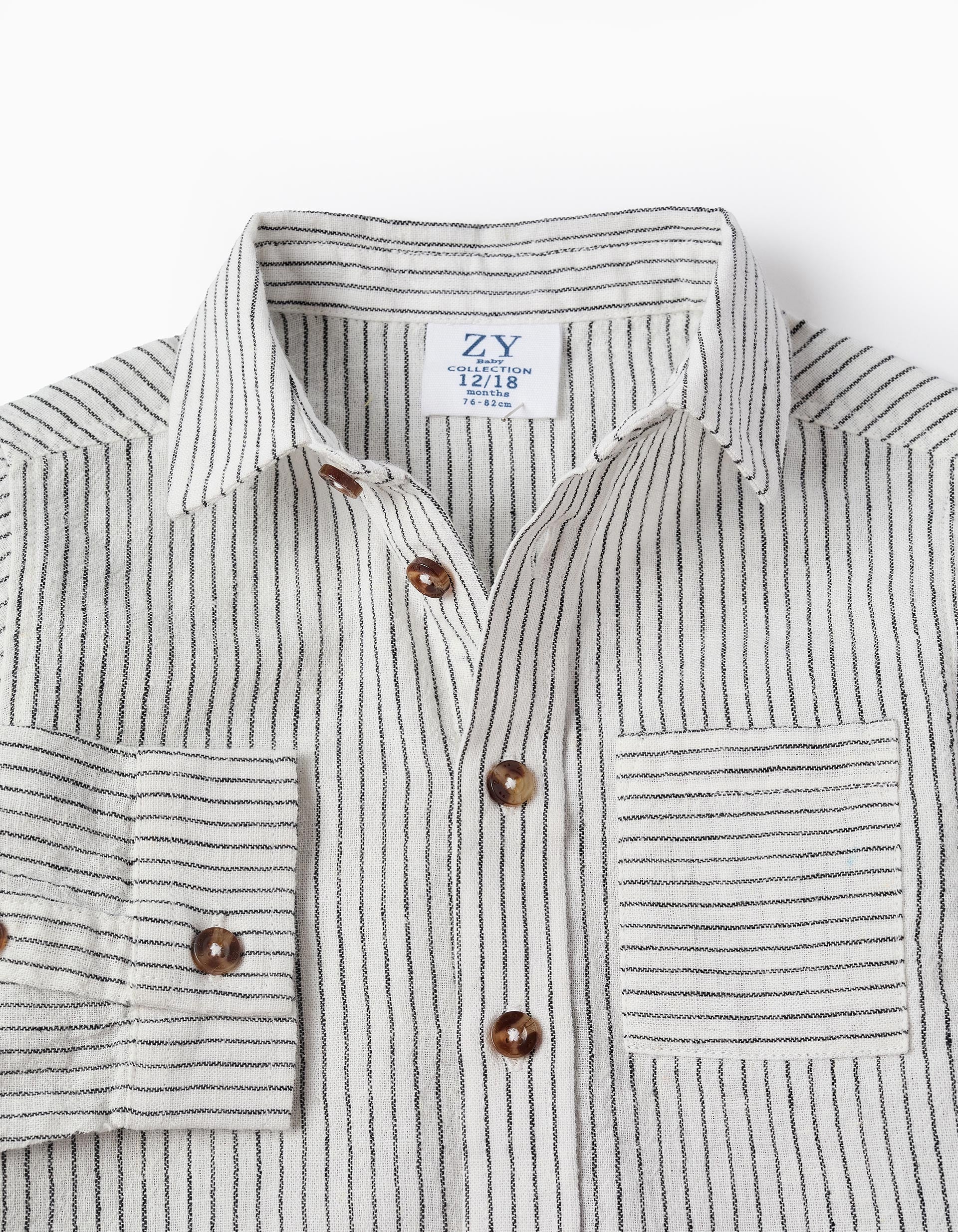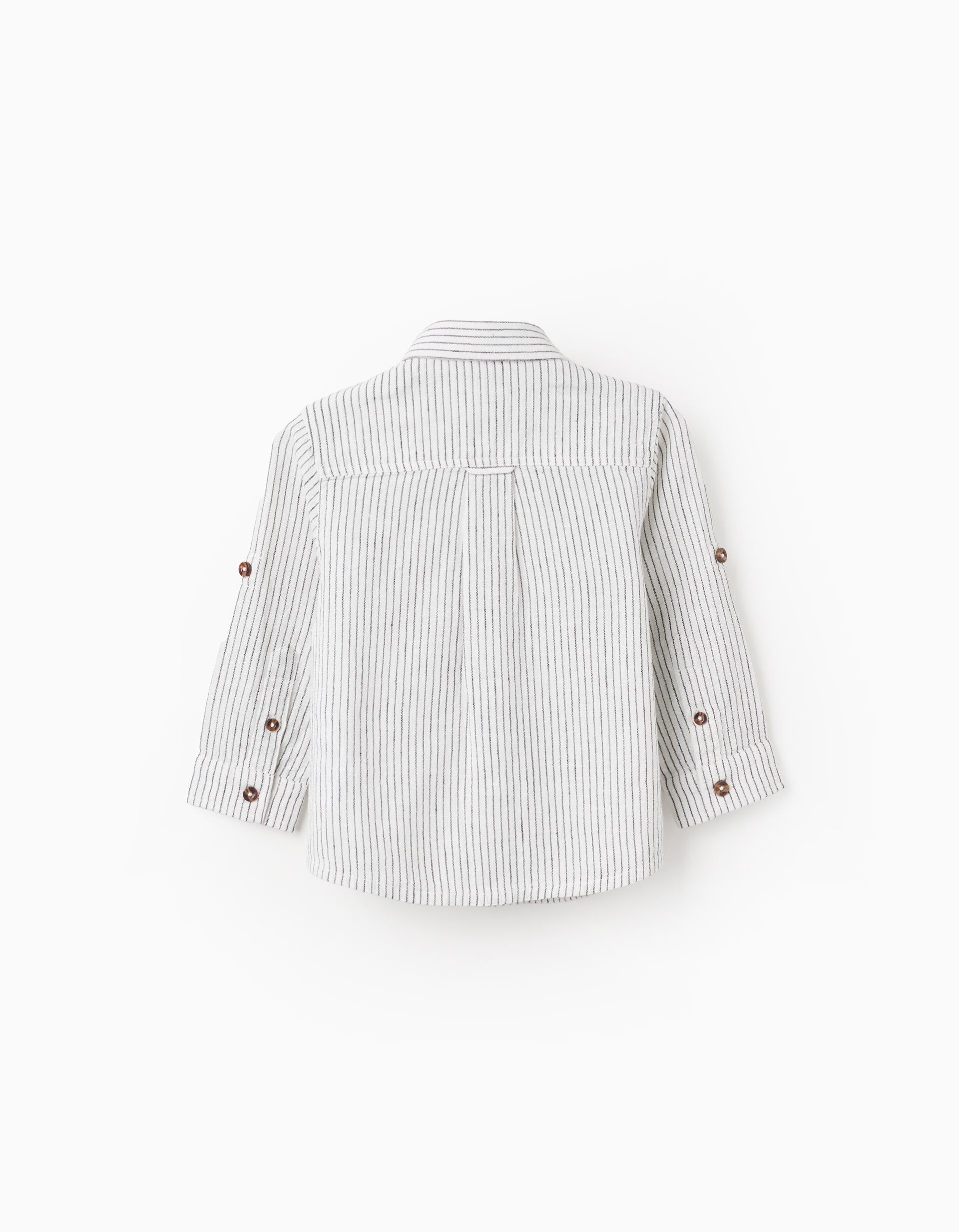 White long-sleeved shirt for baby boys, in a blend of cotton and linen. Black vertical stripes pattern. Chest pocket with horizontal stripes. Turn-up sleeves. Rounded hem. A light and versatile shirt, perfect for the mid-season.