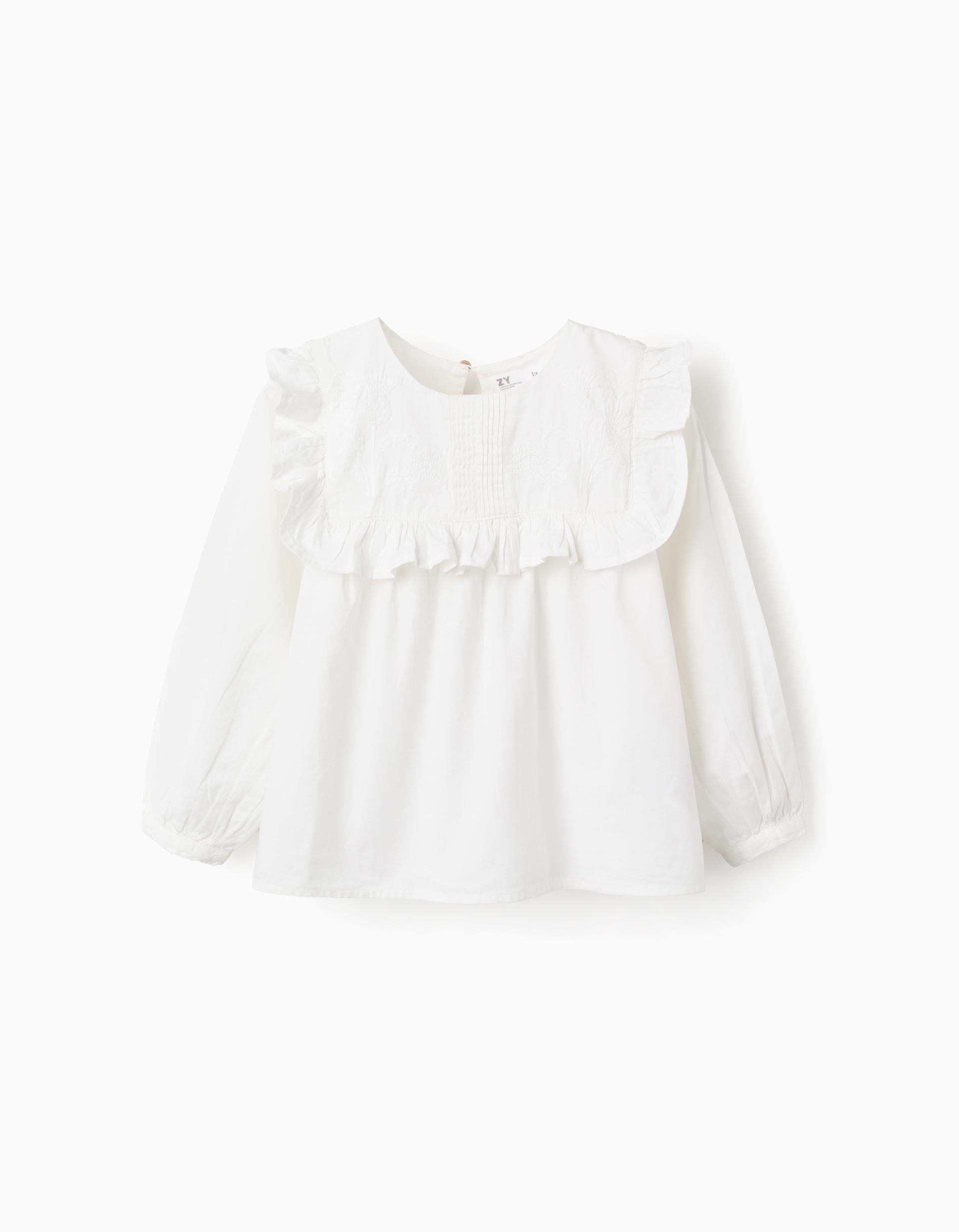 Cotton Blouse with Ruffles and Embroidery for Girls, White