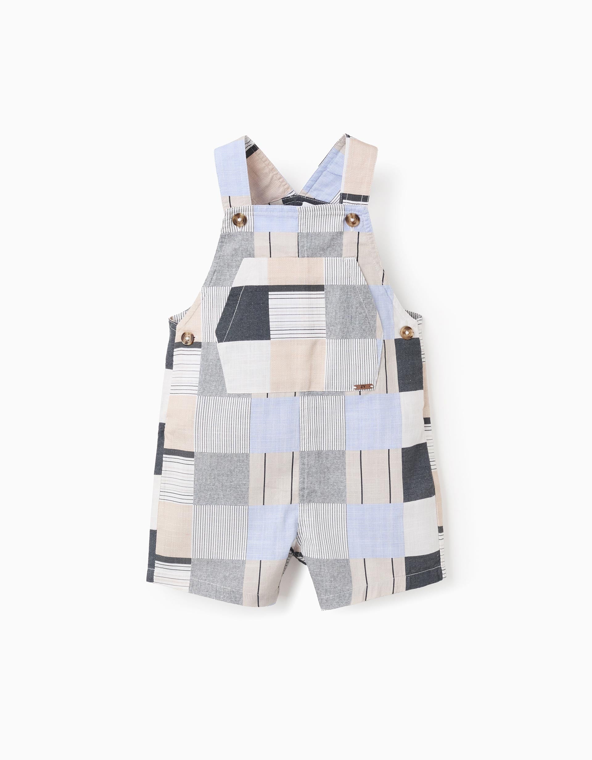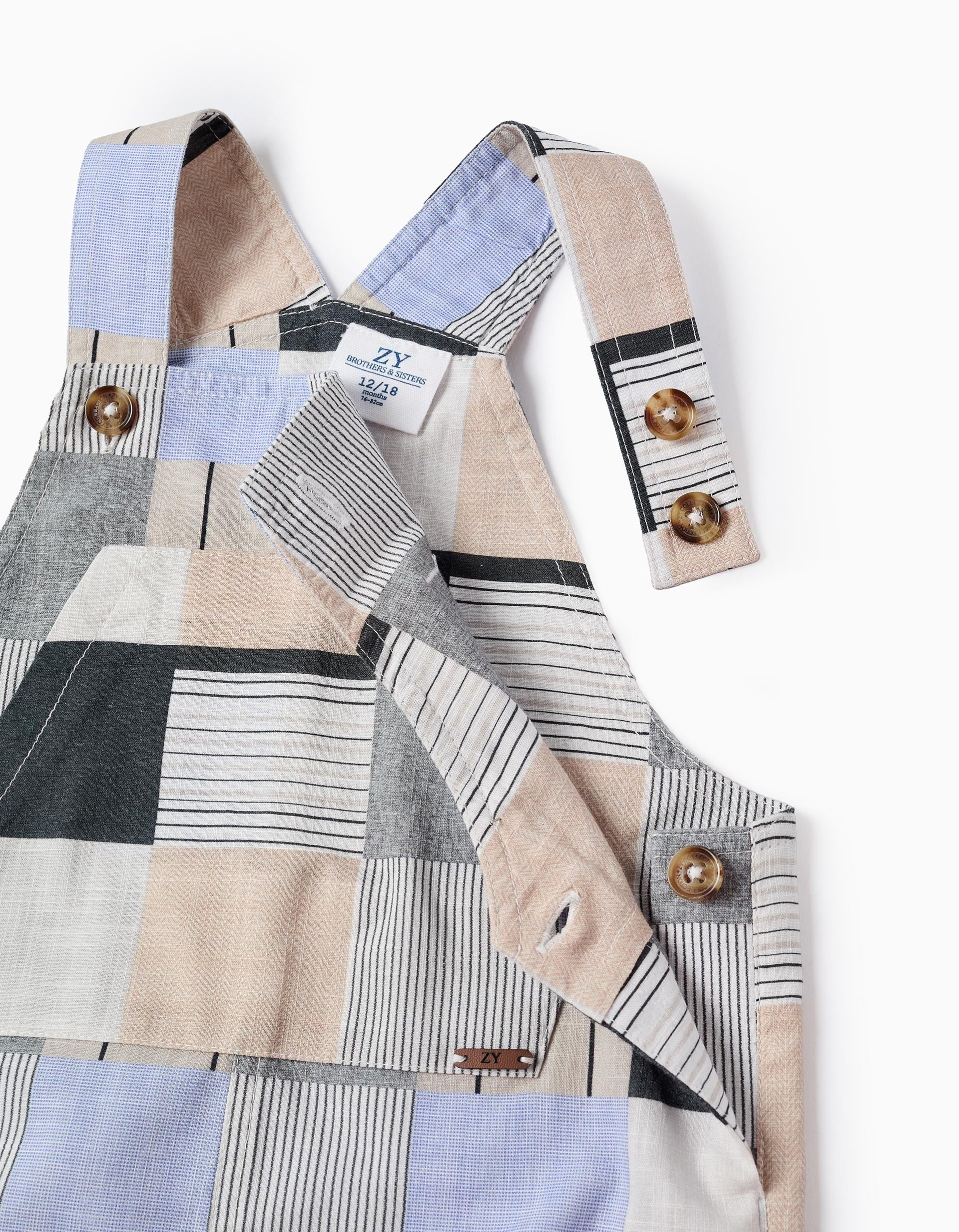 Brothers & Sisters Collection. Original patterned dungarees in shades of beige, grey, and blue for baby boys, 100% cotton. Chest pocket. Adjustable straps. Side buttons for a perfect fit. A classic and elegant option to combine with other items from the same collection!