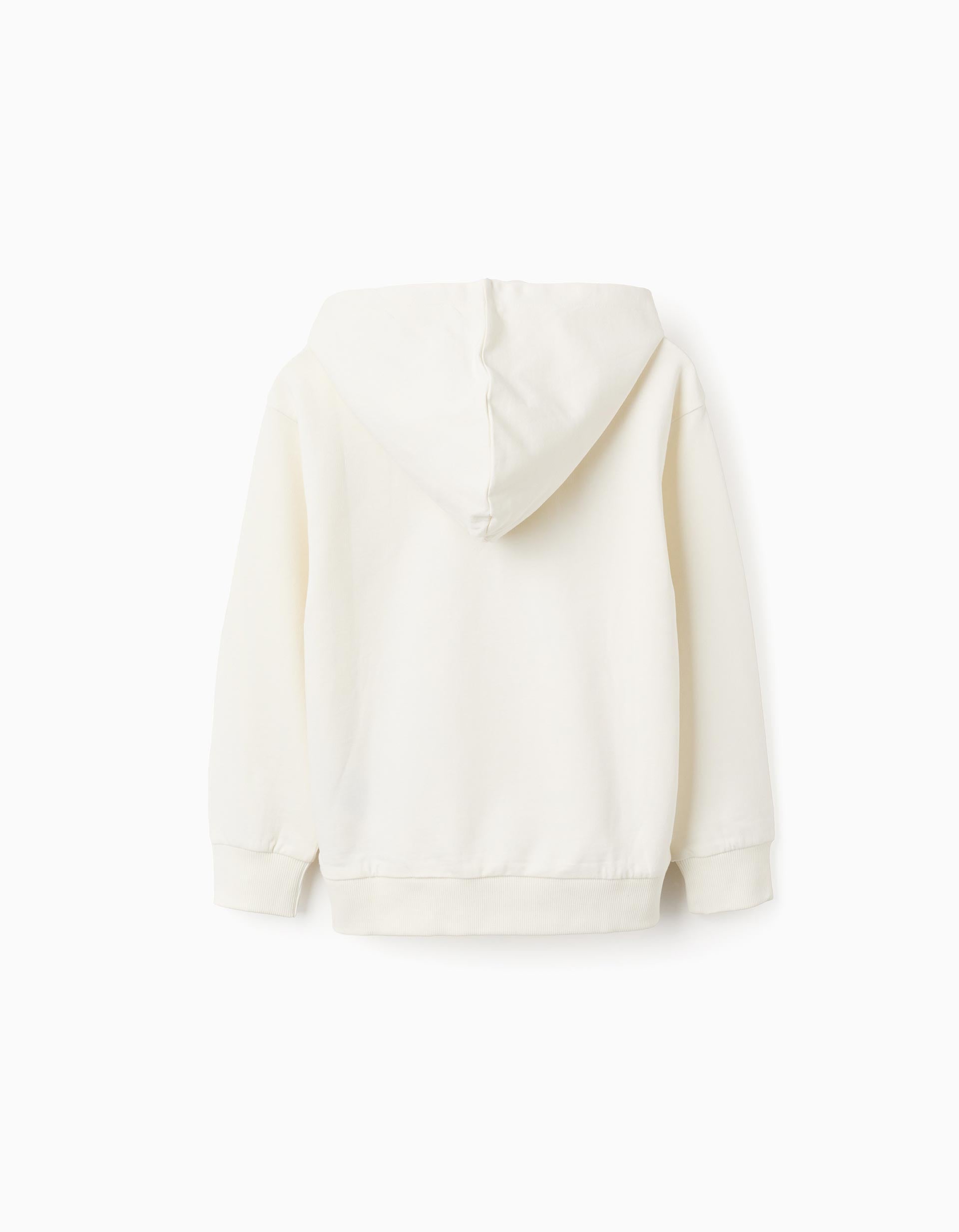 White sweatshirt with hood for boys, 100% cotton. Front print and kangaroo pocket. Ribbed cuffs for a perfect fit. For gaming fans!