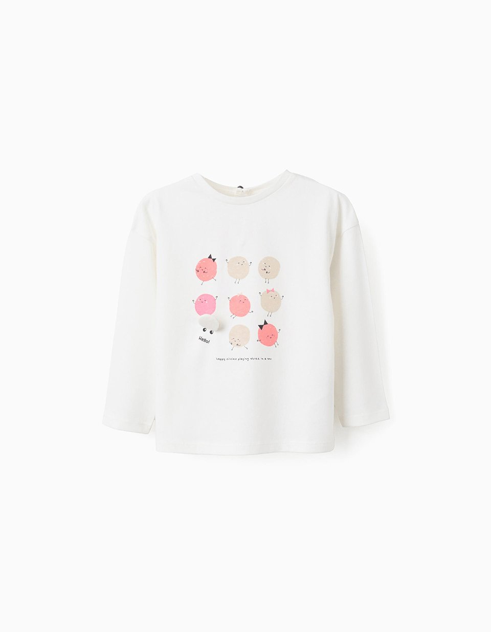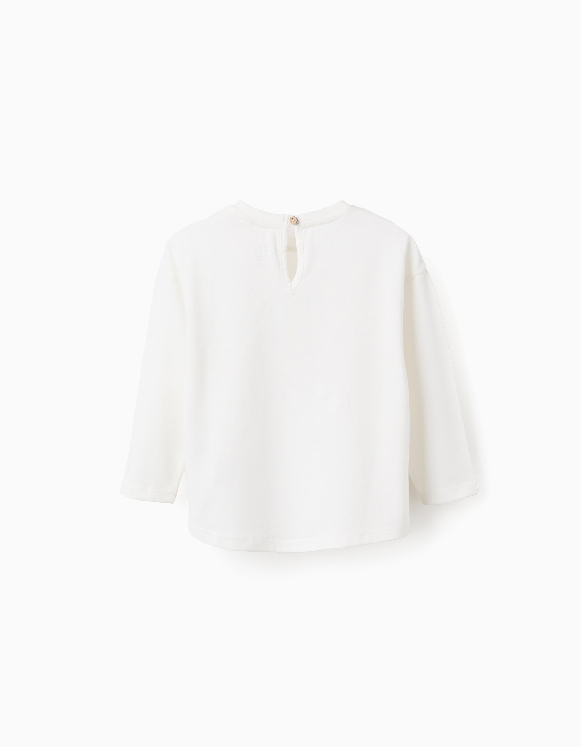 White long-sleeved T-shirt for baby girls, 100 per cent cotton. Front print with fun 3D detail. Asymmetrical base, slightly longer at the back. Button at the back for easy dressing. Printed inner label so as not to irritate the skin. A fun print for everyday looks! We Care: item with Oeko-Tex Standard 100 certification, which guarantees the absence of harmful or irritating substances for the skin.