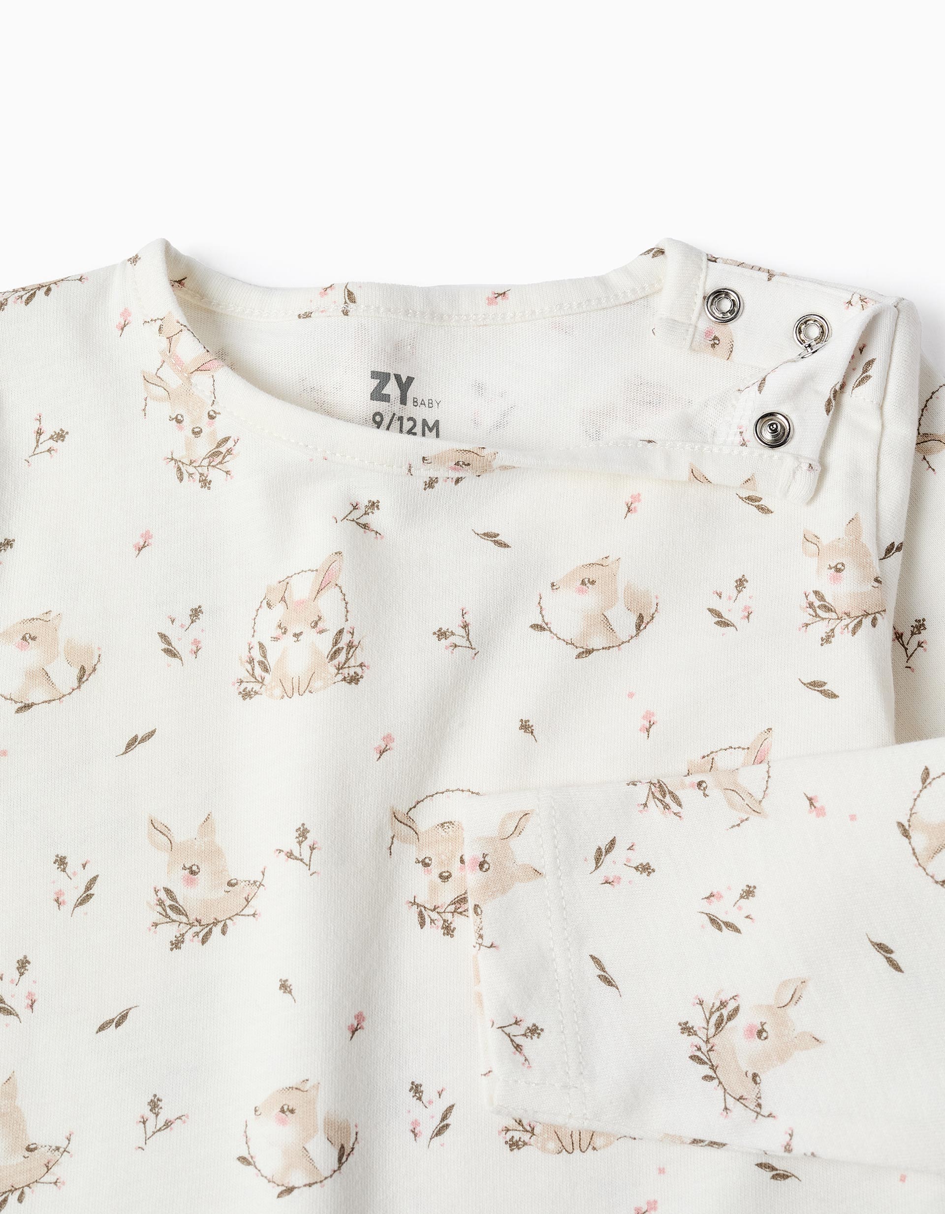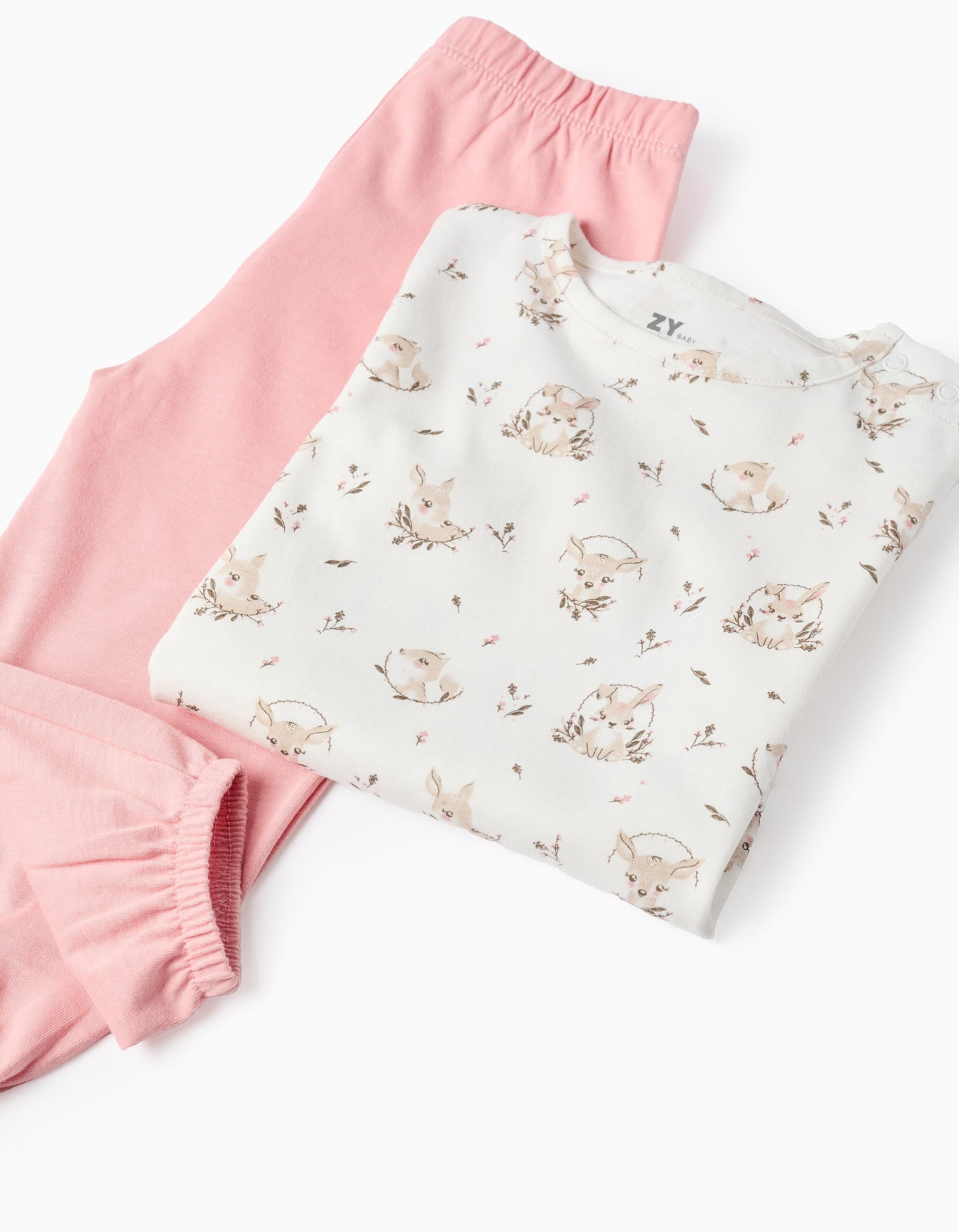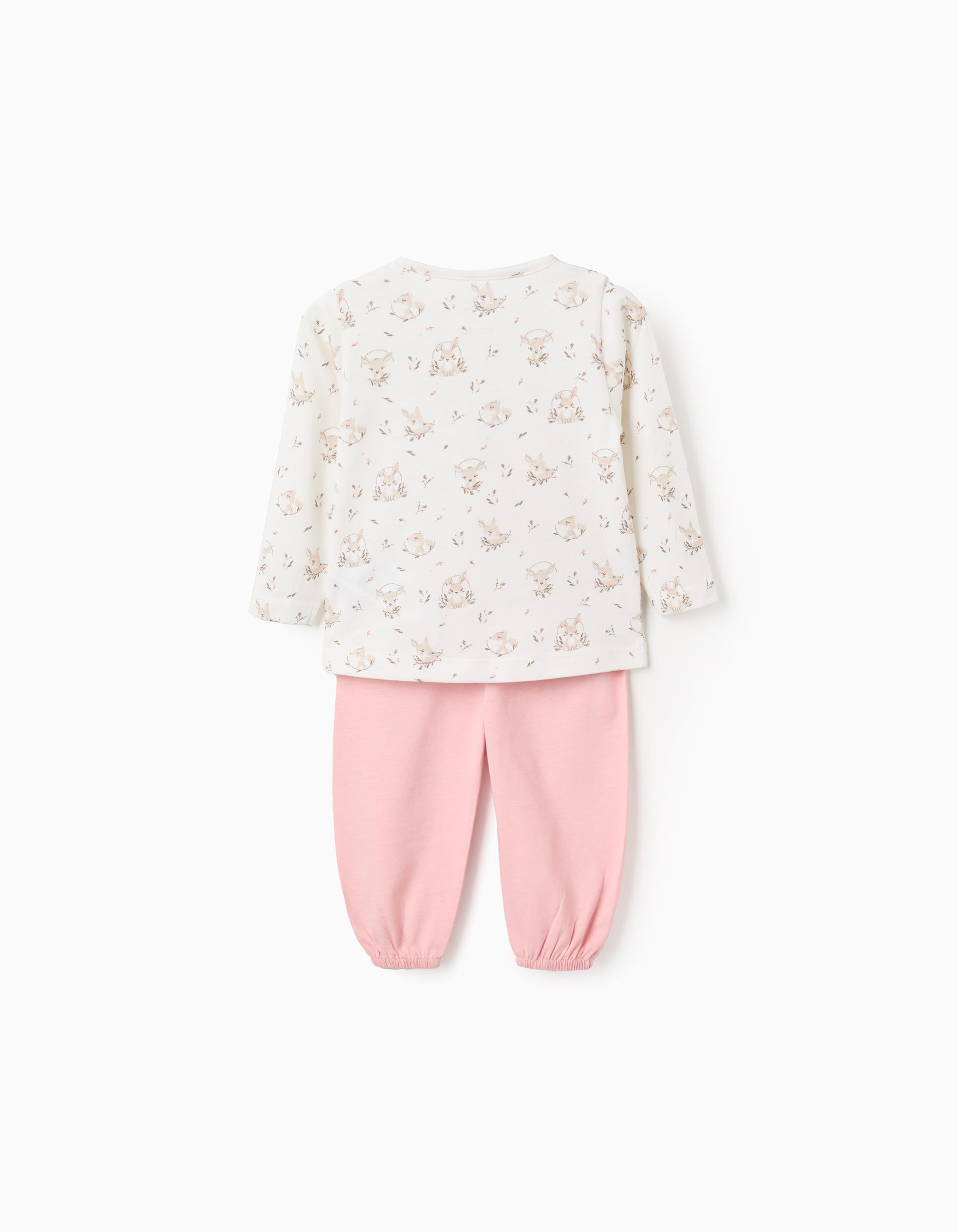 Cotton pyjama in shades of white and pink for baby girls. 100% cotton. It consists of a long-sleeved t-shirt with a motif of rabbits and other forest animals; and plain trousers with elasticated hems for a perfect fit. Printed inner labels to avoid irritating the skin. A soft and fun pyjama!