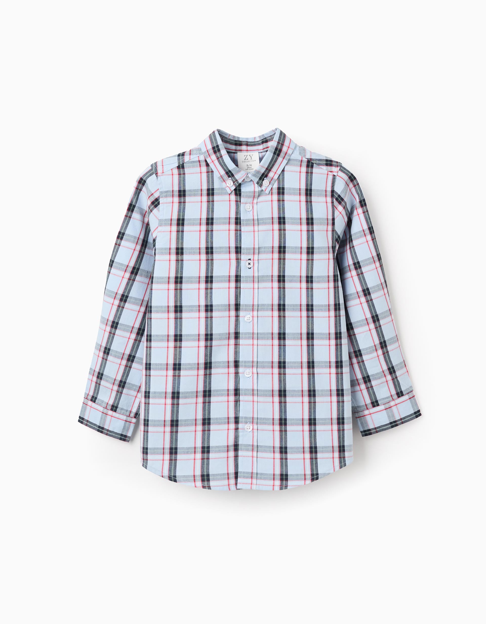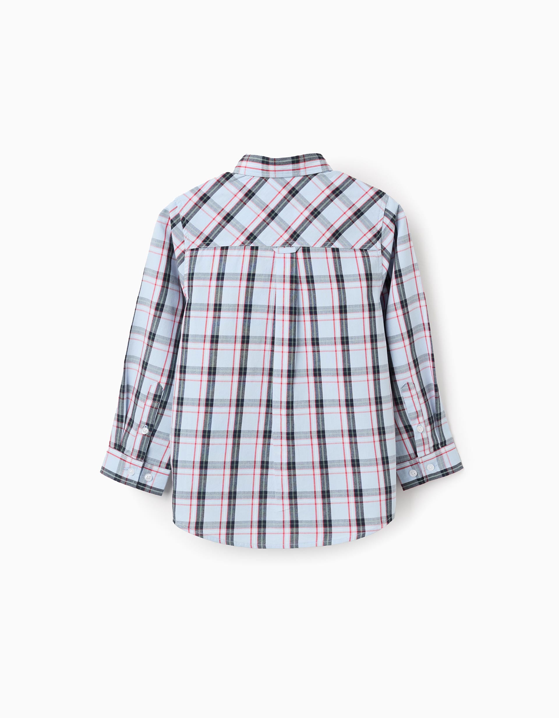 Long-sleeved shirt for boys, 100% cotton, with a checkered pattern in shades of blue, red, green, and black. Rounded base. For a classic and timeless style! Big Me: a button with contrasting thread and buttonhole so the child can easily identify where to start buttoning, promoting their autonomy.