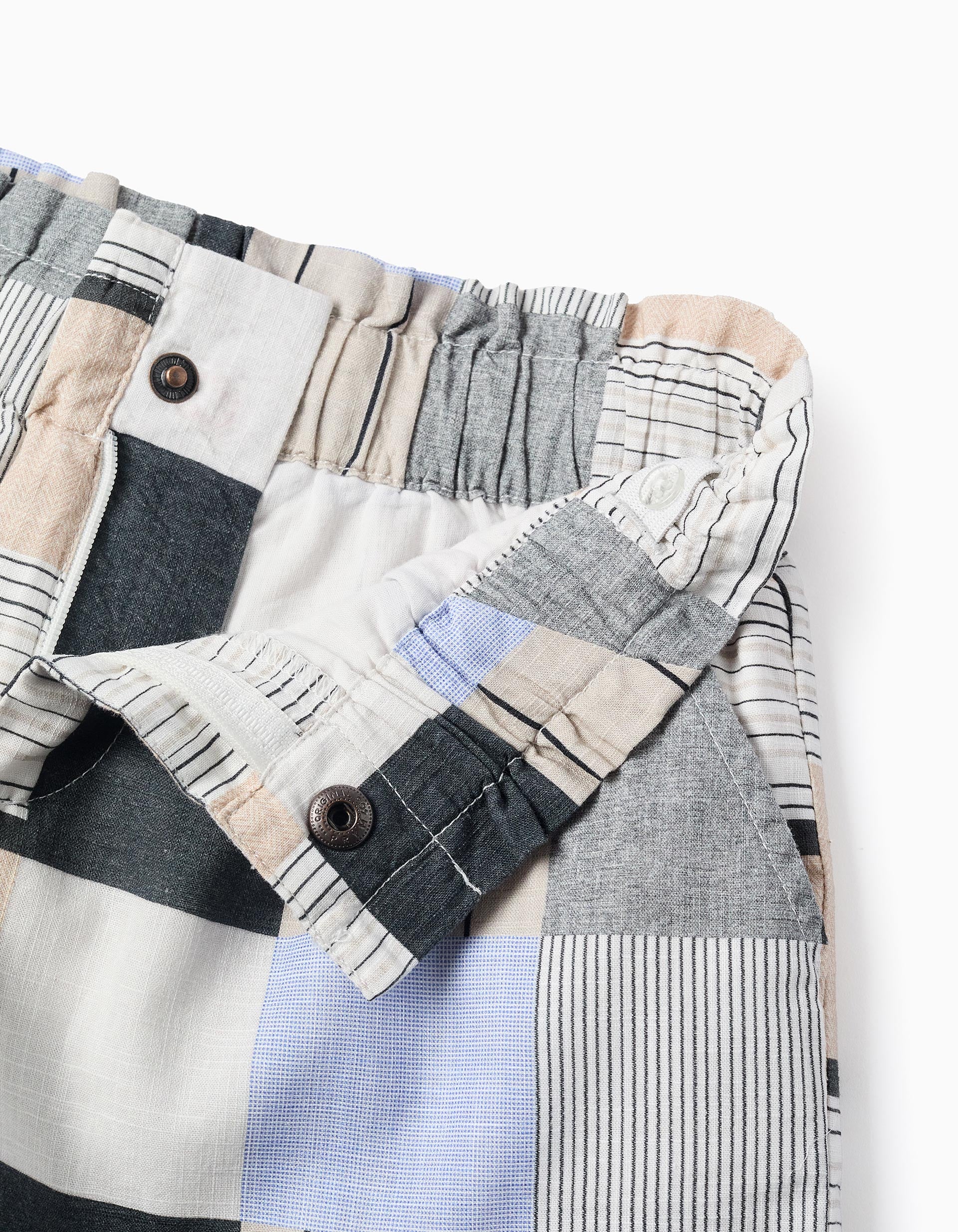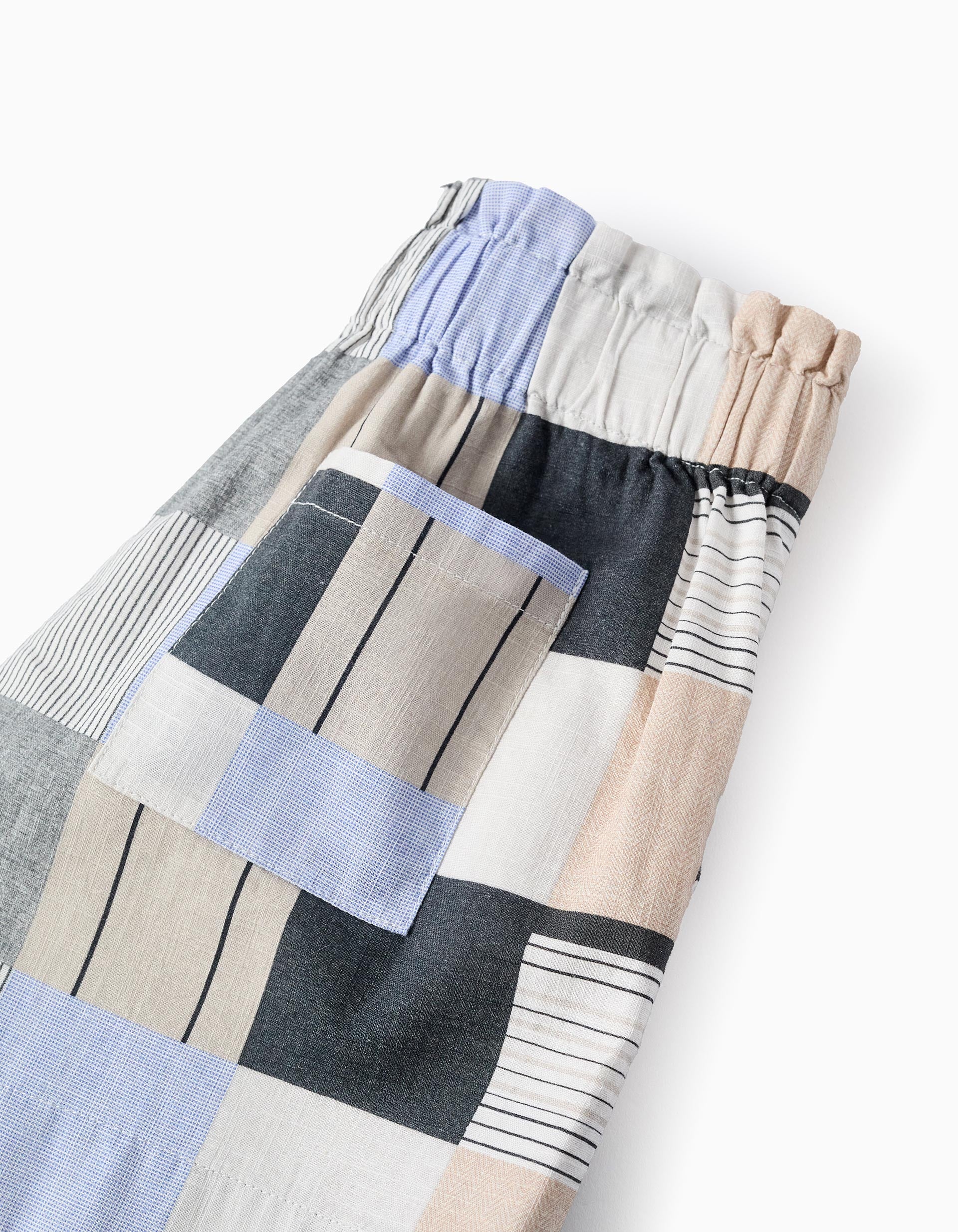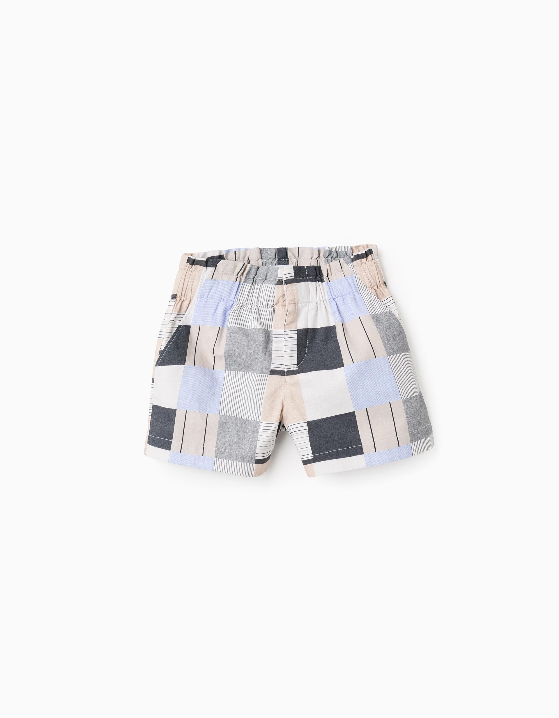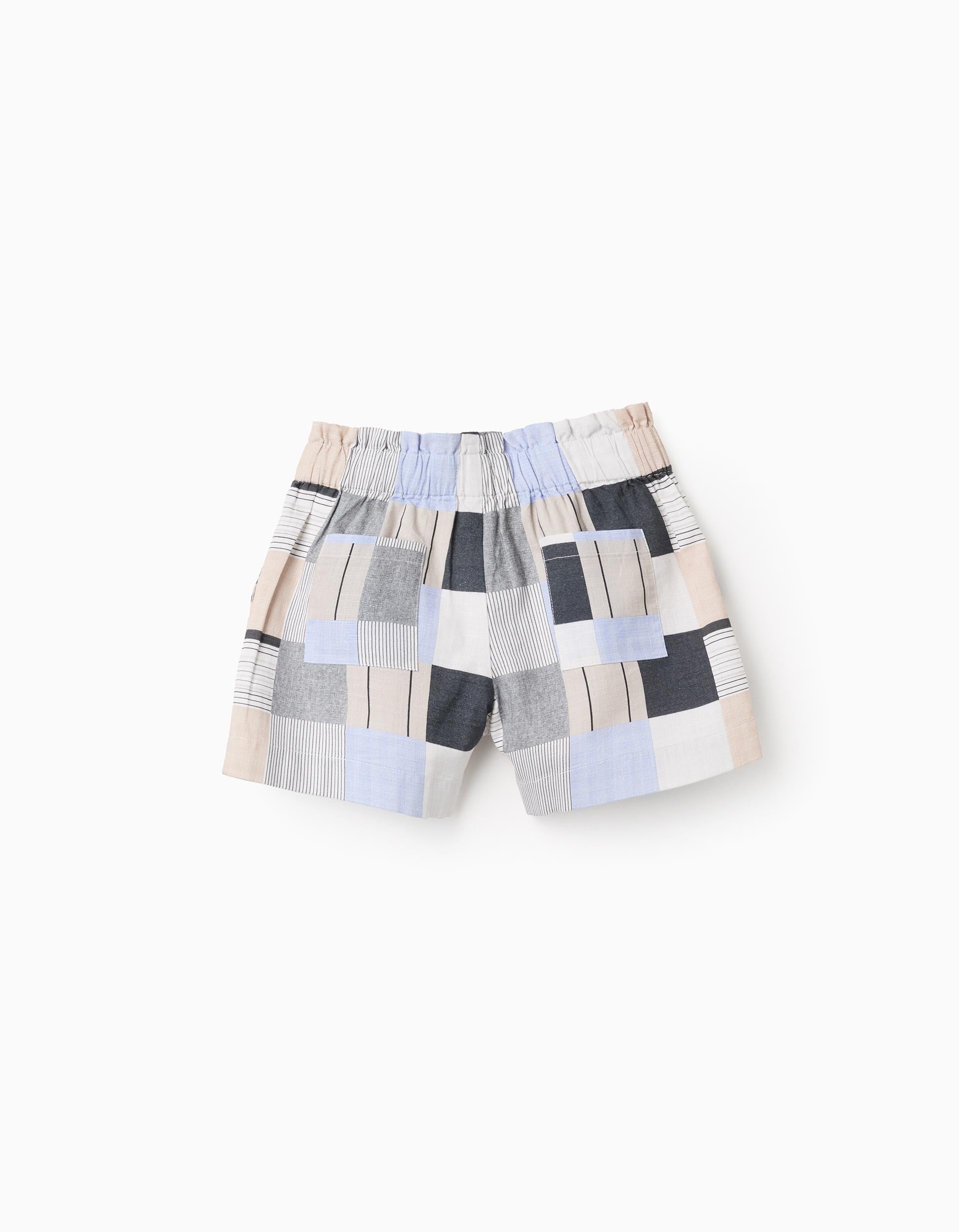 Brothers & Sisters Collection. Original pattern shorts in shades of beige, grey, and blue for girls, 100% cotton. Elastic waist, adjustable inside with elastics and buttons. Side pockets and back pockets. A classic and elegant option to combine with other items from the same collection!
