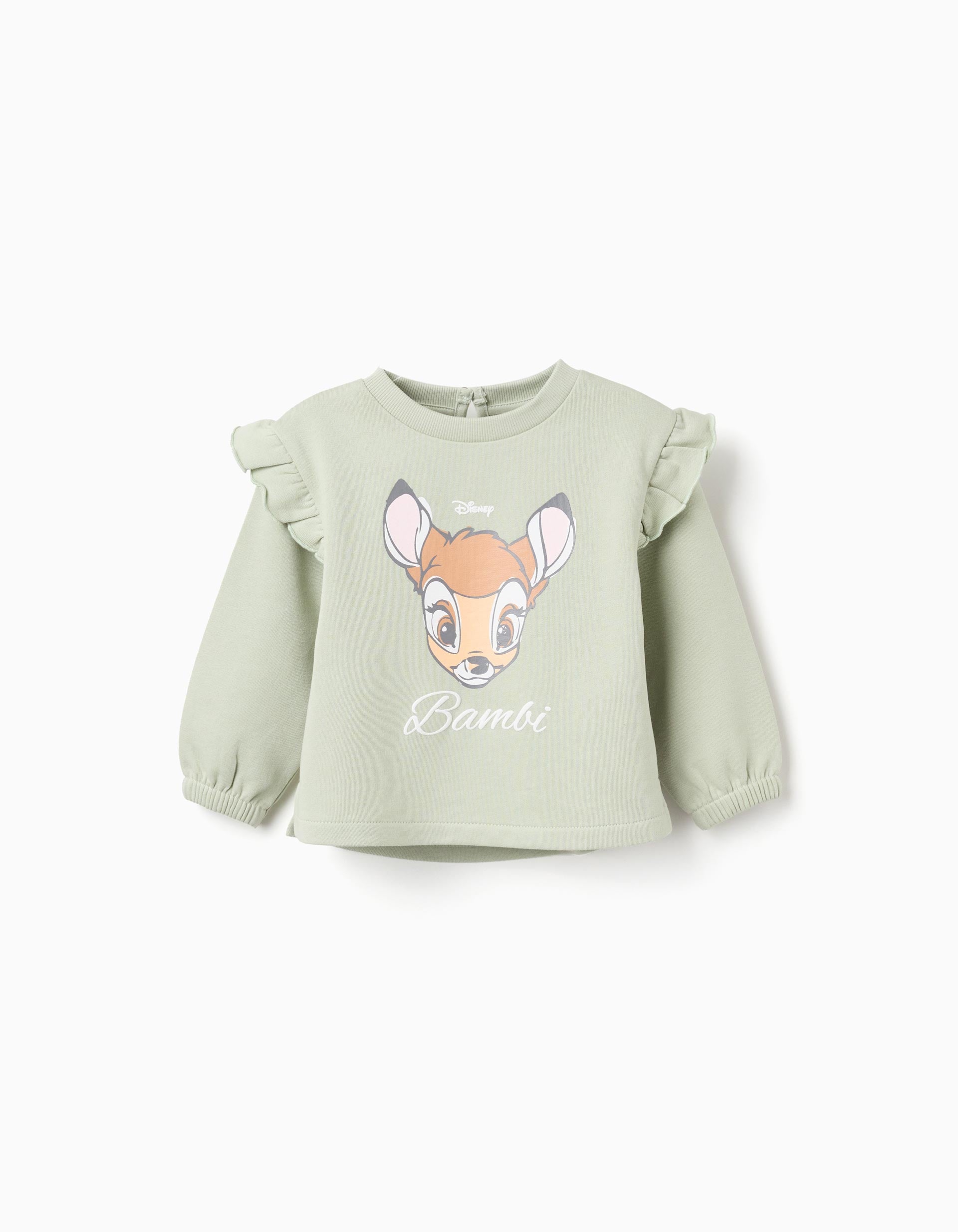 Green sweatshirt for baby girls, 100% cotton. With Bambi print on the front. Ruffles around the shoulders for a touch of style. Ribbed collar and elastic cuffs for a perfect fit. Rounded hem with small side slits. Fastens at the back with a button. The perfect sweatshirt for little girls who love Bambi!