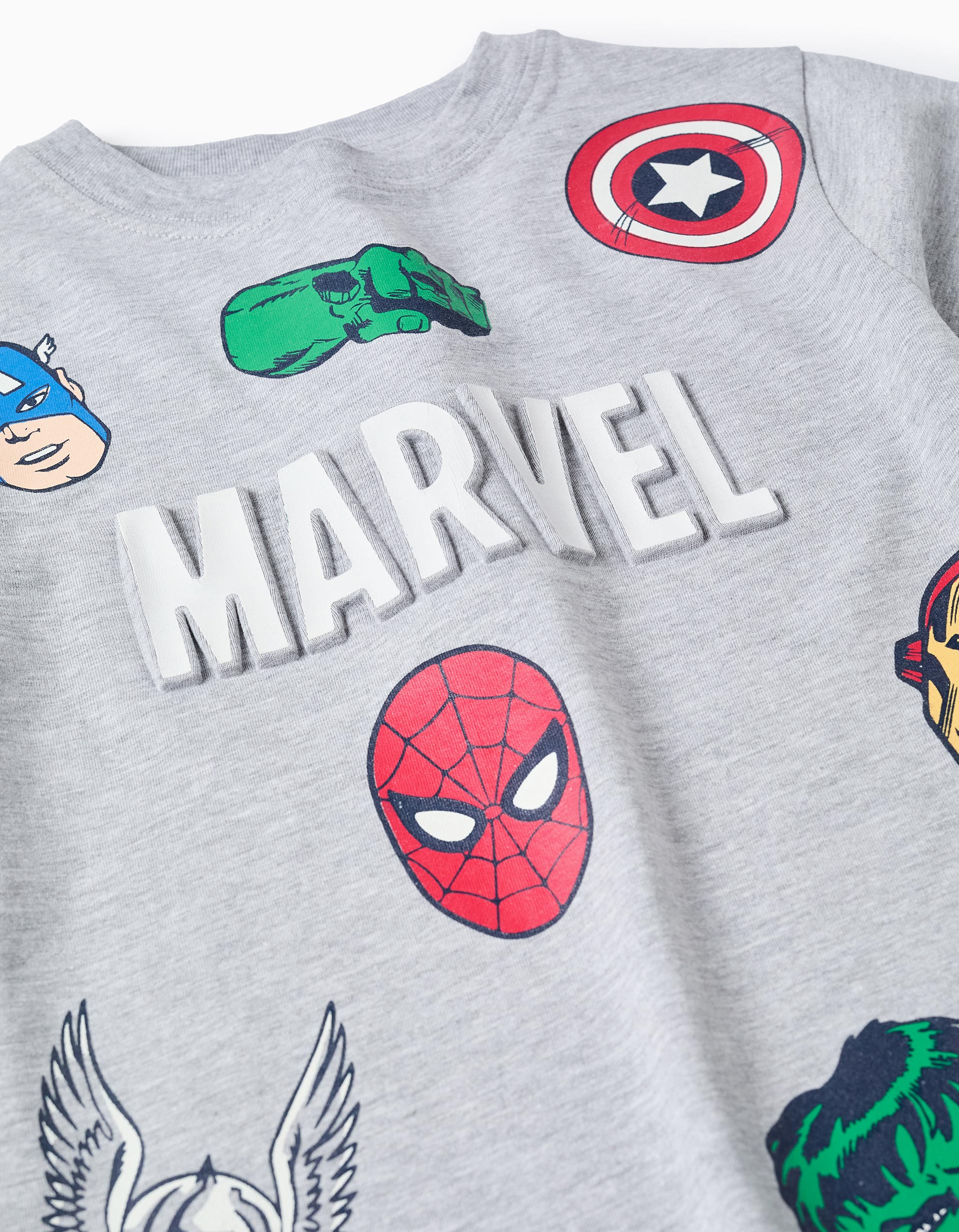 Grey short-sleeved T-shirt for boys, 100% cotton, featuring a design of the Avengers, namely Captain America, Iron Man, Thor, and Hulk. Raised letters. Printed inner label to avoid irritating the skin. For Avengers fans!