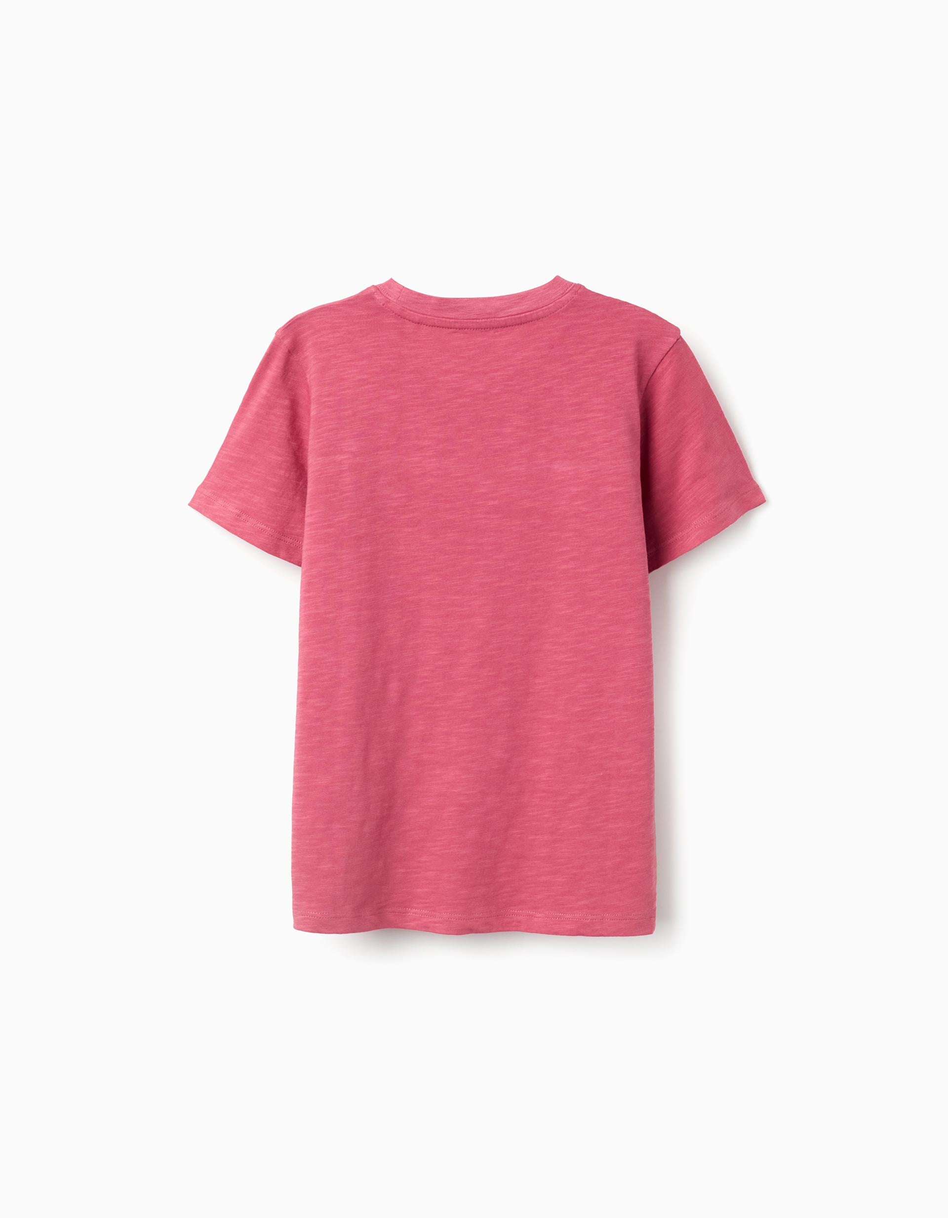 Dark pink T-shirt for boys, 100% cotton. Print on the chest. Ribbed collar. Printed inner label not to irritate the skin. Piece with special dyeing. A versatile and original T-shirt, ideal for hot days!