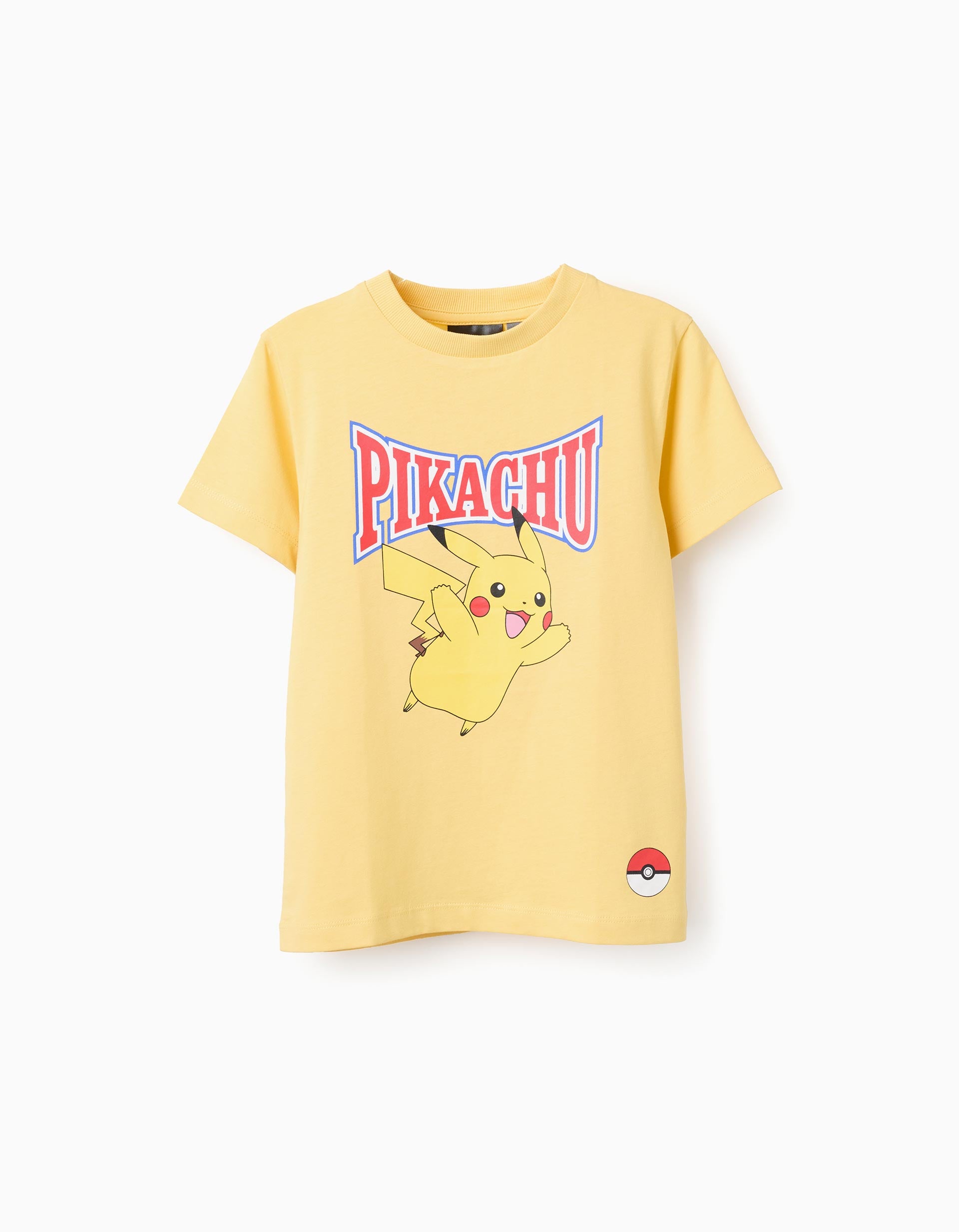 Yellow short-sleeved T-shirt for boys, 100% cotton, with a Pikachu print. Pokémon fans will love it!