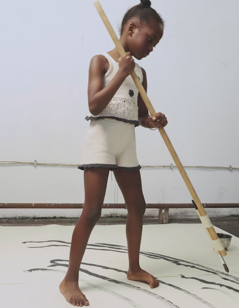 Beige knitted top for girls, 100% cotton. With details of openwork knitting and grey raised crochet flowers. Wavy edges. A lovely and original top!