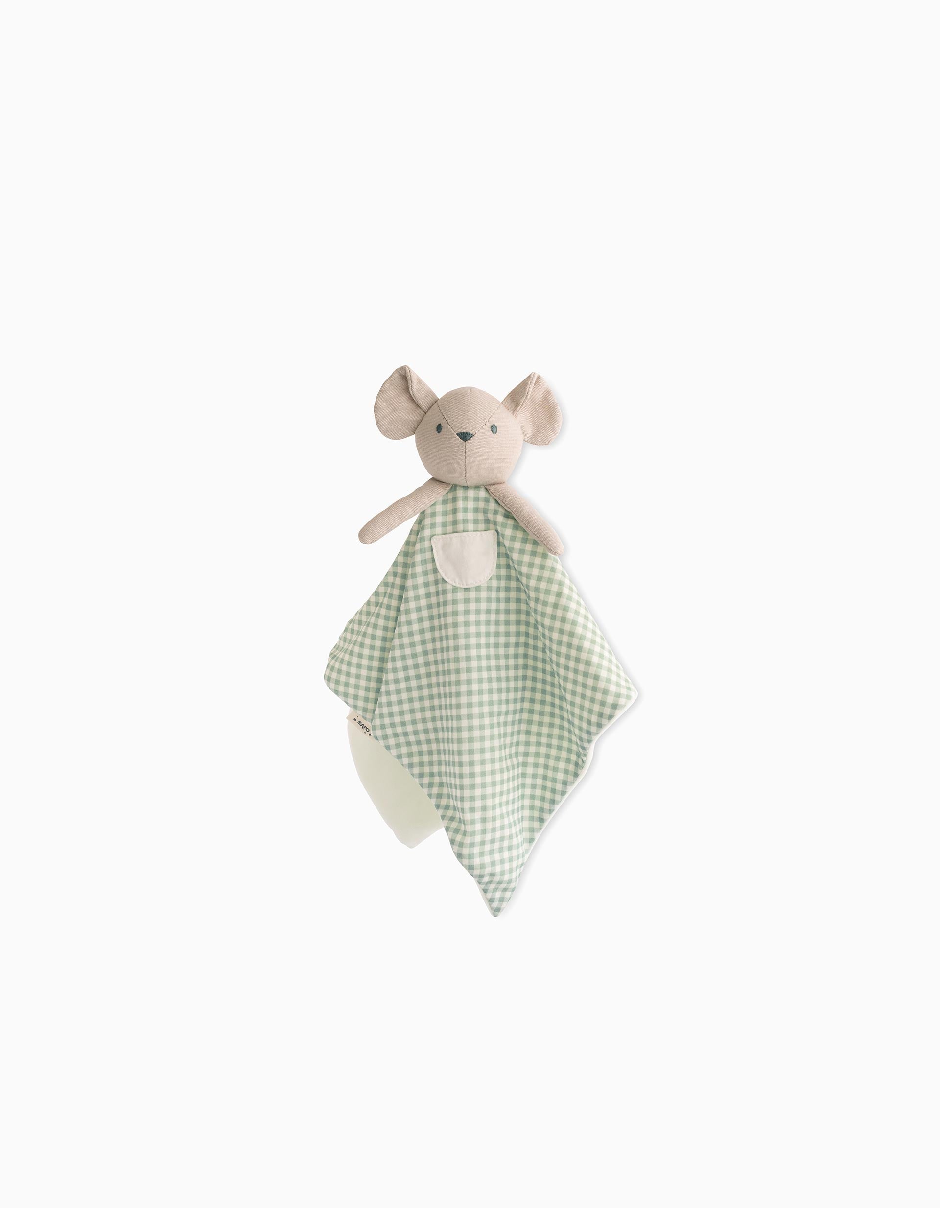 Basil the mouse doudou, an inseparable friend of babies. Soft and relaxing, this original douodu will be a great ally in your child's first months, helping them to rest better, relax, and experience their first moments of play. It will help them feel comforted when mum and/or dad are not around, satisfying the need for contact and affection. An essential toy for developing attachment and calming the baby in the first months of life. Composition: 50% polyester and 50% cotton. Dimensions: 43x35x4cm. Care: machine washable on delicate fabric cycles at 30°C; do not iron; do not use a tumble dryer. Suitable from birth.