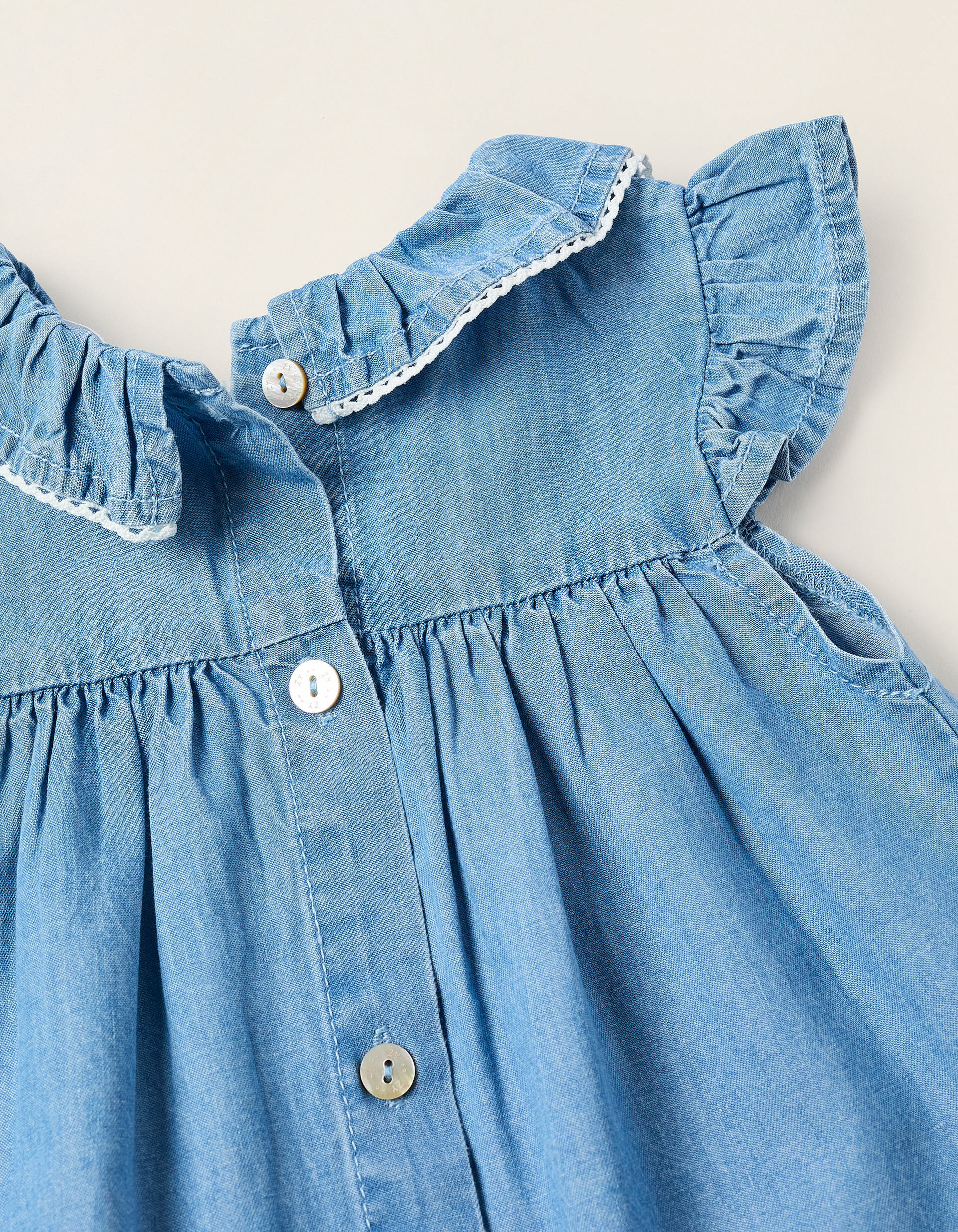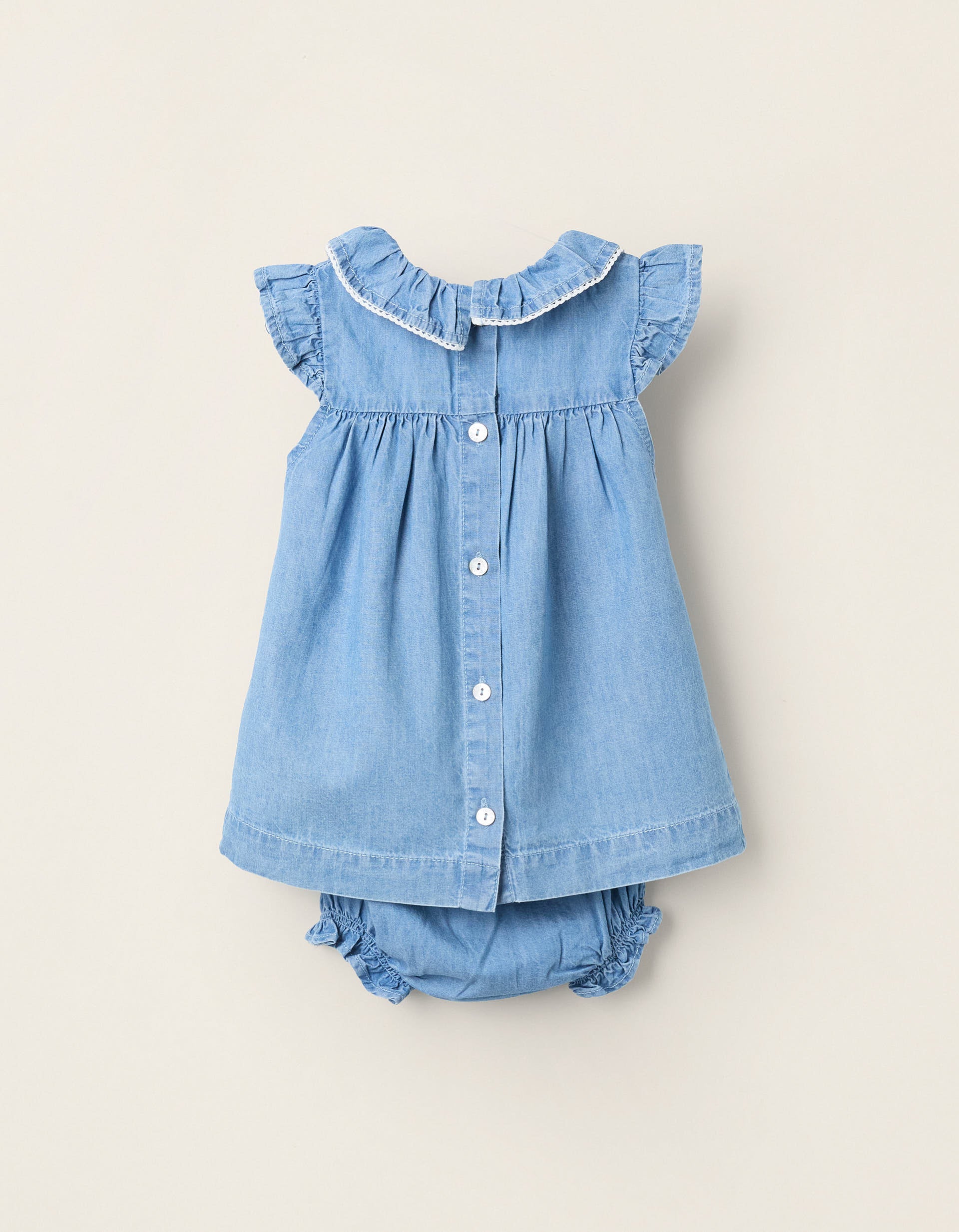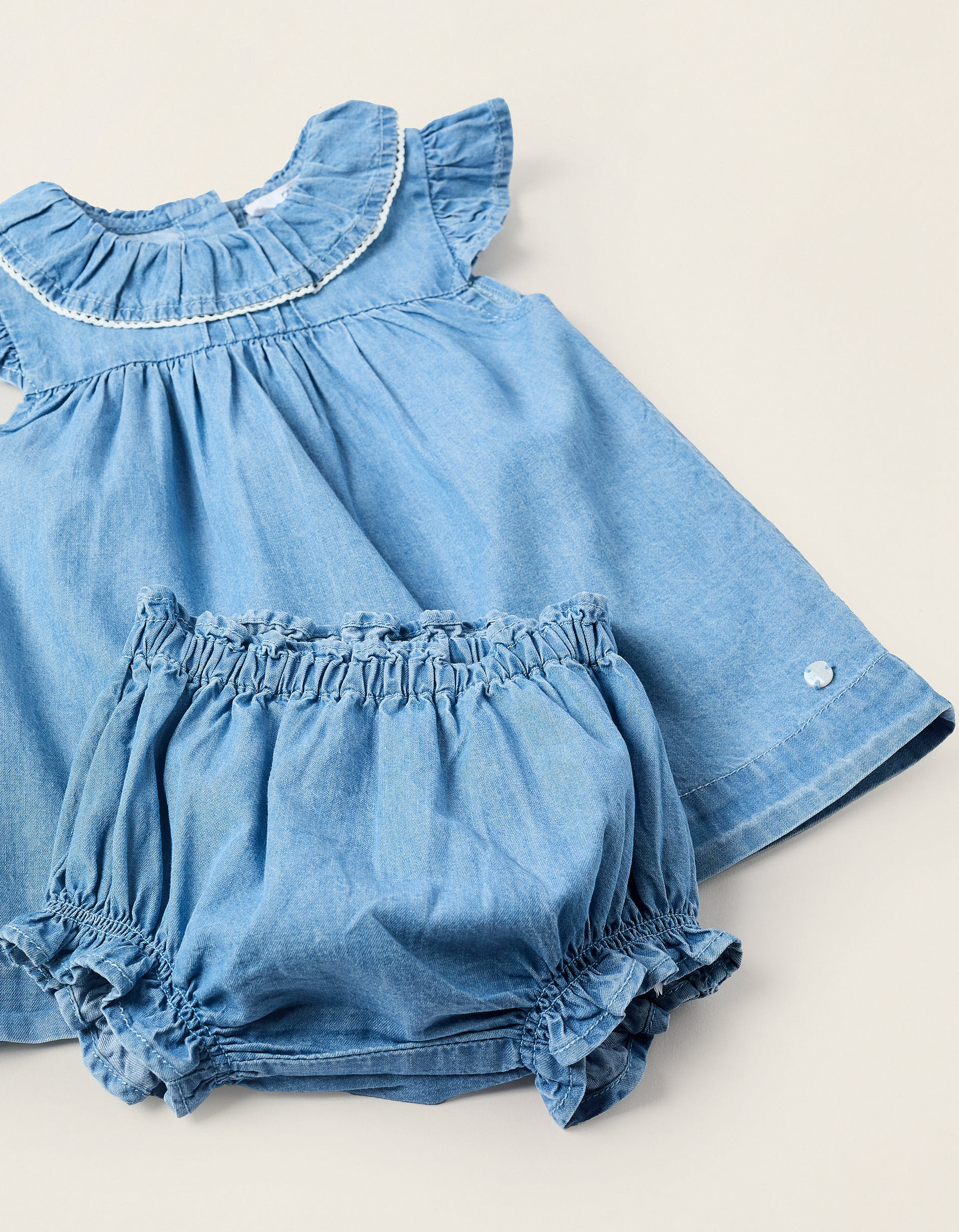 Dress + Bloomers in Denim with Ruffles for Newborn Girls, Blue
