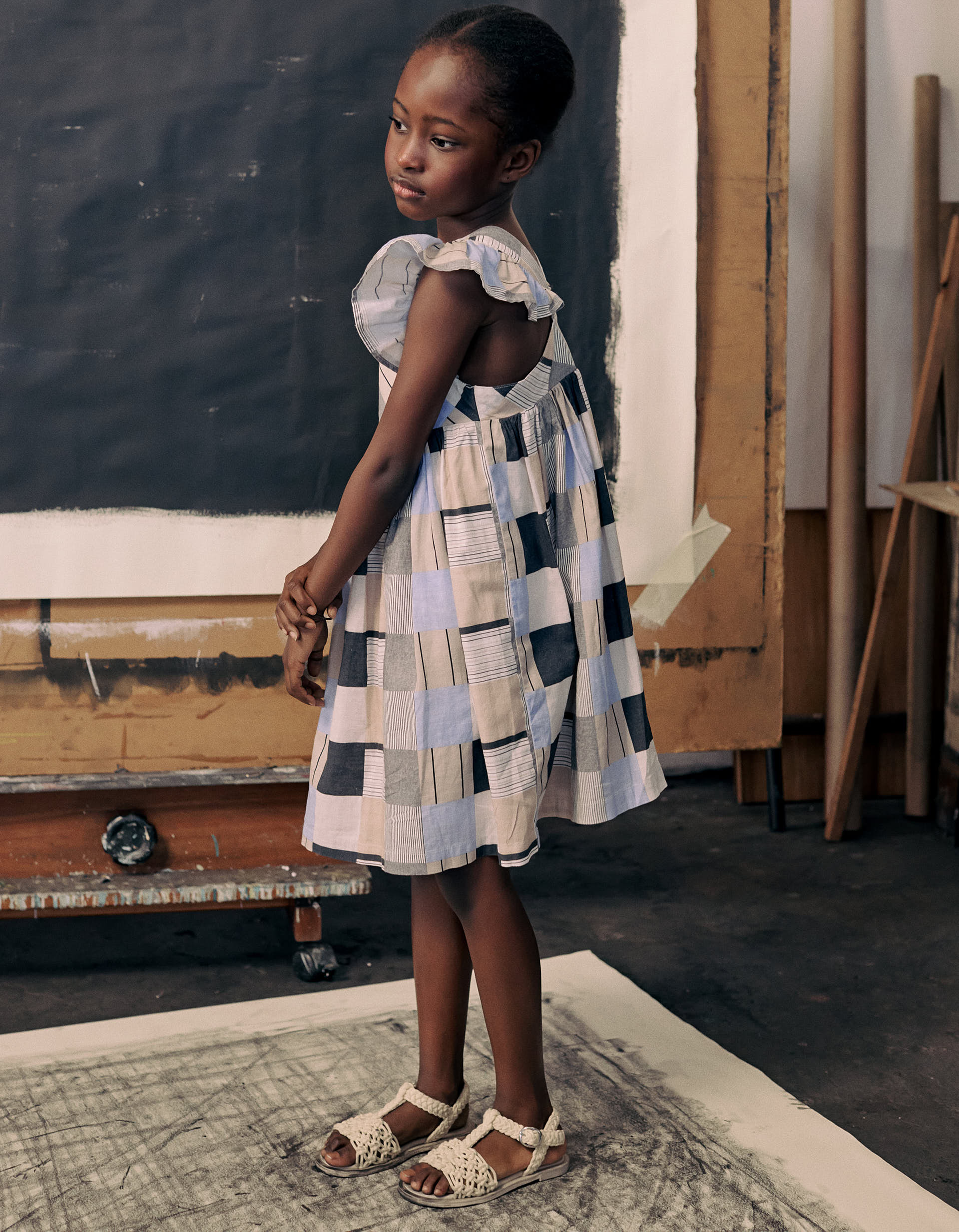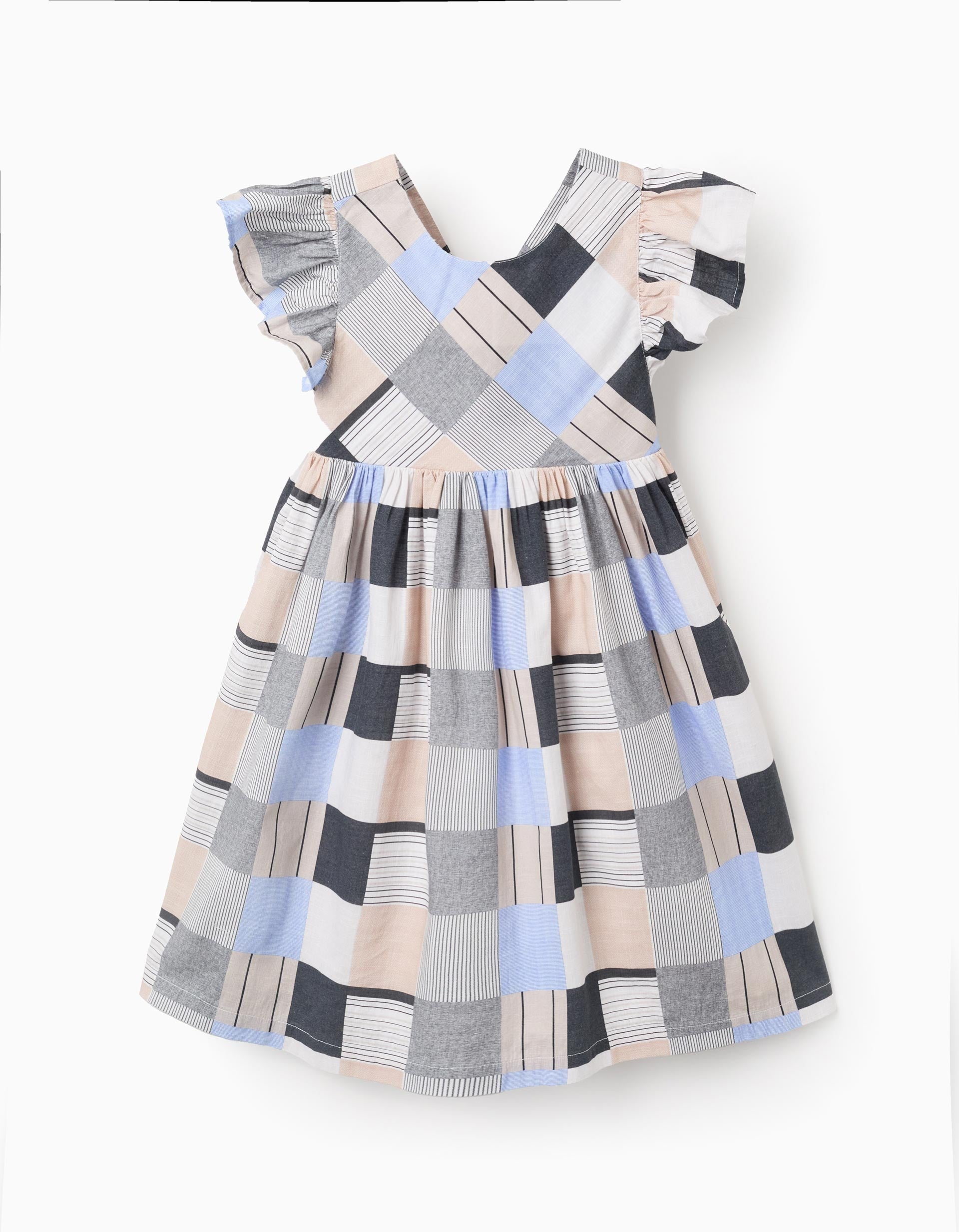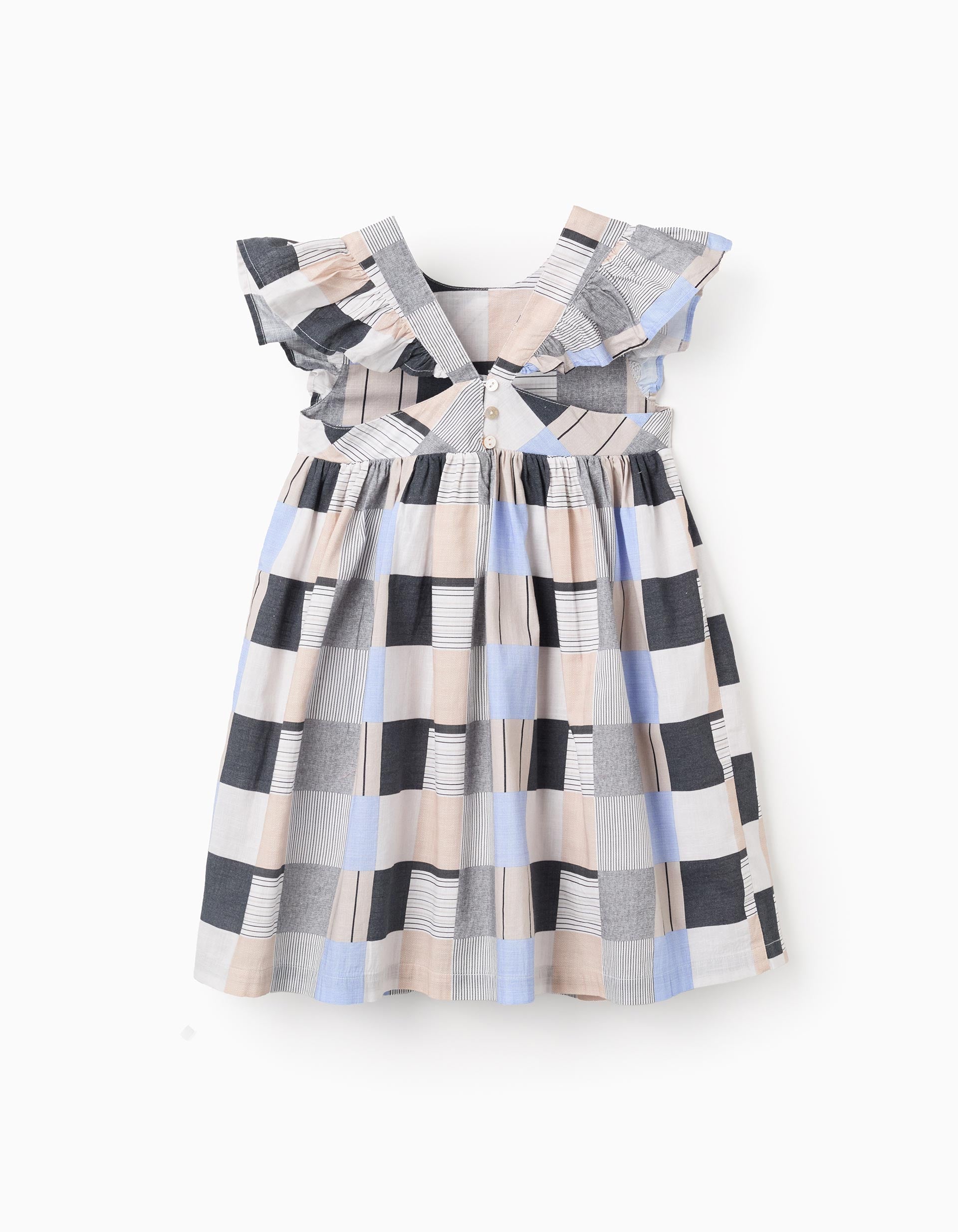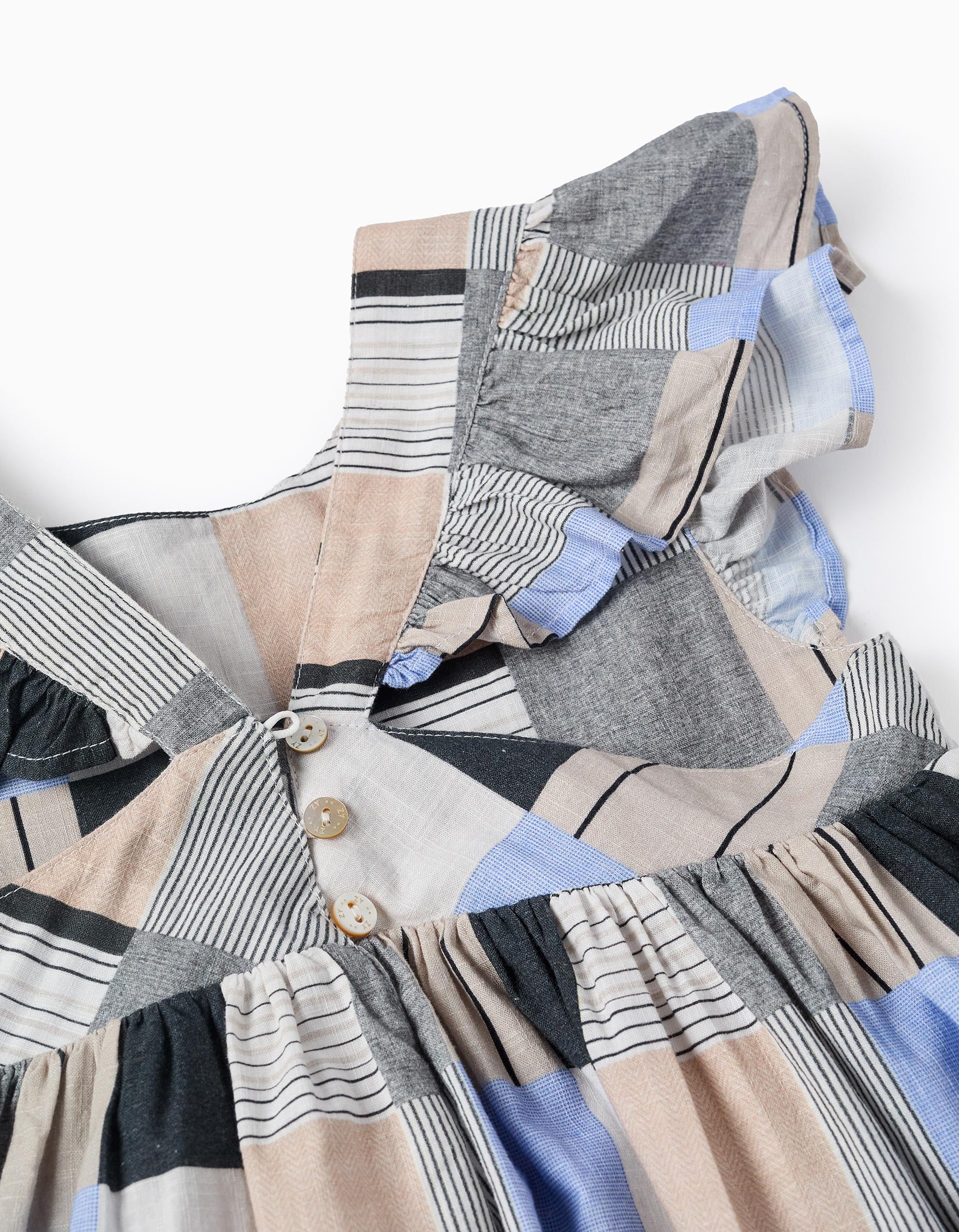 Brothers & Sisters Collection. Original pattern dress in shades of beige, grey, and blue for girls, 100% cotton. Round neckline and V-back, with ruffles on the shoulders. Buttons at the back. Gathered waist. With lining for added volume. A classic and elegant option to combine with other items from the same collection!