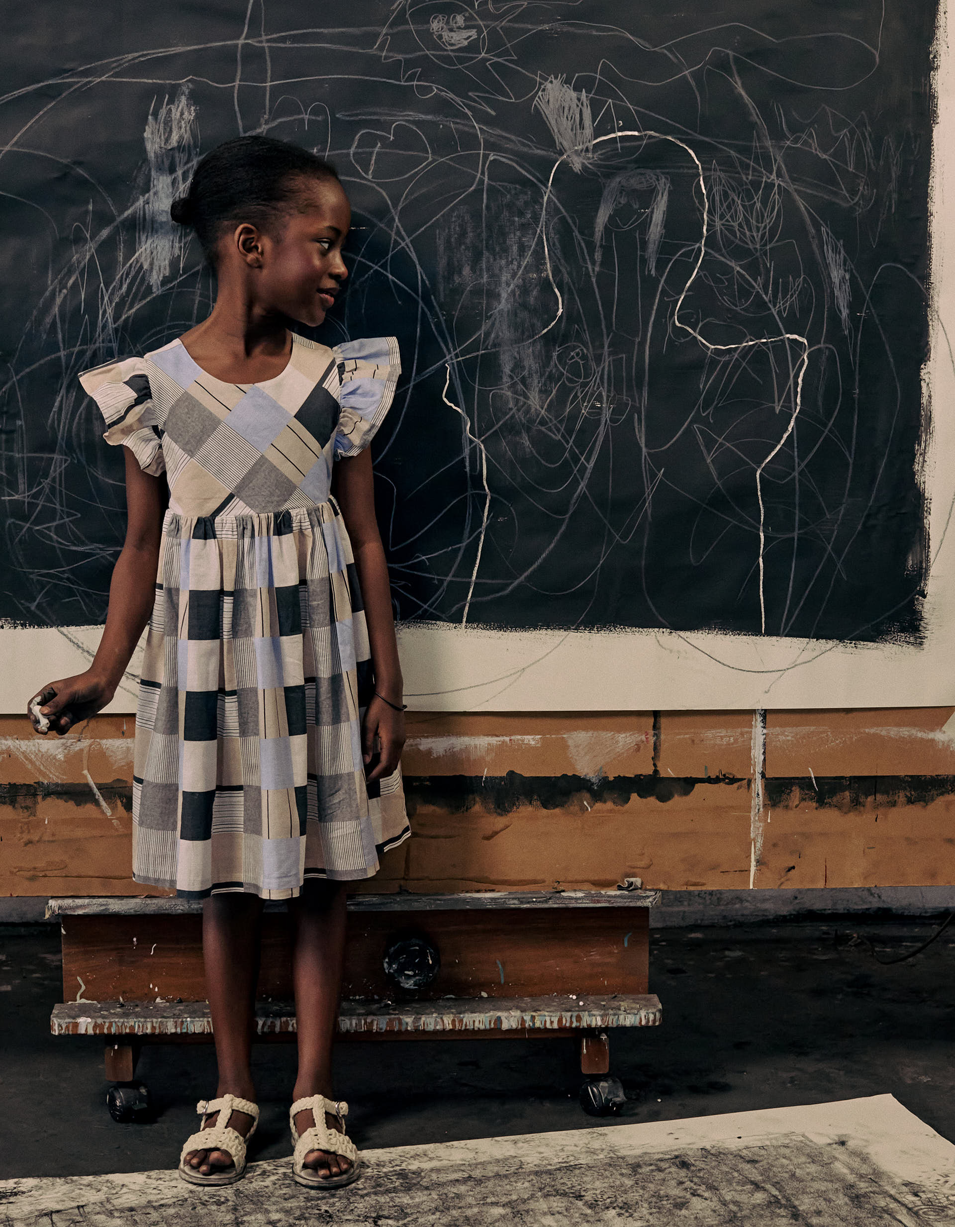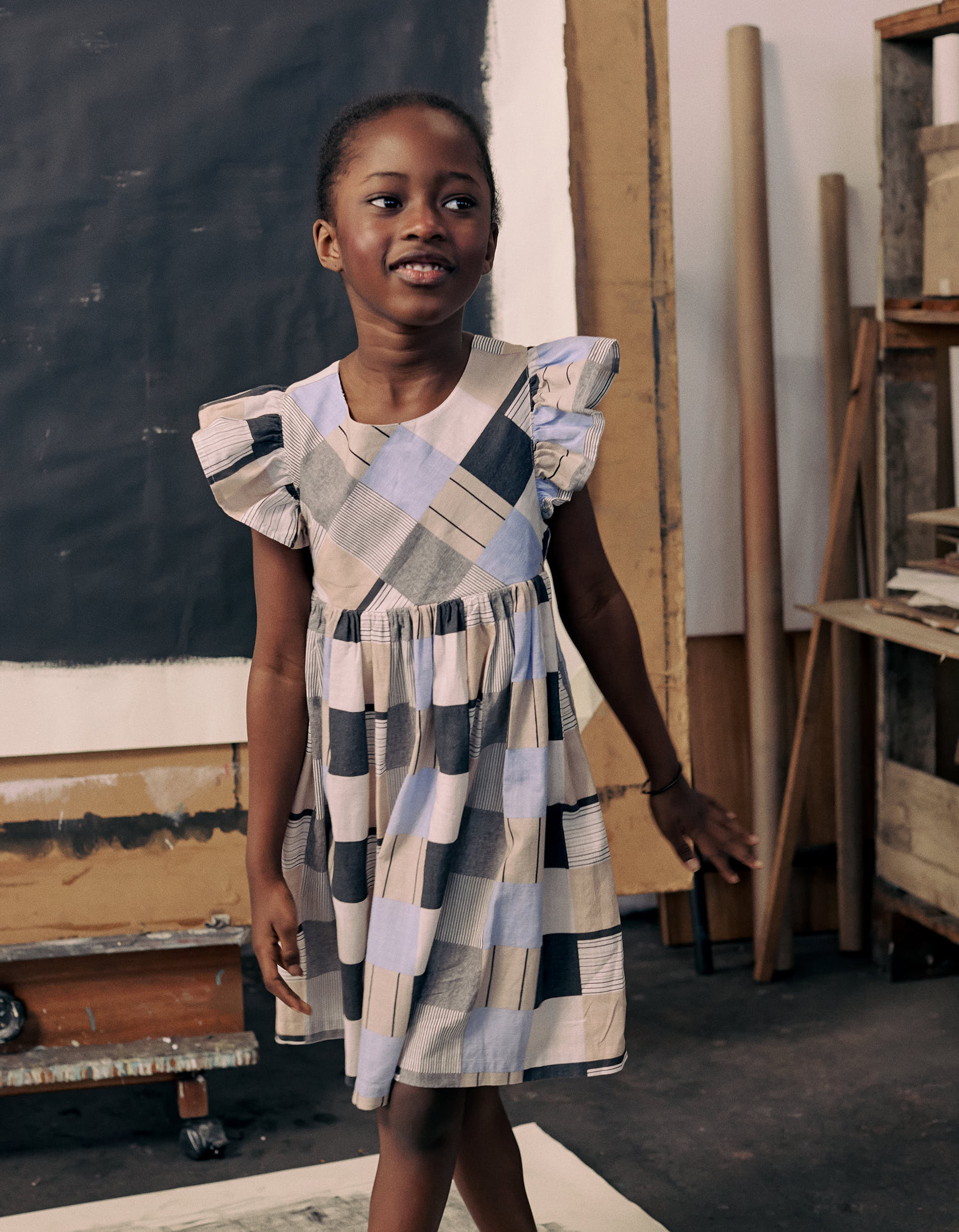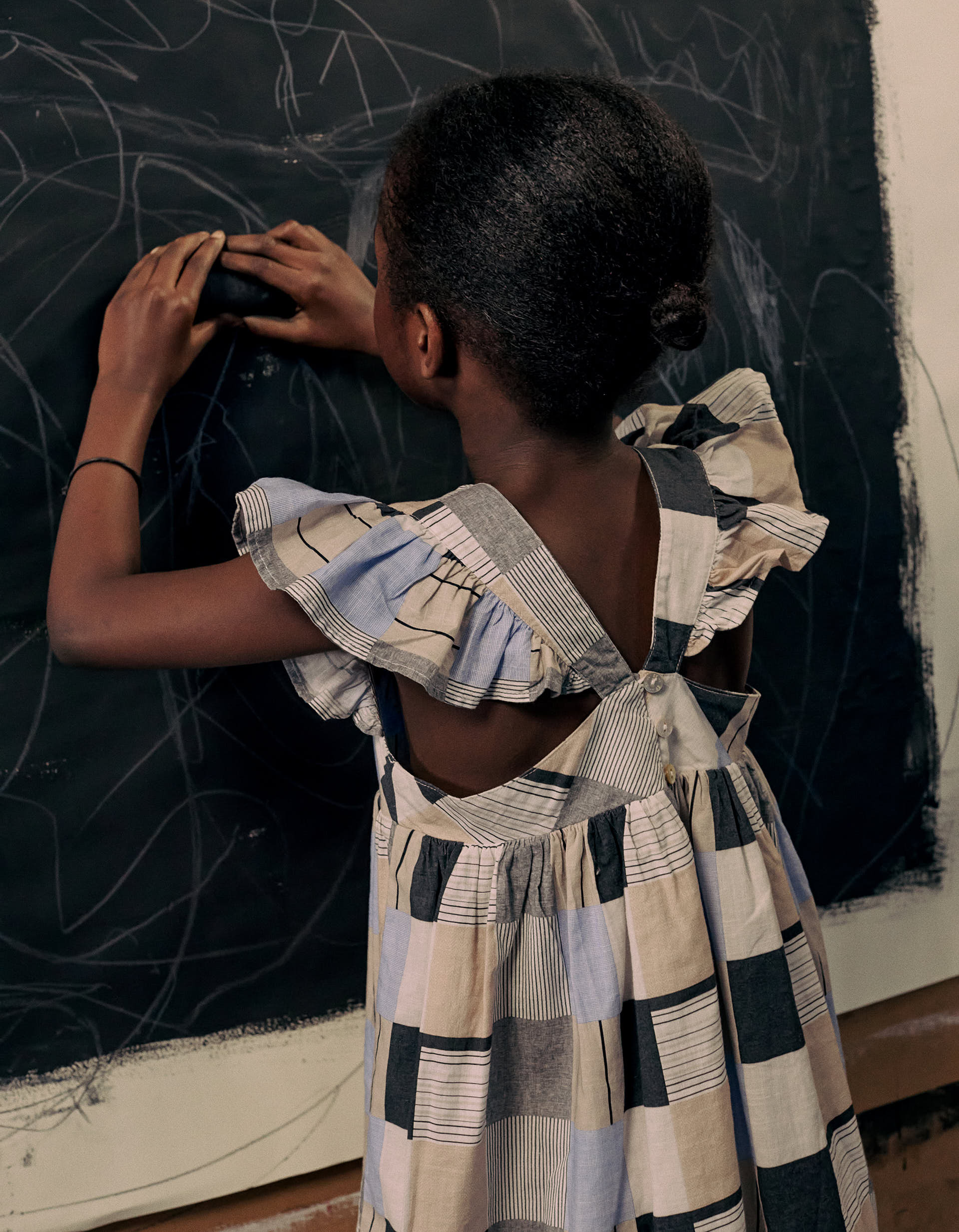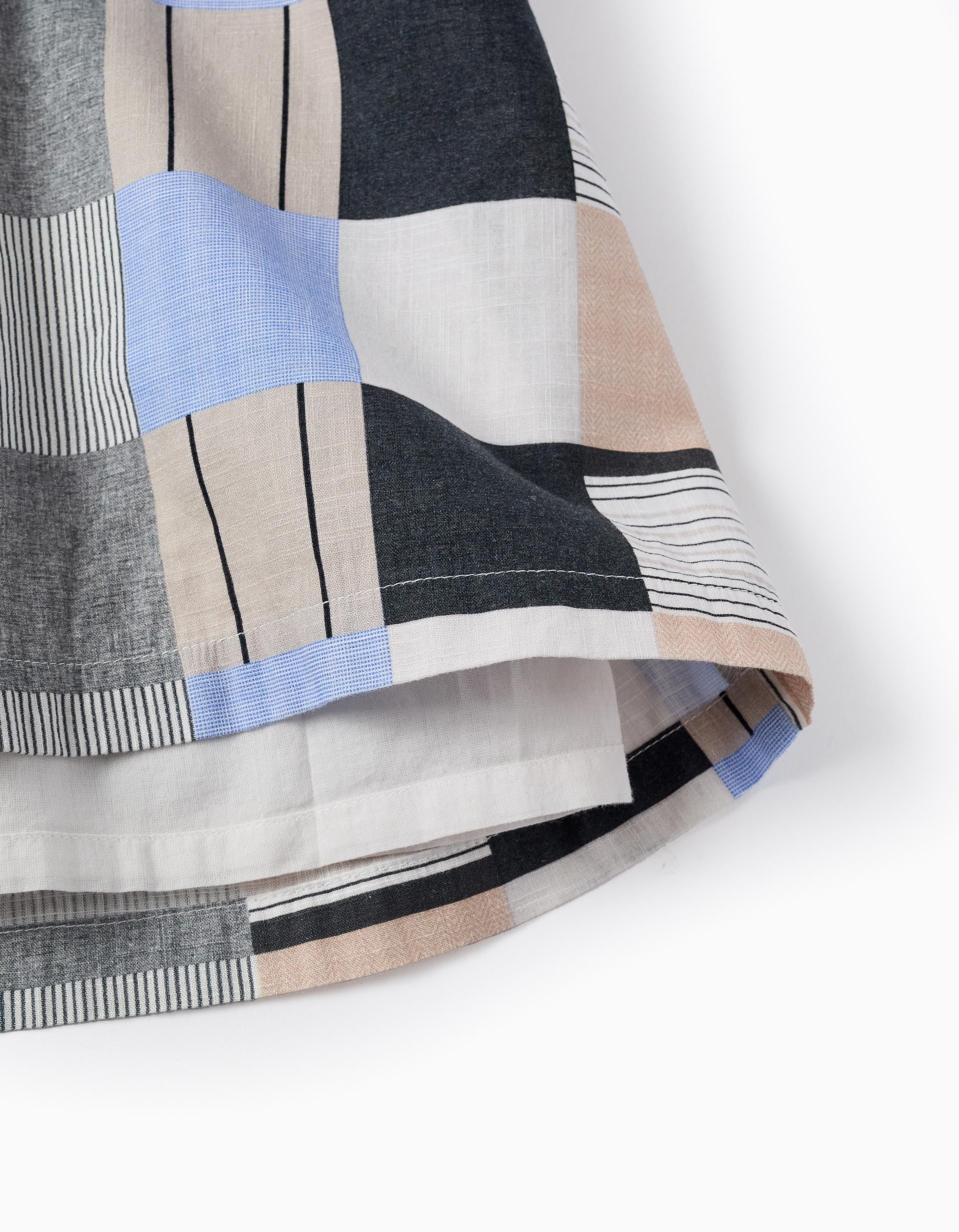 Brothers & Sisters Collection. Original pattern dress in shades of beige, grey, and blue for girls, 100% cotton. Round neckline and V-back, with ruffles on the shoulders. Buttons at the back. Gathered waist. With lining for added volume. A classic and elegant option to combine with other items from the same collection!