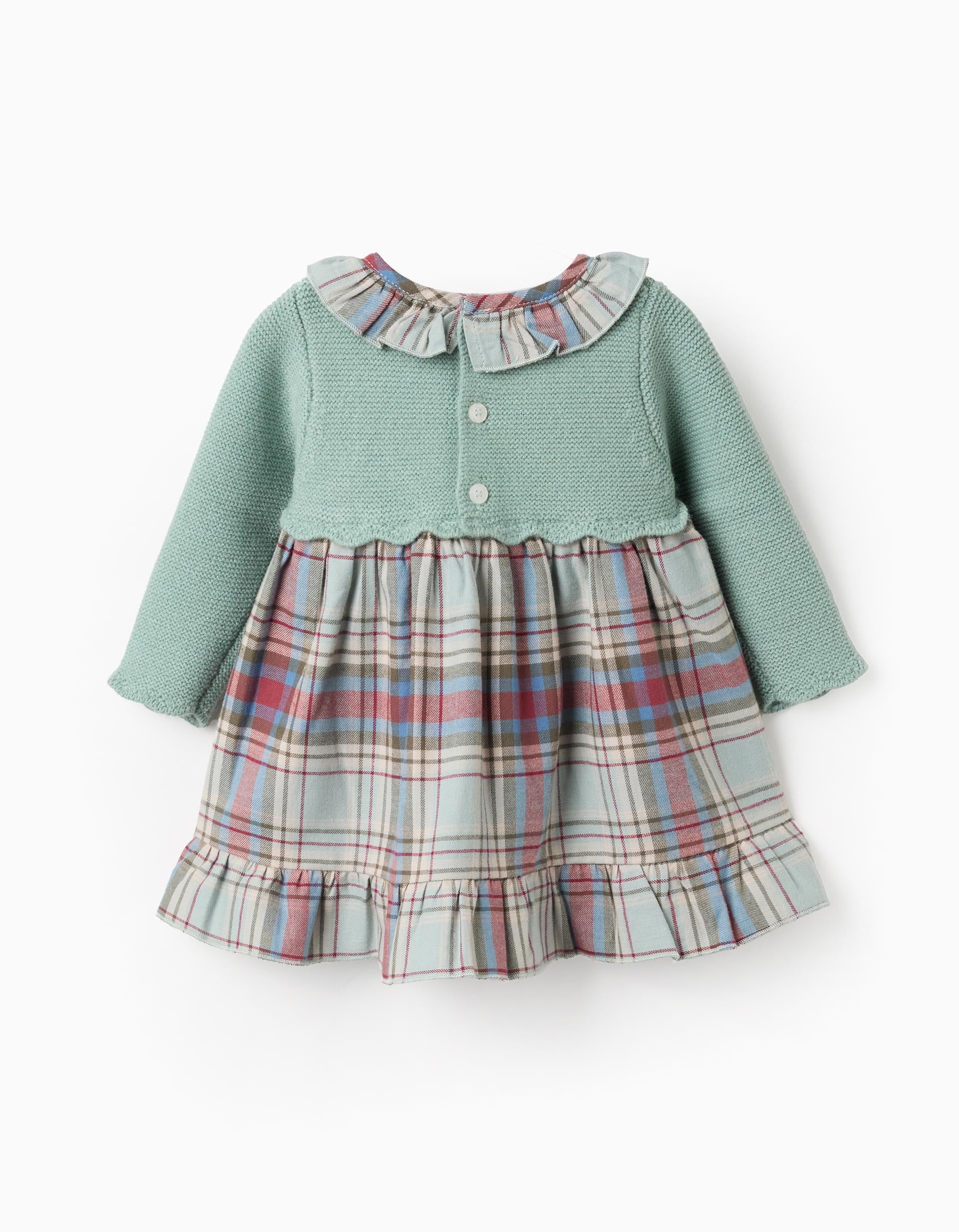 Brothers & Sisters Collection. Dual-fabric dress for newborn girls. Soft and cosy green knitted top. Collar and lower part in 100% cotton fabric with check in shades of green, red and blue. With frills. Fastens at the back with buttons for easy dressing. An original check to wear as a family.