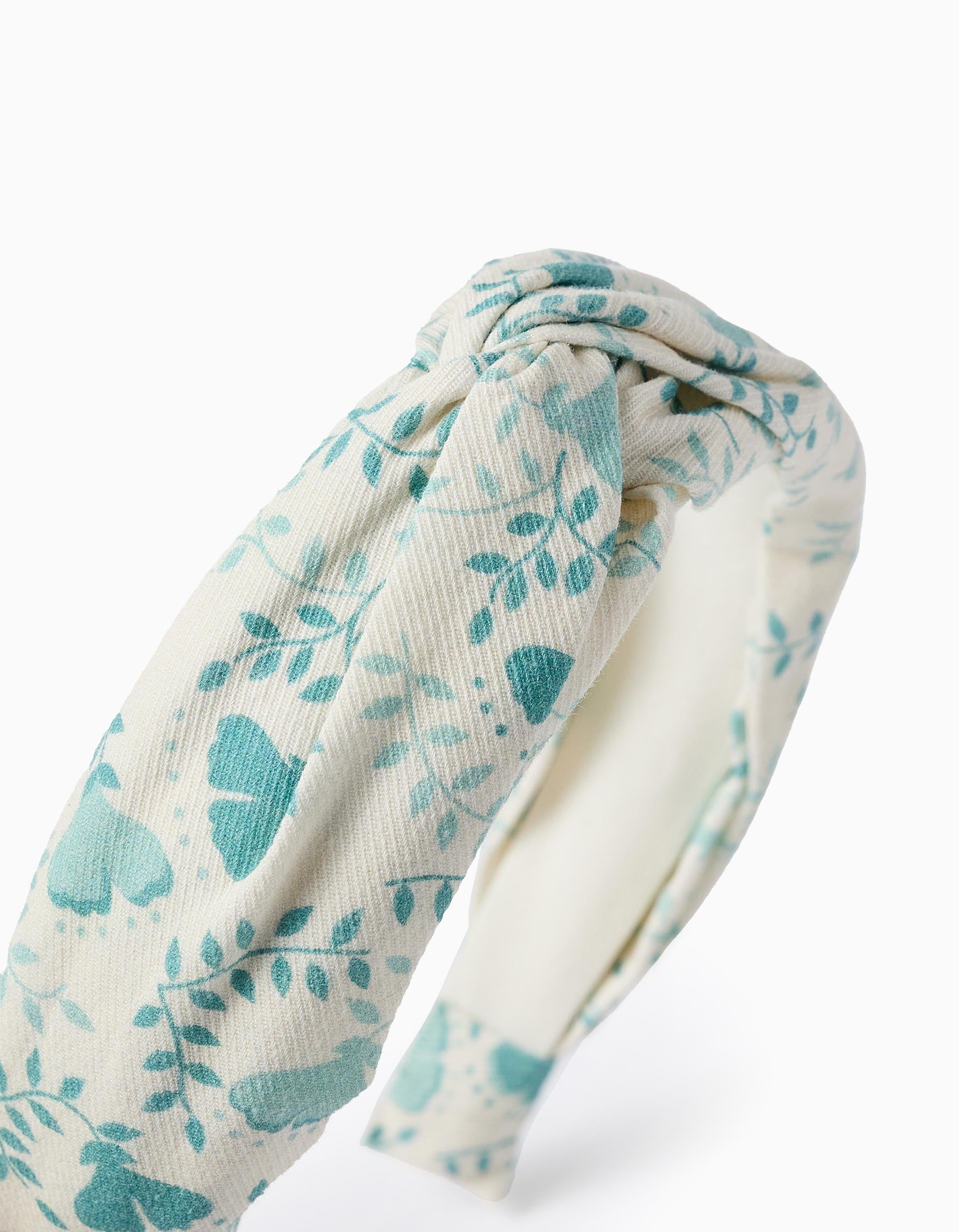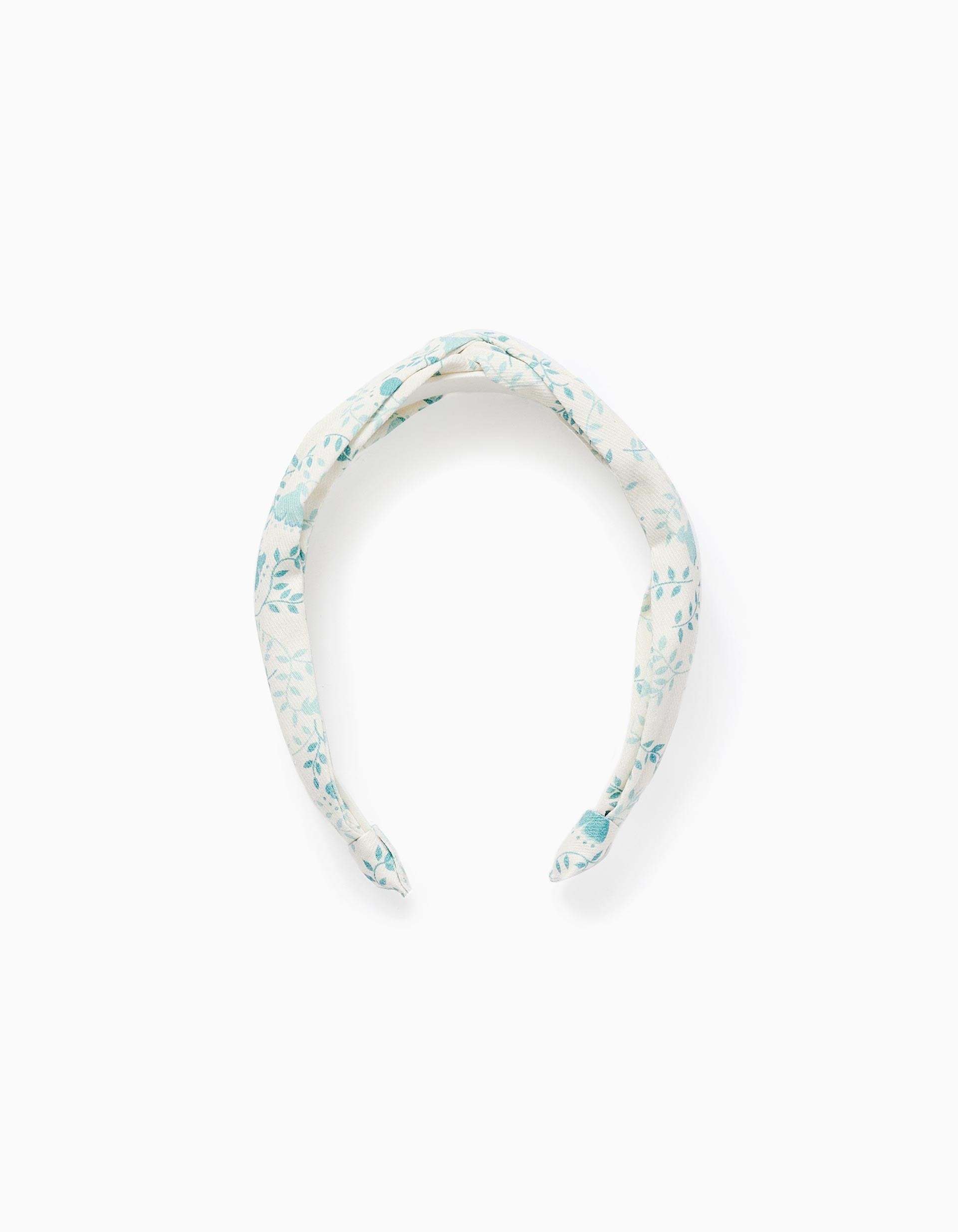 White fabric-covered headband with aqua green floral pattern for babies and girls. Decorative knot on top. A versatile and stylish accessory!