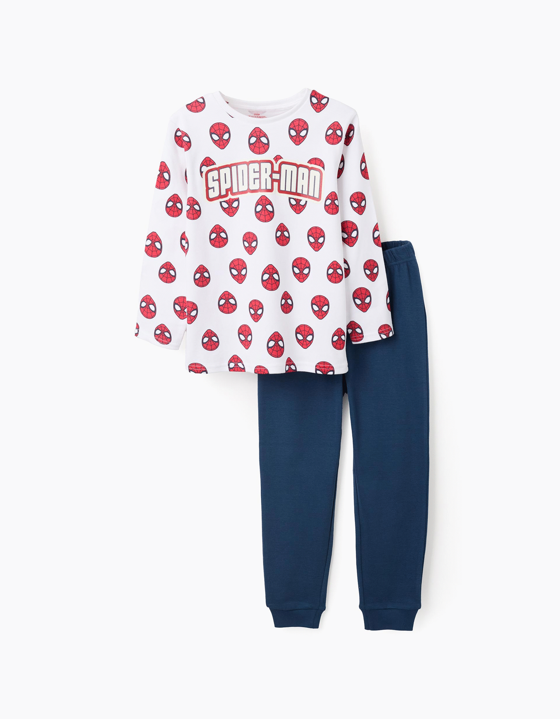 White and blue cotton pyjamas for boys, 100% cotton. White top with Spider-Man motif and glow-in-the-dark lettering. Plain trousers with fitted hems. The perfect mid-season pyjamas!