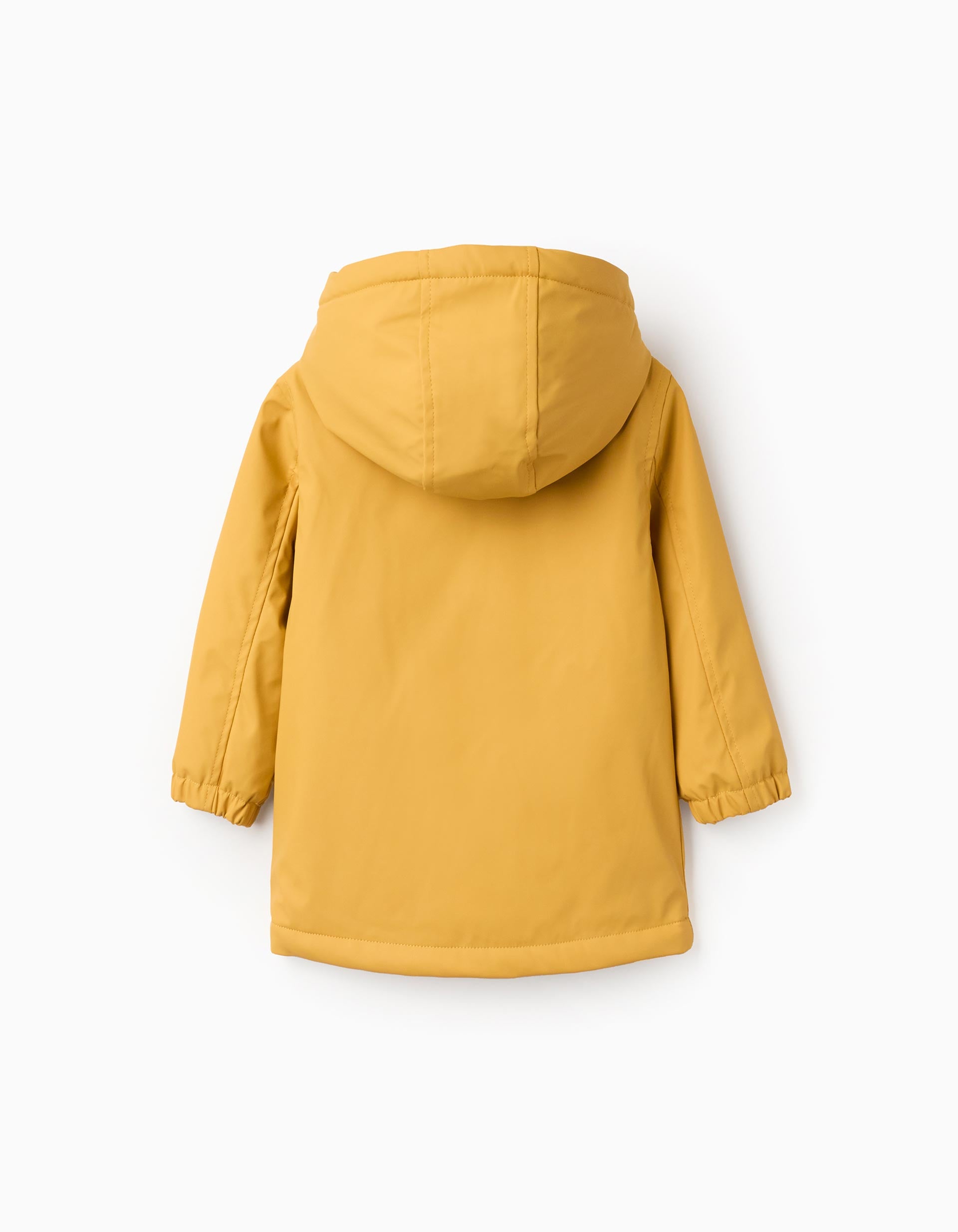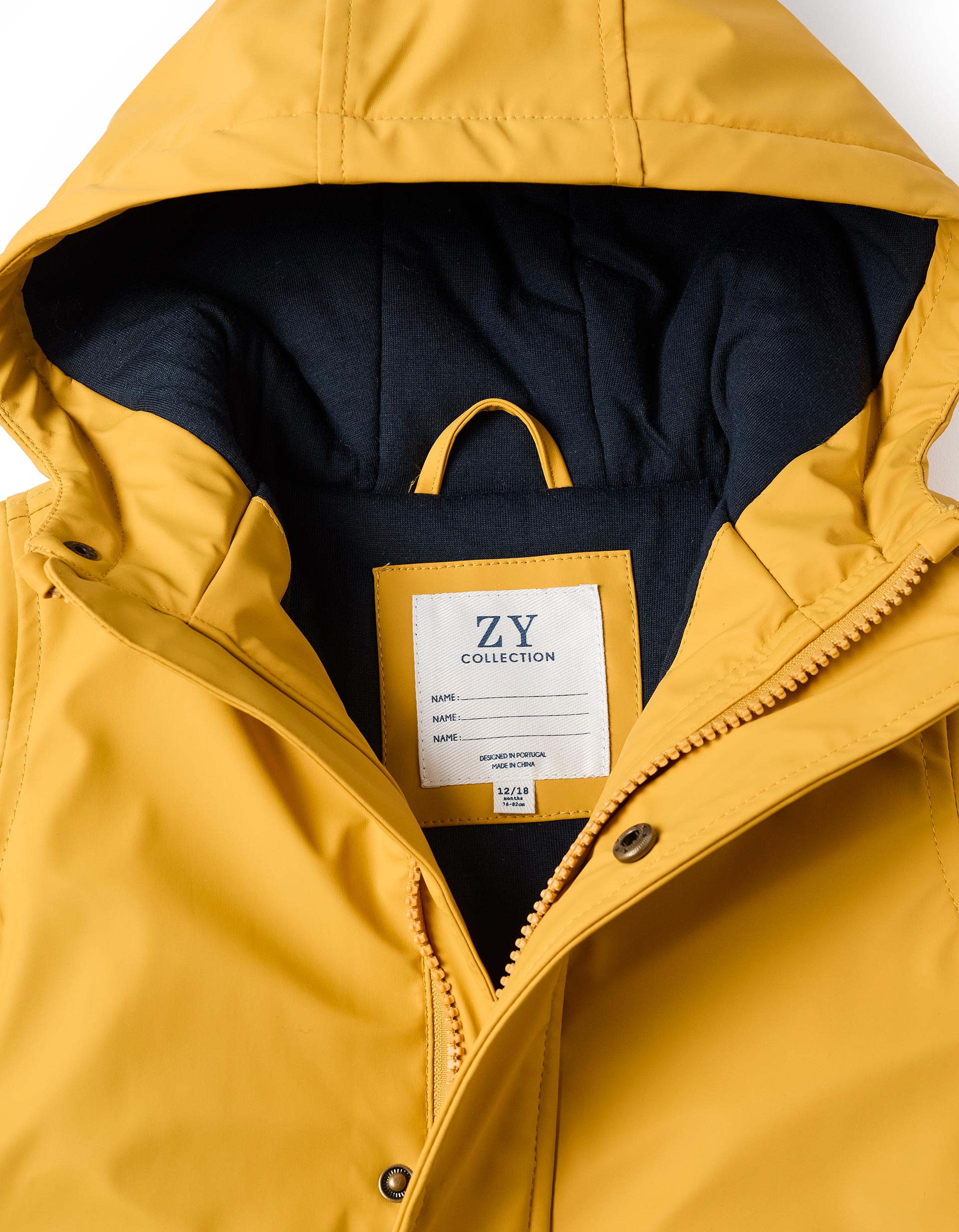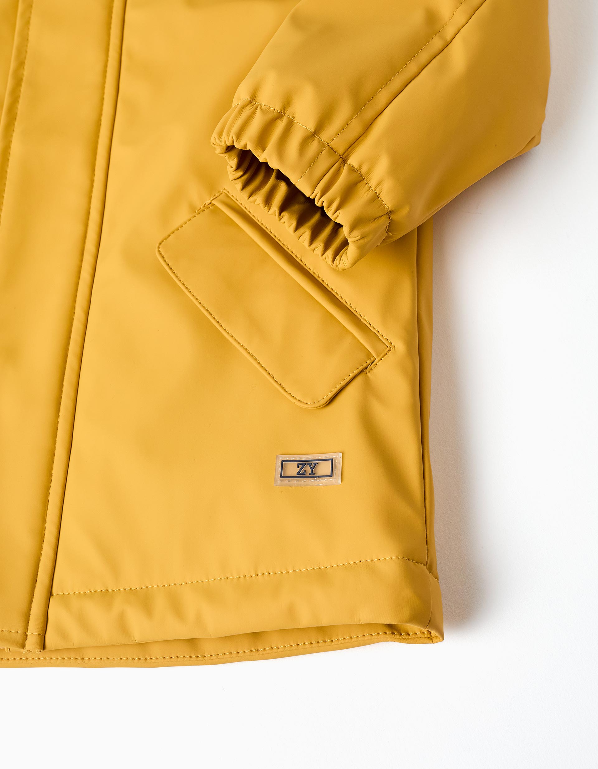 Mustard yellow rubber parka for baby boys, with hood. Side pockets with flap. Dark blue jersey lining. Easy fastening with zip and snap buttons. Elastic cuffs. Inner label to write the child's name. We Care: the filling of this piece is made of recycled polyester. The ideal jacket for rainy days.