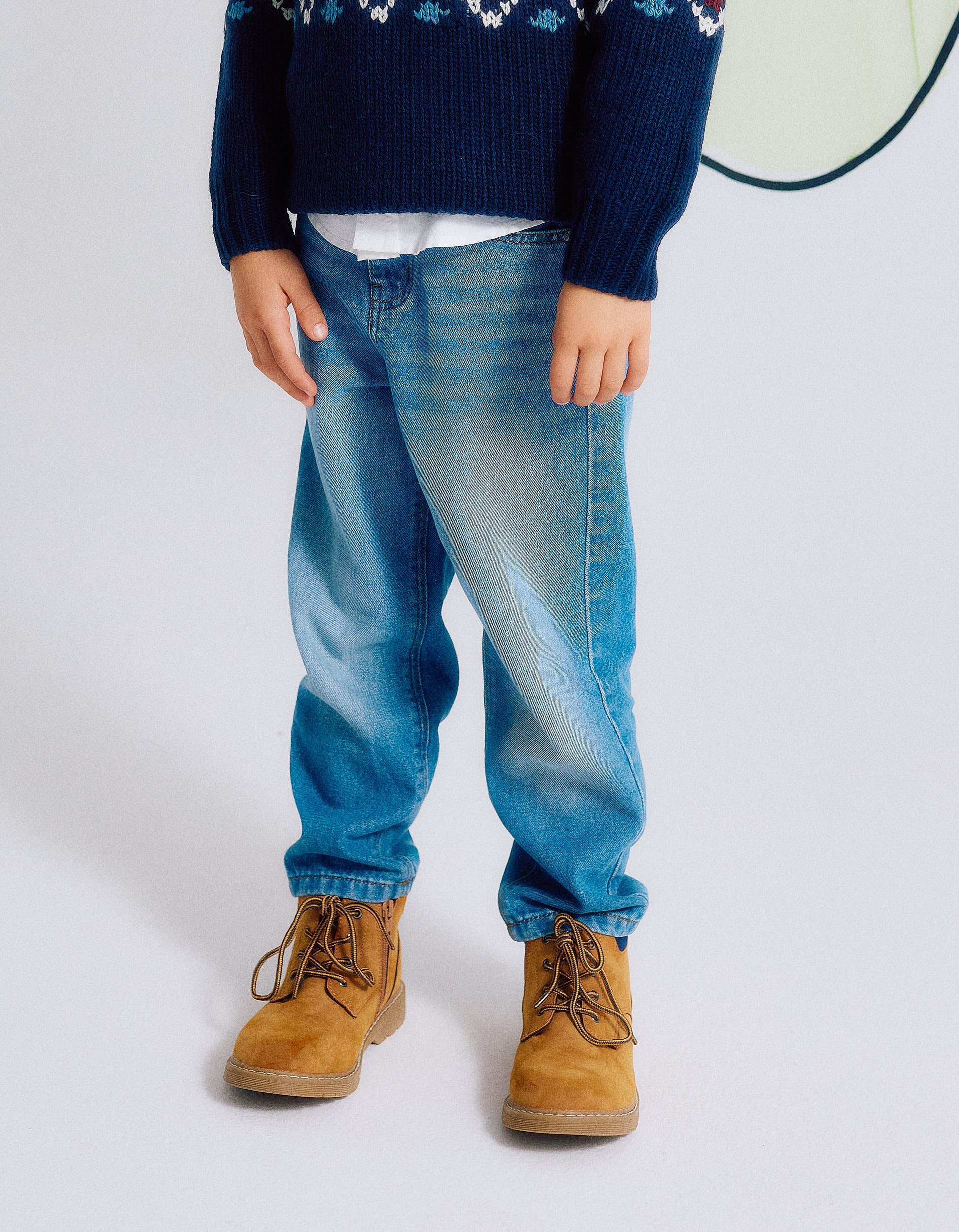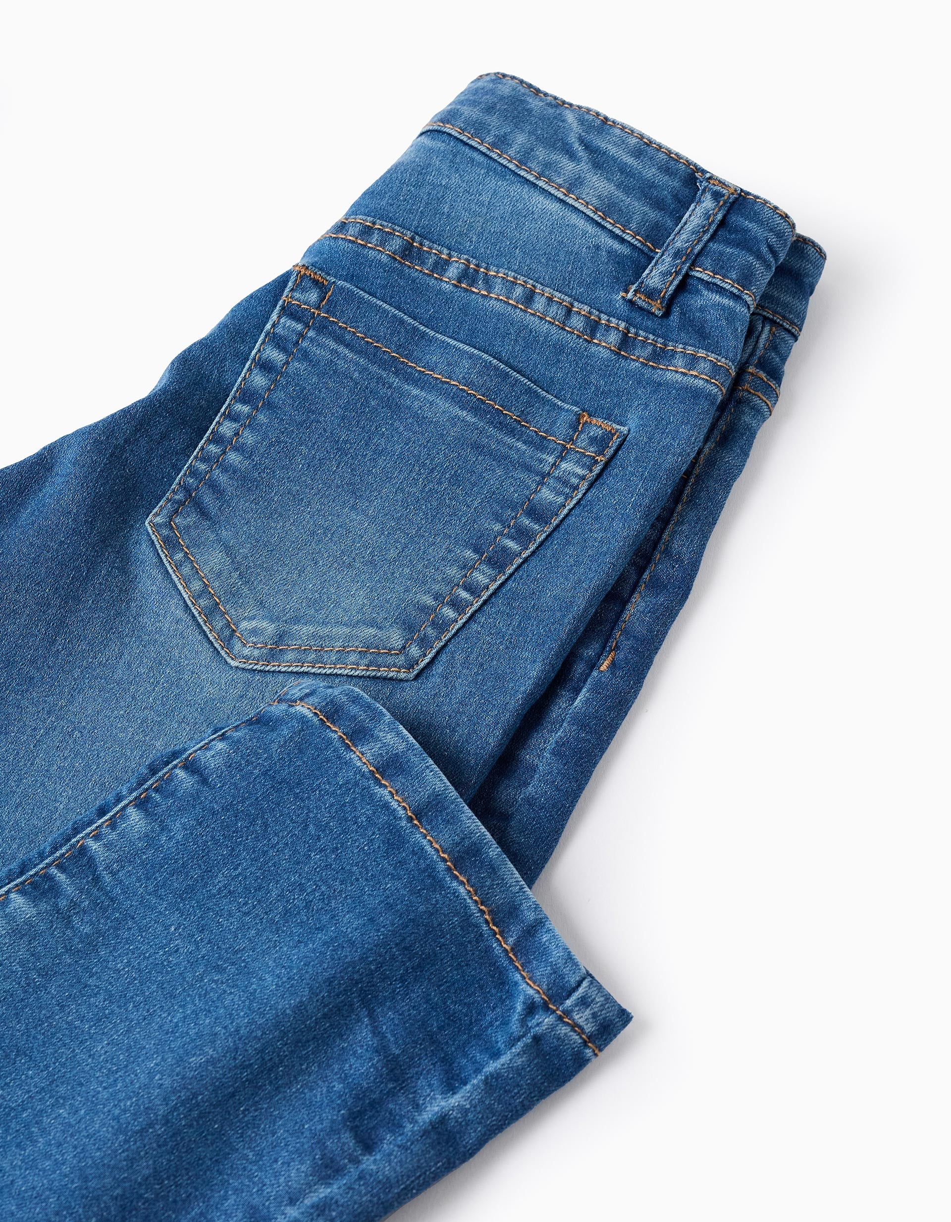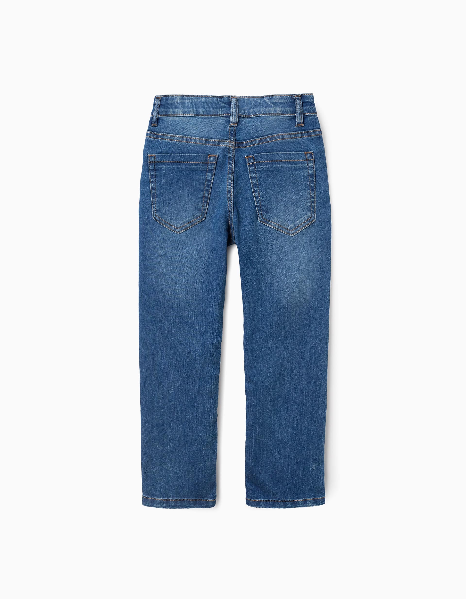 Blue denim jeans for boys, in cotton denim with a touch of stretch for added comfort and freedom of movement. Straight fit. Five pockets. Adjustable waist on the inside with elastics and buttons.