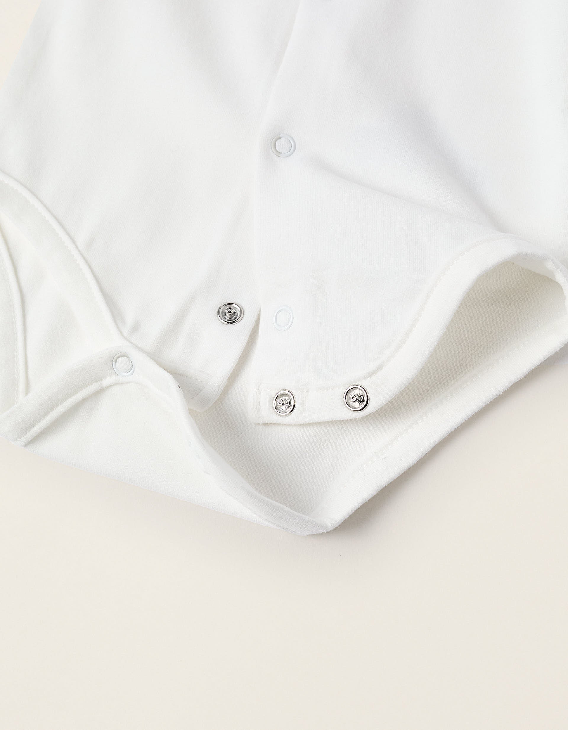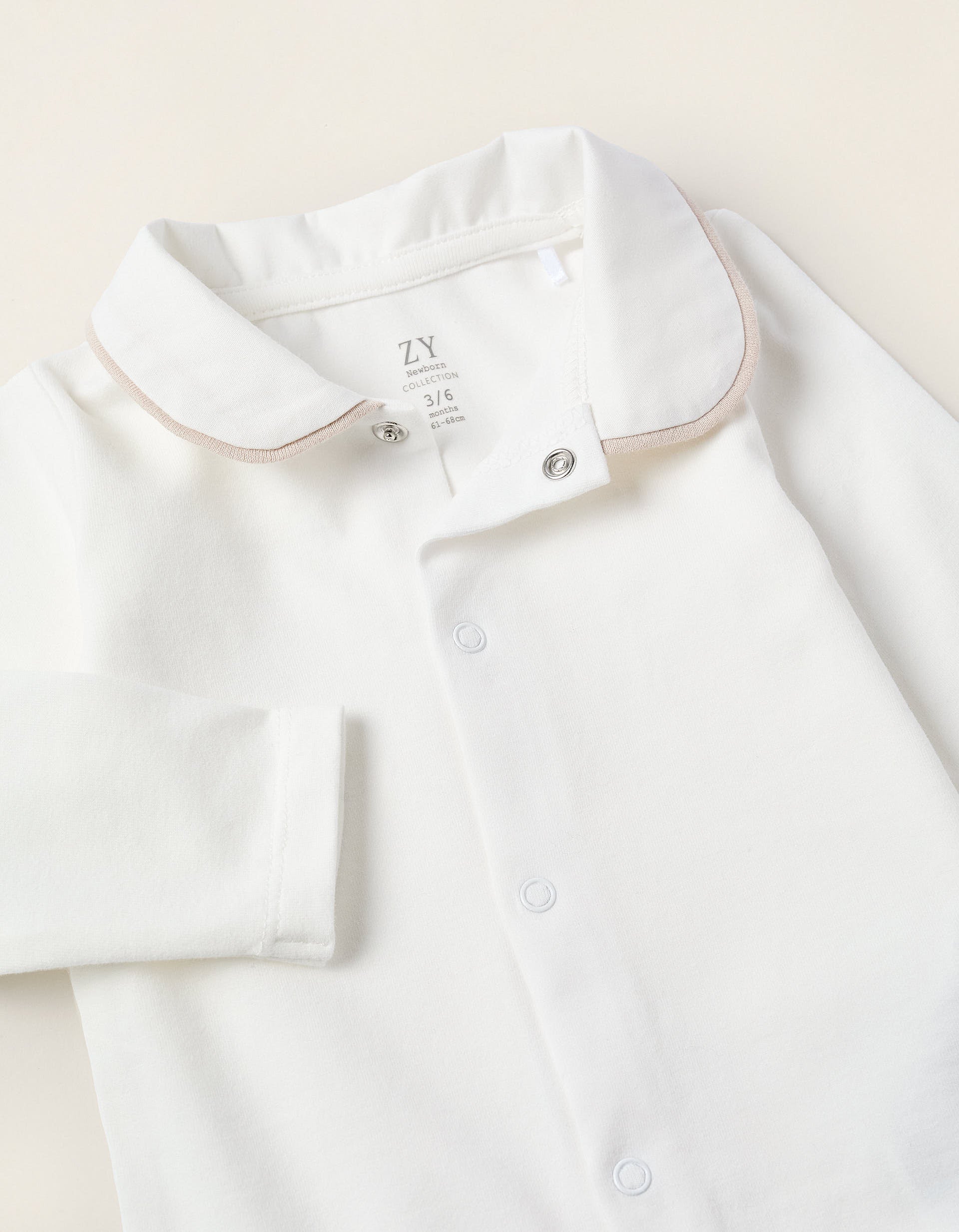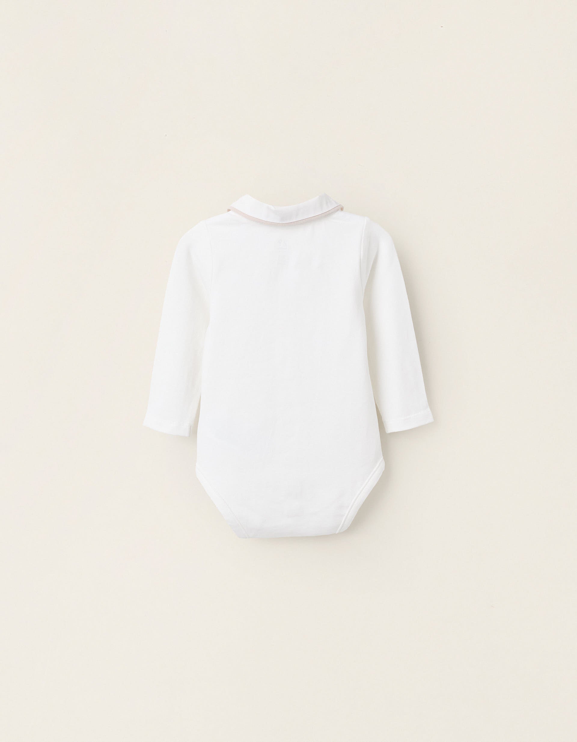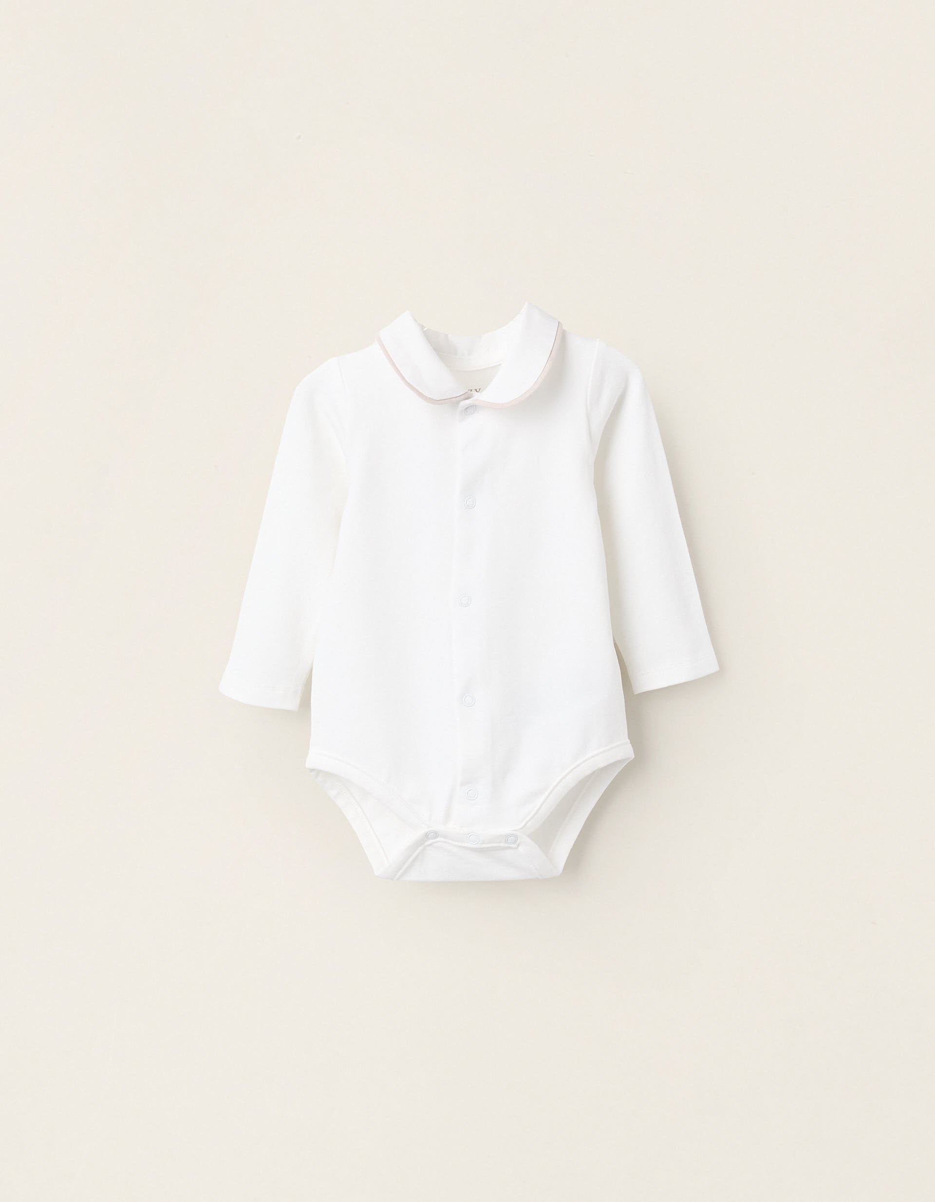 Bodysuit-shirt for newborns, made from cotton jersey with a touch of stretch for greater comfort and freedom of movement. Peter Pan collar with trim. Press studs at the front and crotch for easy dressing. Printed inner label to avoid irritating the skin. A lovely option with a traditional touch.
