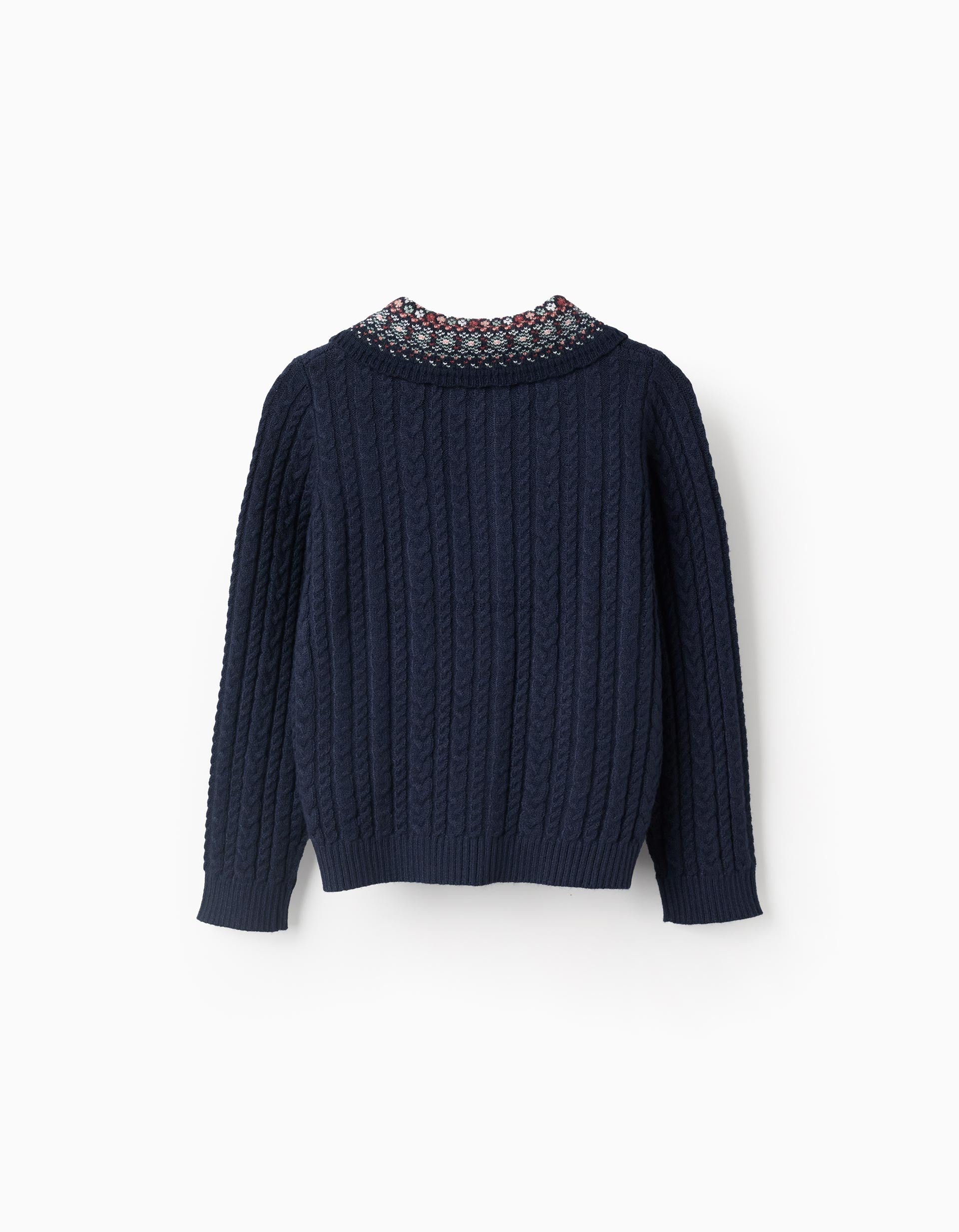 Knitted Cardigan with Floral Collar for Girls, Dark Blue
