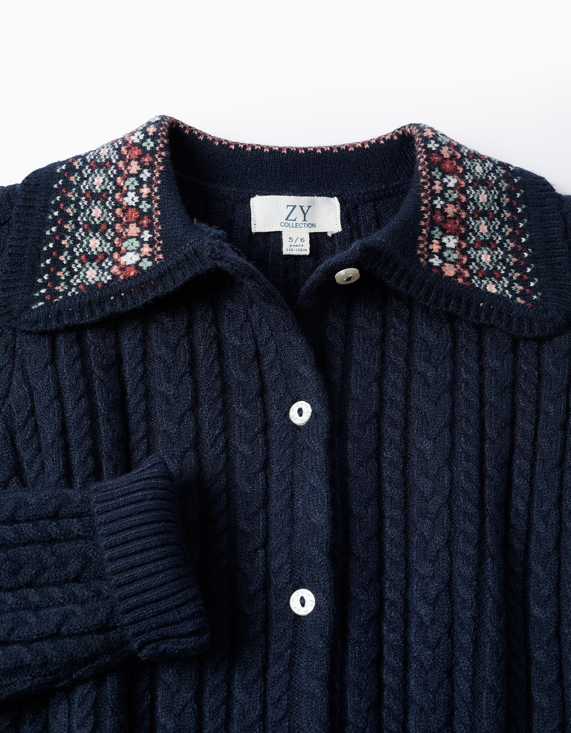 Dark blue knitted cardigan for girls. Peter Pan collar with floral jacquard in shades of pink, white and green. Imitation mother-of-pearl buttons. Ribbed edges for a perfect fit. A soft and comfortable option with a traditional touch.