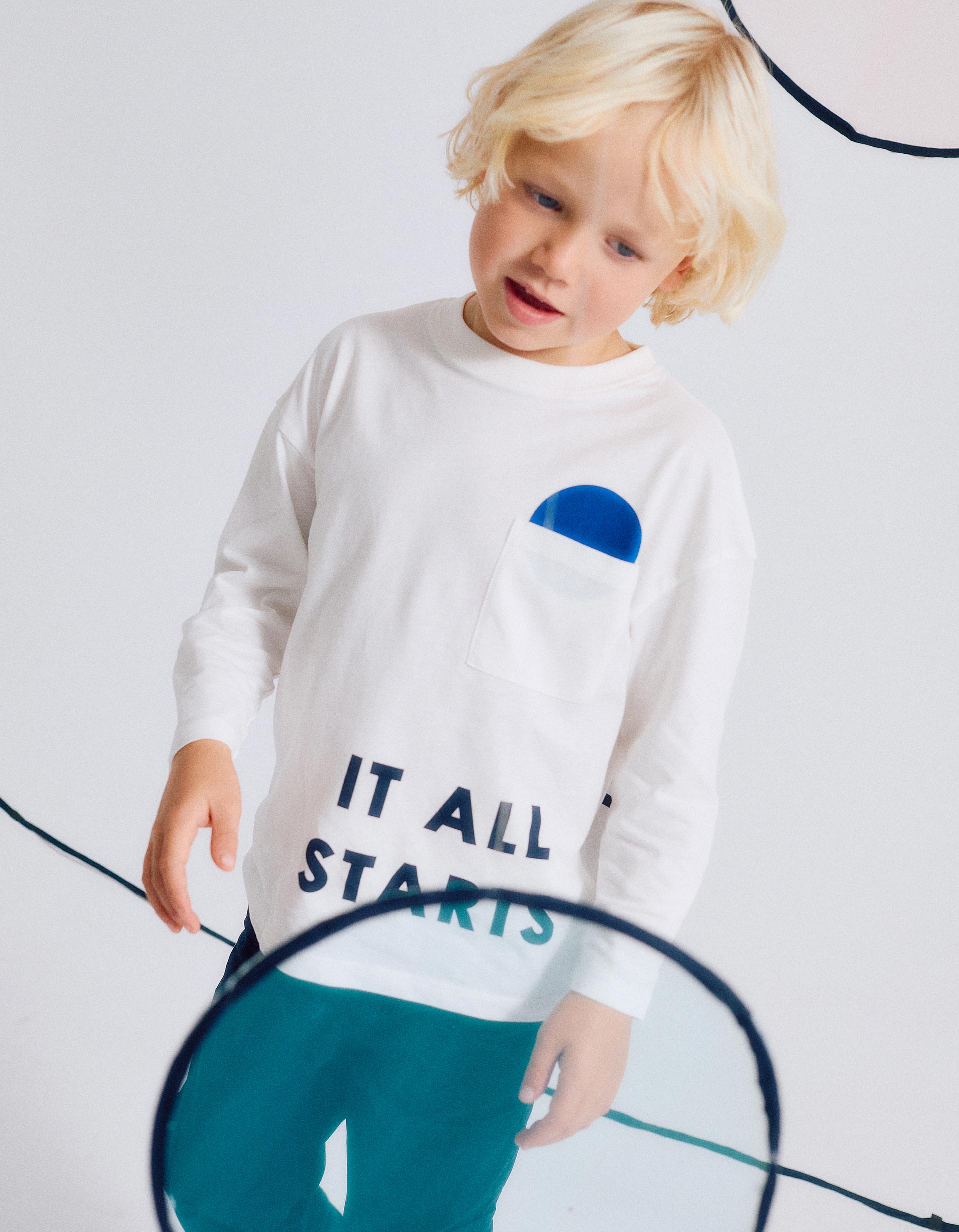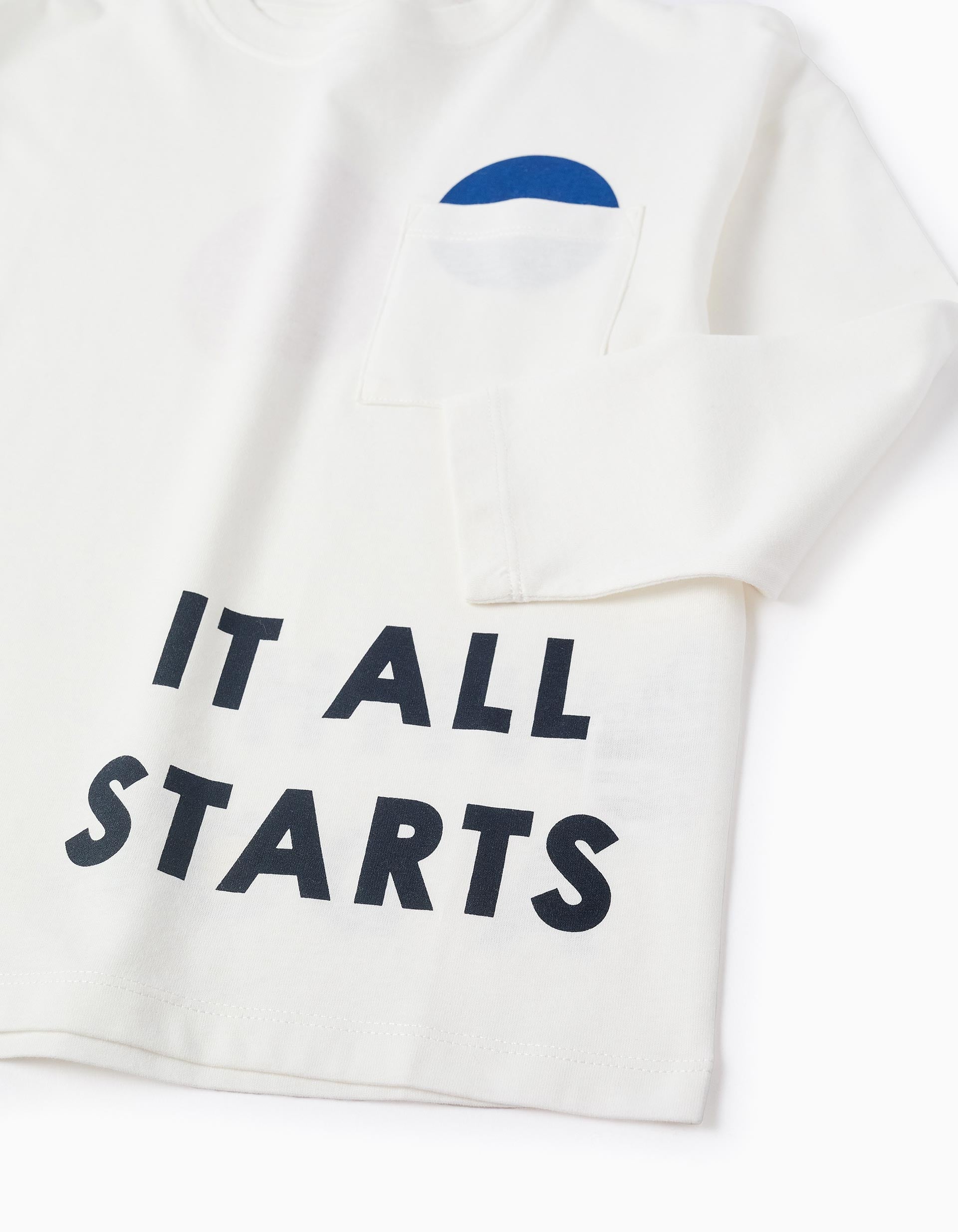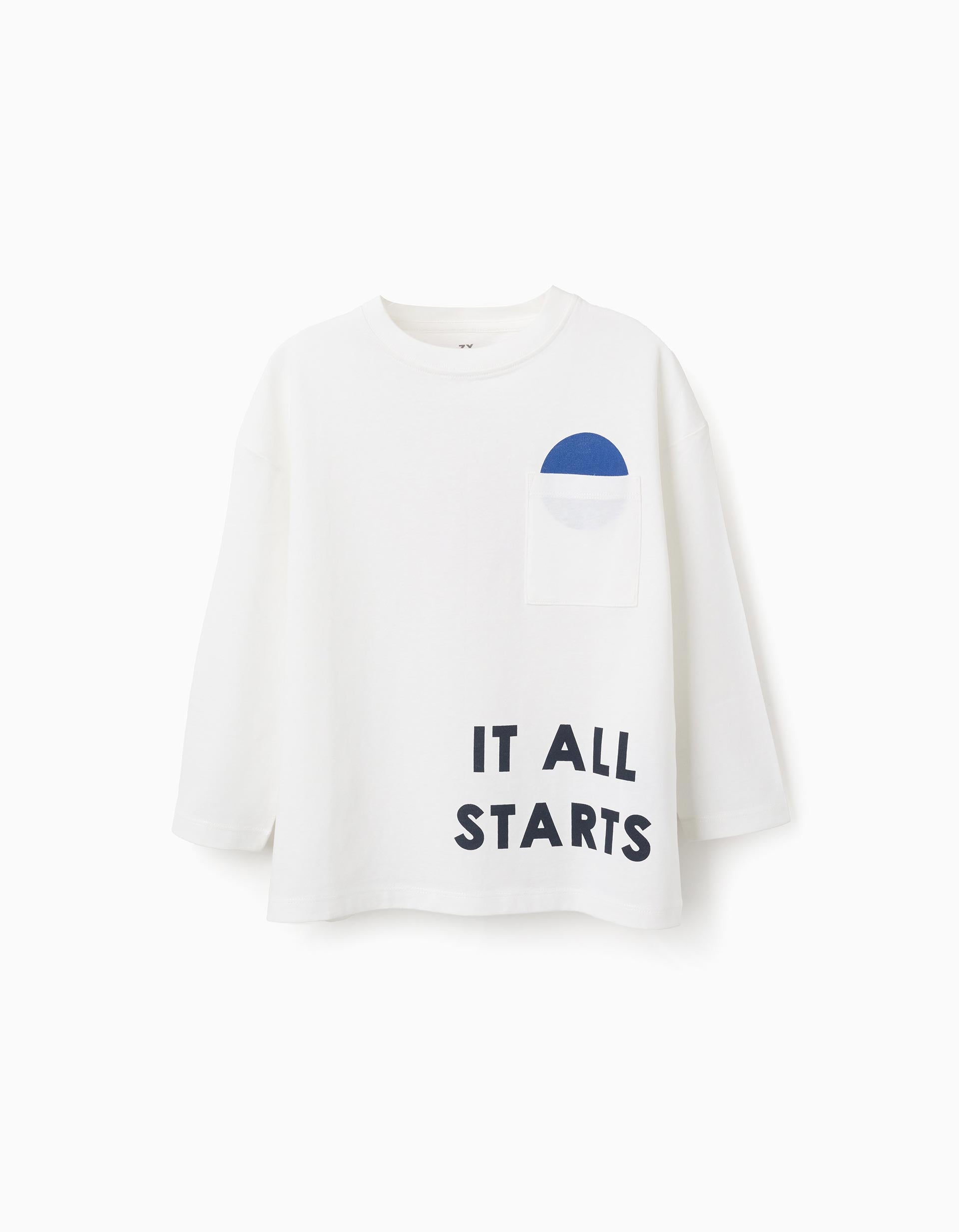 White long-sleeved T-shirt for boys, 100% cotton. Pocket on the chest. Prints on the front and back. Printed inner label to avoid irritating the skin. An original T-shirt for unique looks! We Care: item with Oeko-Tex Standard 100 certification, which guarantees the absence of harmful or irritating substances for the skin.